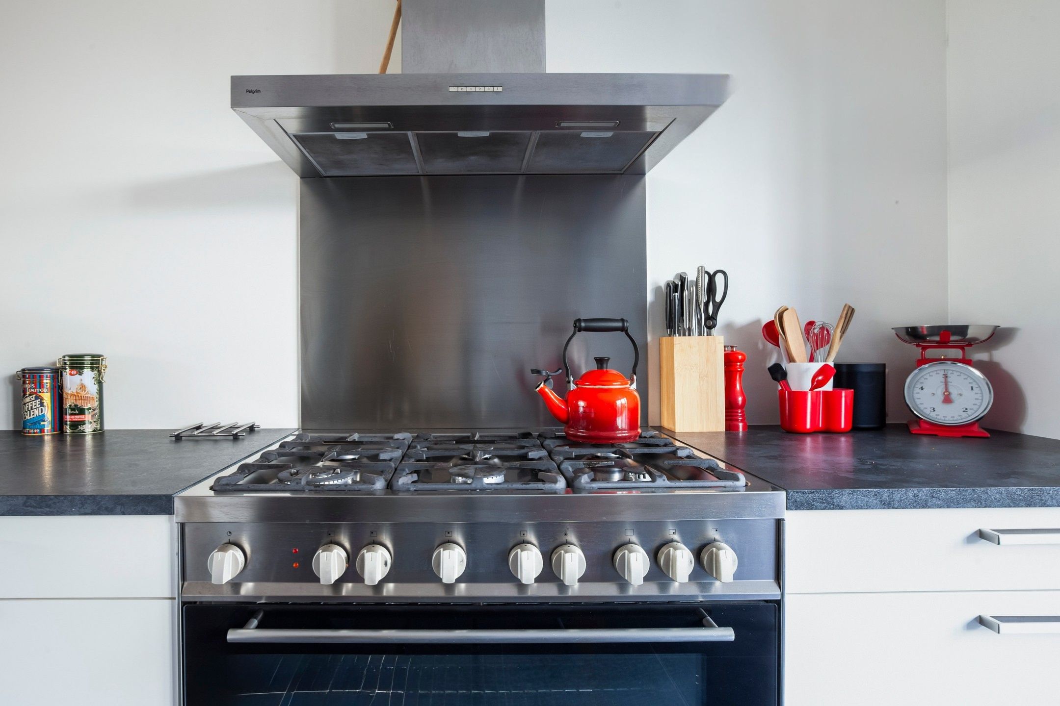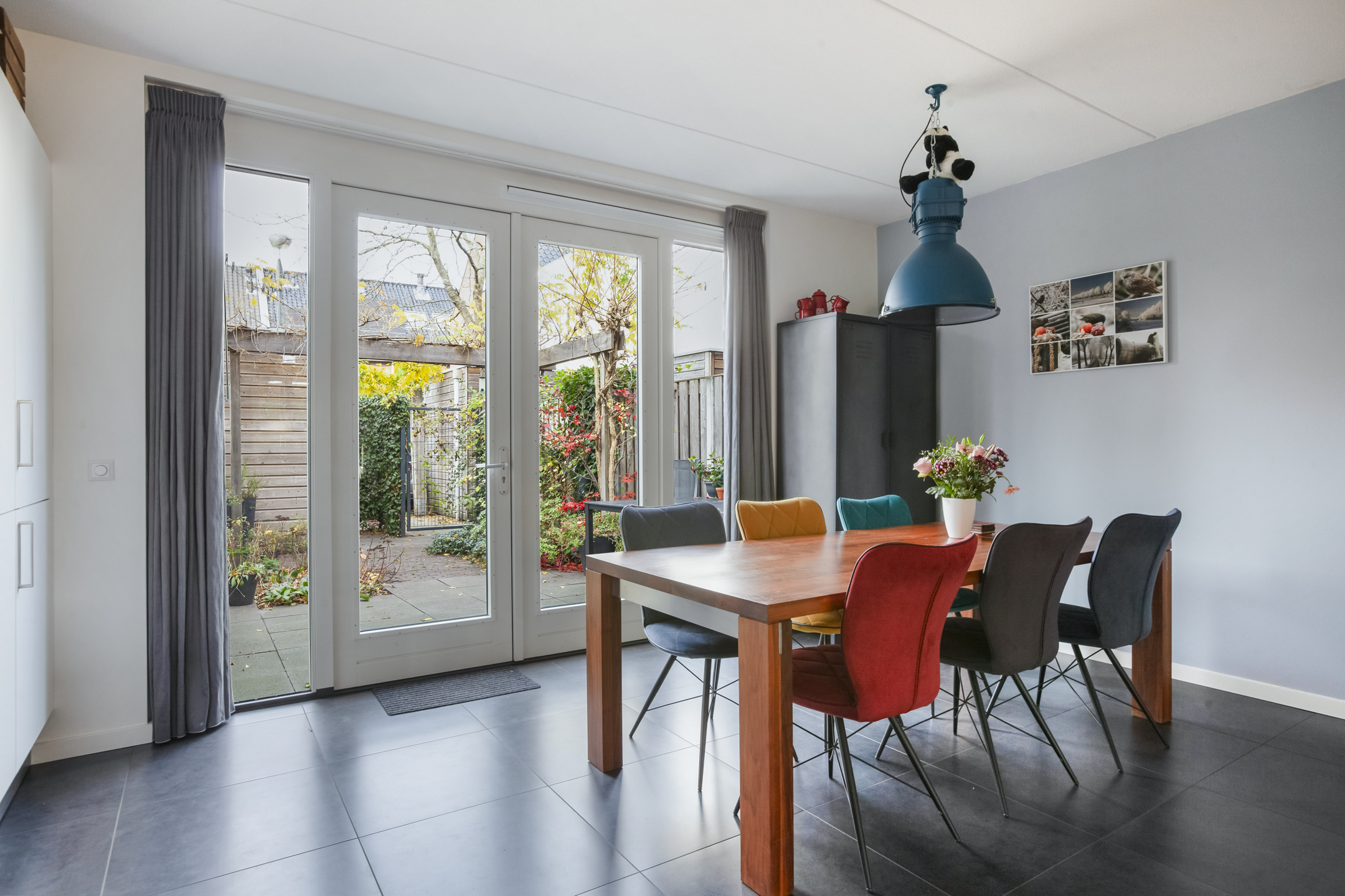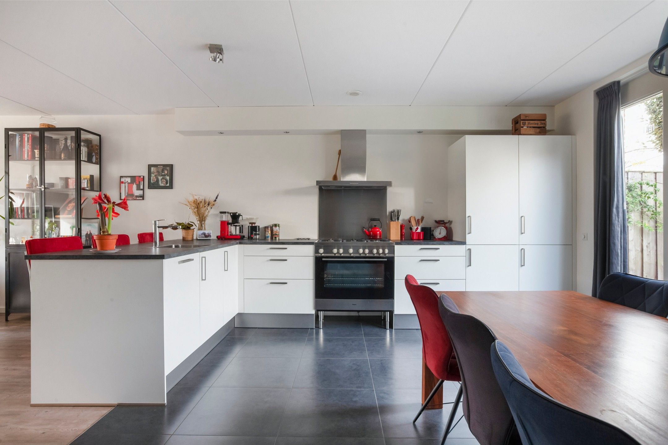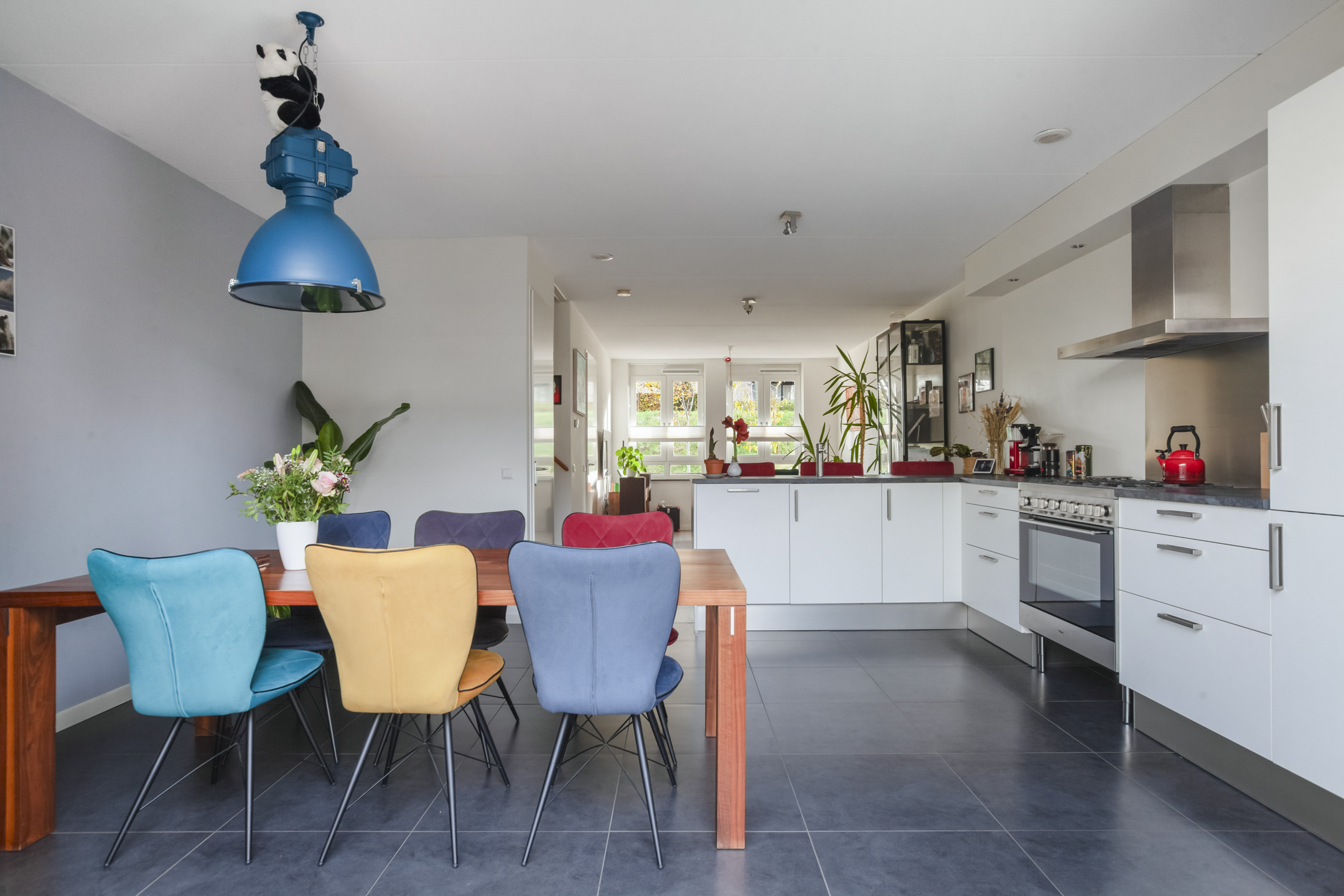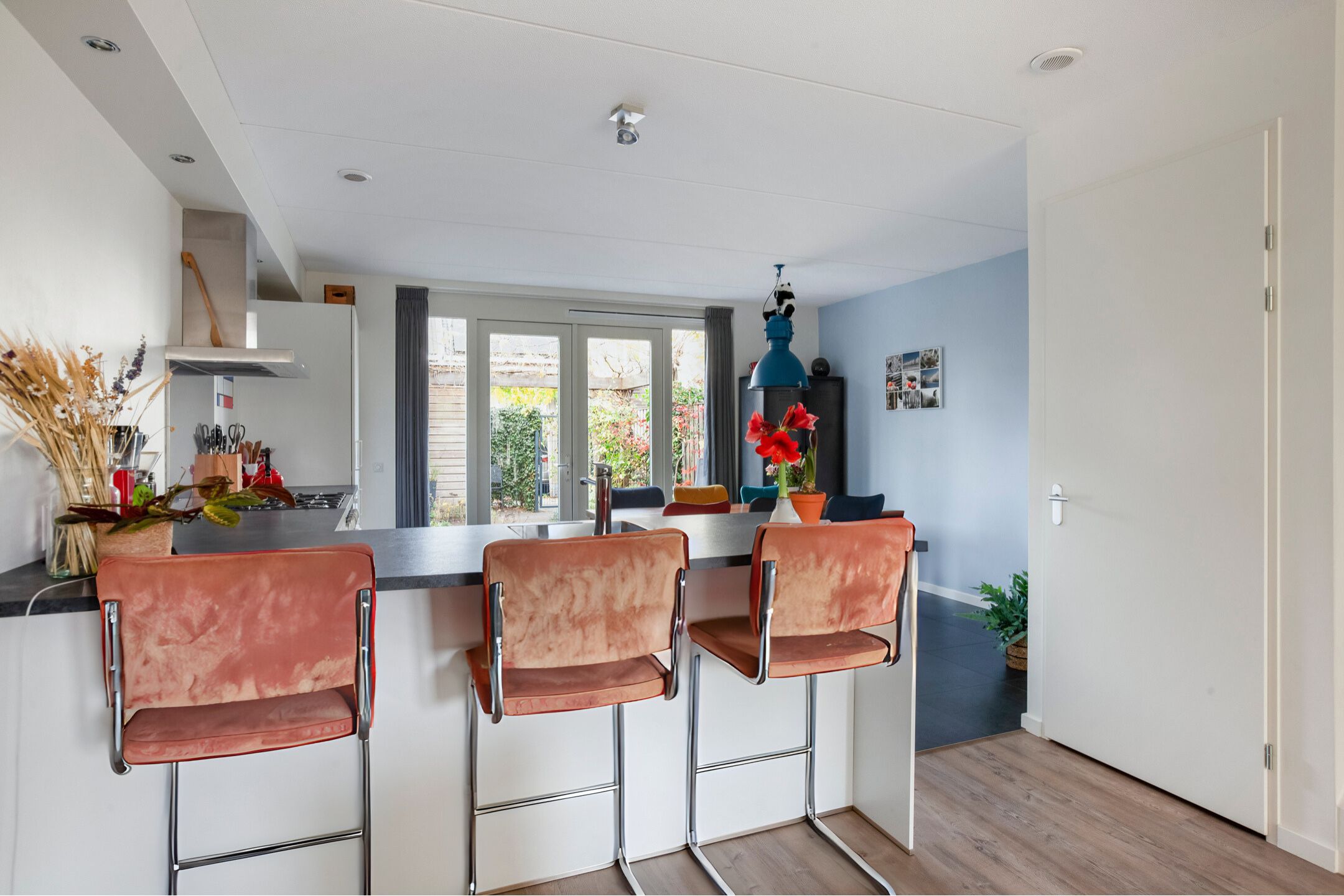 De ruime woonkeuken met eetgedeelte ligt aan de achterzijde en heeft openslaande deuren naar de tuin. De keuken is in een L-vorm opgesteld en heeft een praktische ontbijtbar. Je krijgt hier de beschikking over de volgende inbouwapparatuur: