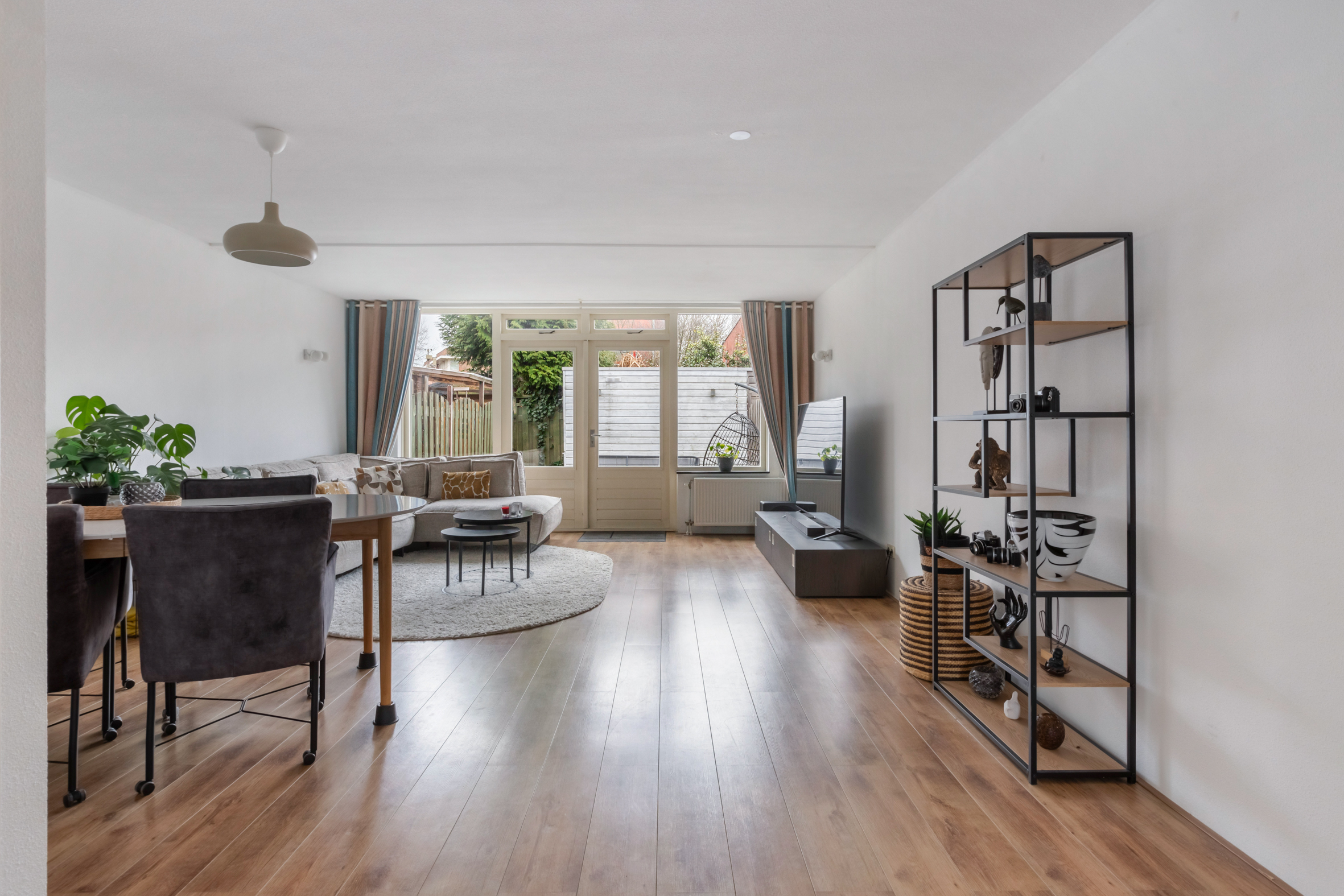 Vanuit de voortuin kom je in de royale hal. In de hal vind je de toiletruimte, de garderobehoek, een vaste kast, de meterkast, de trap naar de verdieping en glasdeur naar de woonkamer en keuken. De uitgebouwde woonkamer heeft openslaande deuren naar de zonnige tuin en grote ramen voor goed lichtinval. Aan de voorzijde vind je de L-vormige keuken, voorzien van de volgende (A-merk) inbouwapparatuur:
