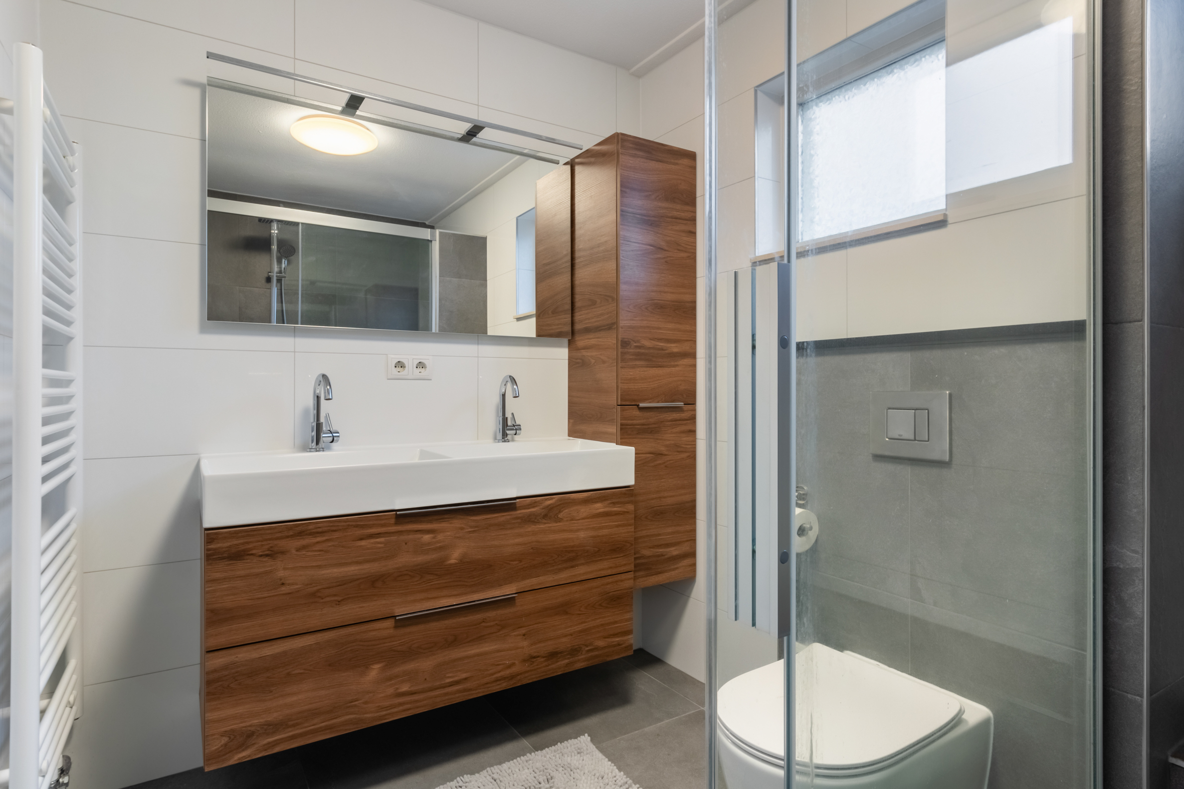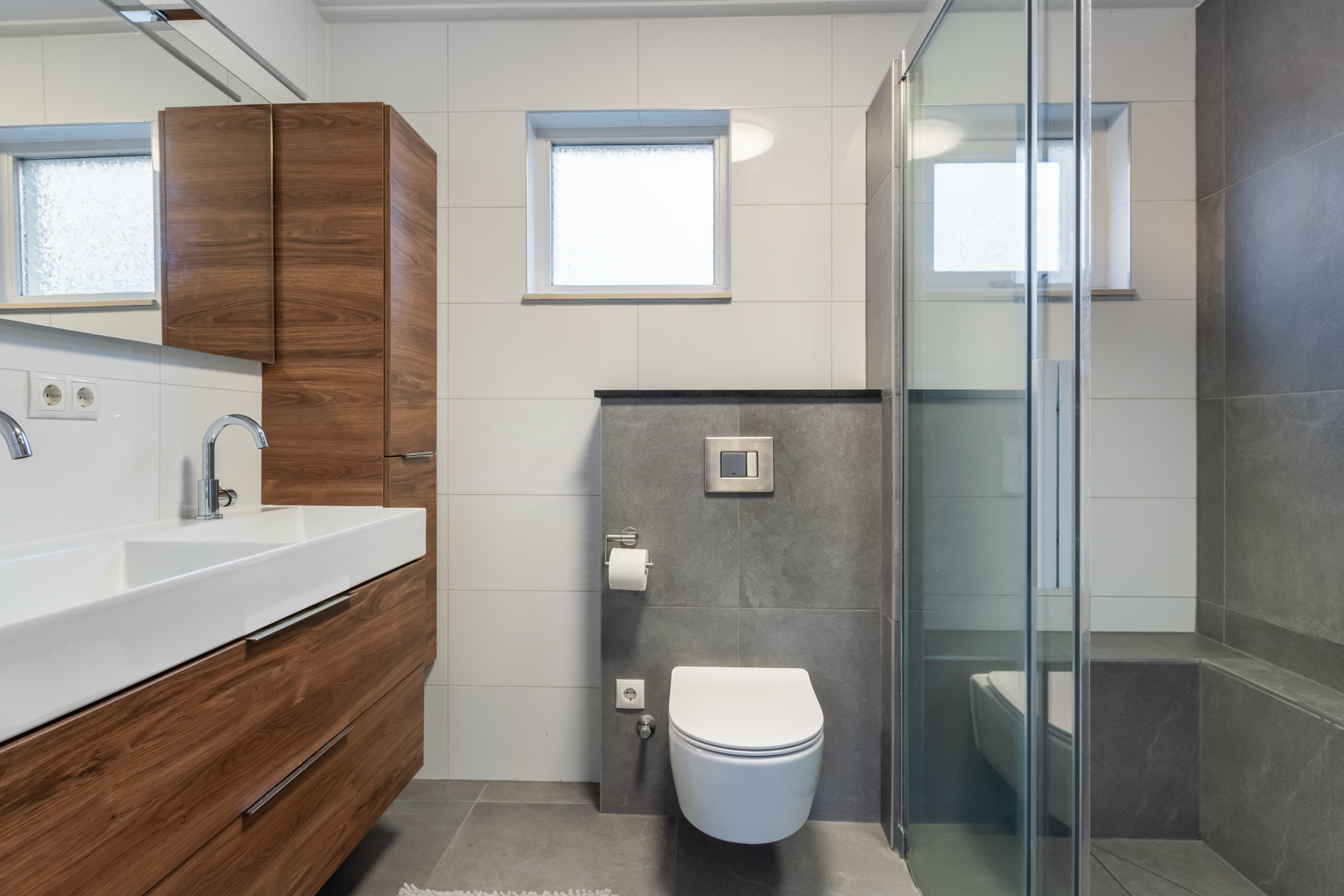 De badkamer is volledig betegeld, modern afgewerkt en voorzien van een: