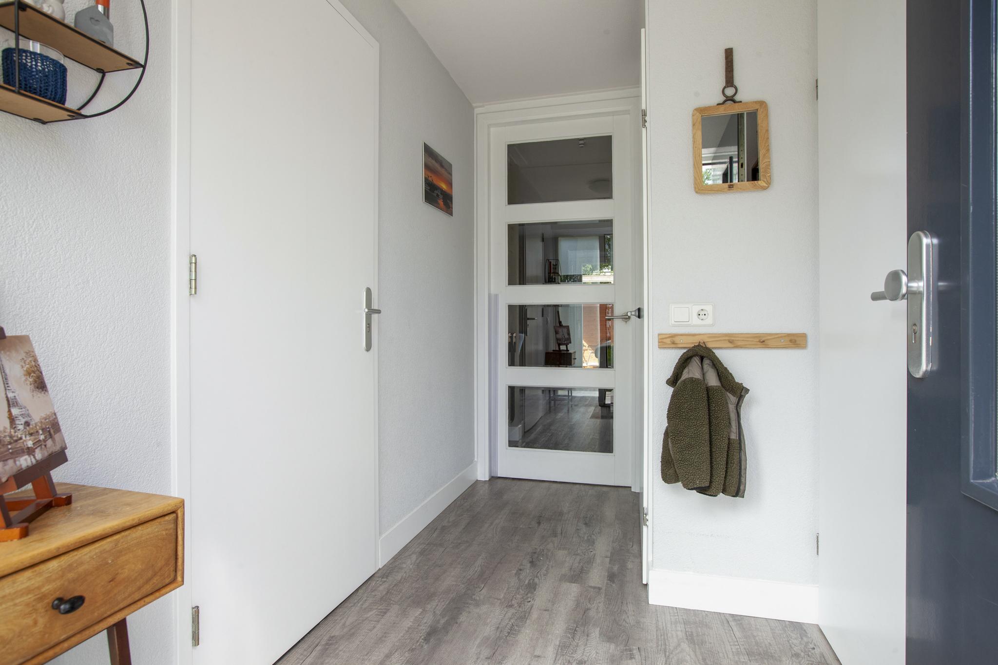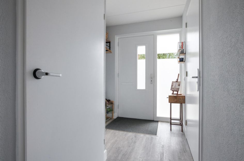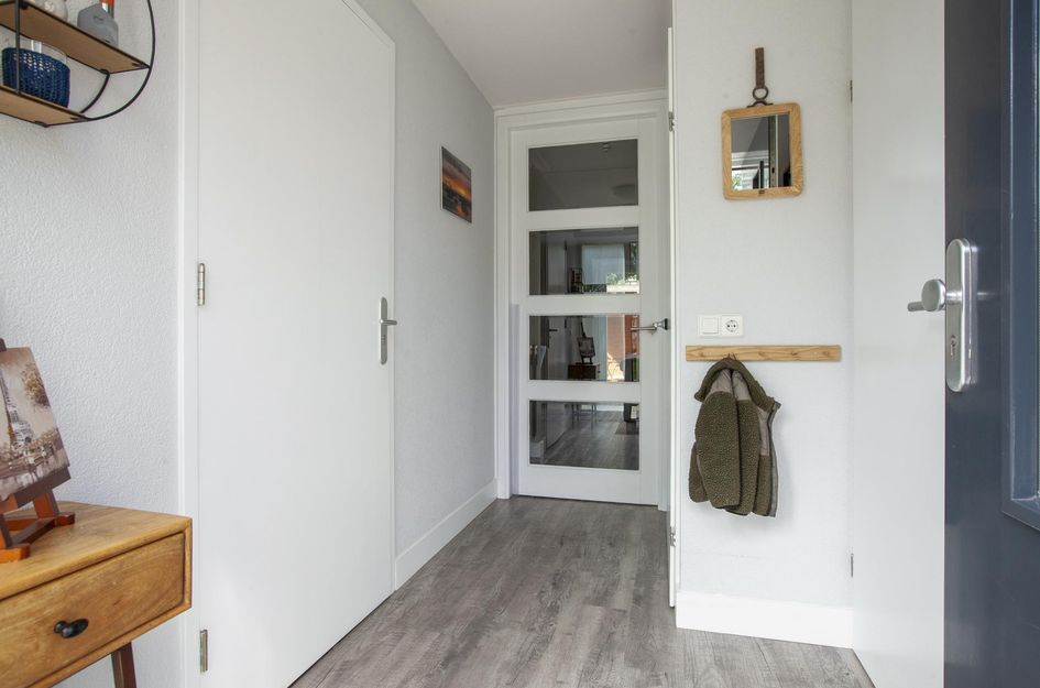De strak aangelegde voortuin is deels overkapt zodat je droog de hal in stapt. De hal heeft direct een deur naar de inpandige berging/bijkeuken inclusief wasruimte. Deze ruimte is volledig betegeld en er is voldoende ruimte om je spullen op te bergen. Ook heeft deze ruimte een deur naar buiten en zijn de wasmachine en droger hier opgesteld. De hal is verder voorzien van de garderobe, meterkast, licht betegelde toiletruimte en een glasdeur naar de woonkamer.