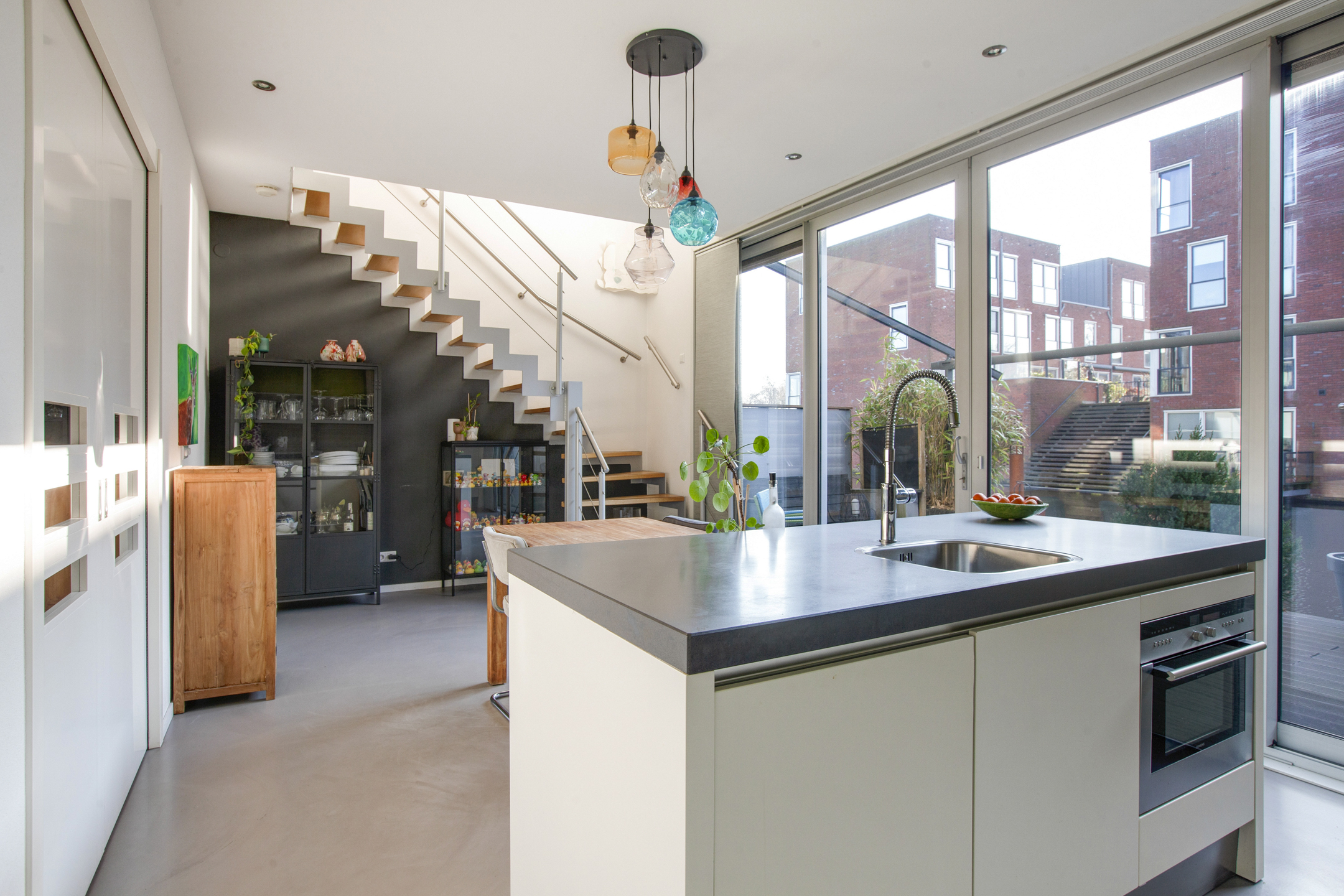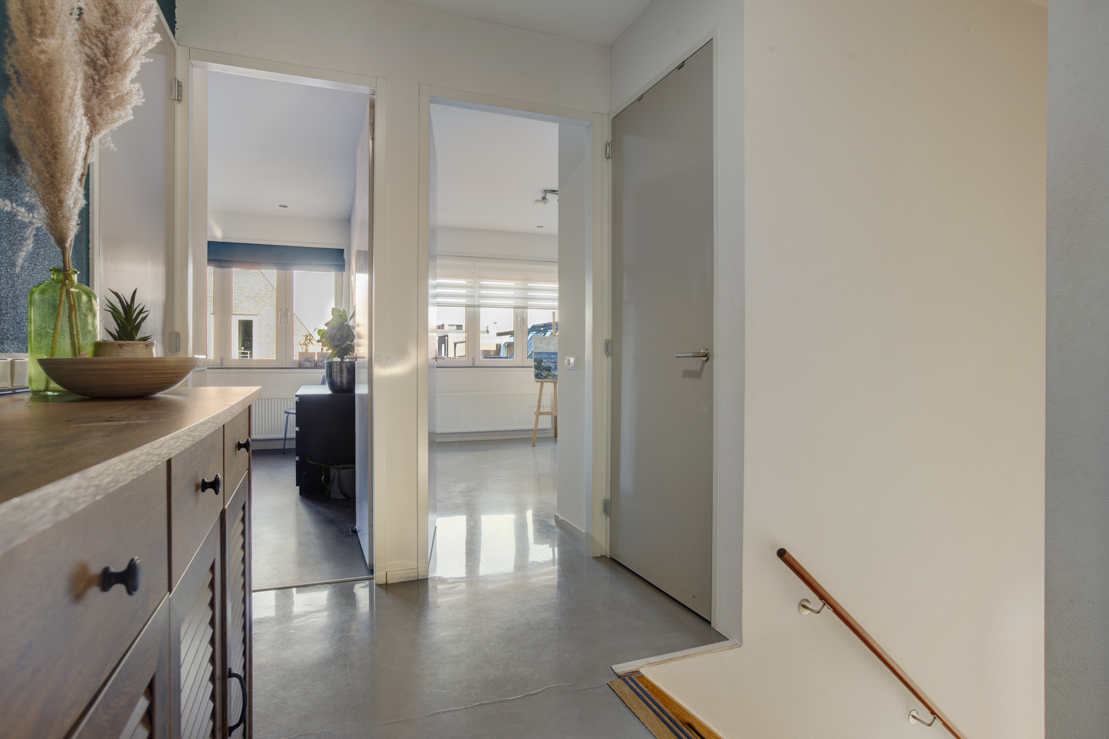 De hal beschikt over de meterkast, een modern toilet met wandcloset en fonteintje en ruimte om de jassen op te hangen. Via de schuifdeuren kom je in de royale woonkeuken, met een strakke afwerking en een gietvloer met vloerverwarming. Tevens bevindt zich hier de trap naar de eerste verdieping. De aangrenzende bijkeuken aan de voorzijde biedt extra opslagruimte.