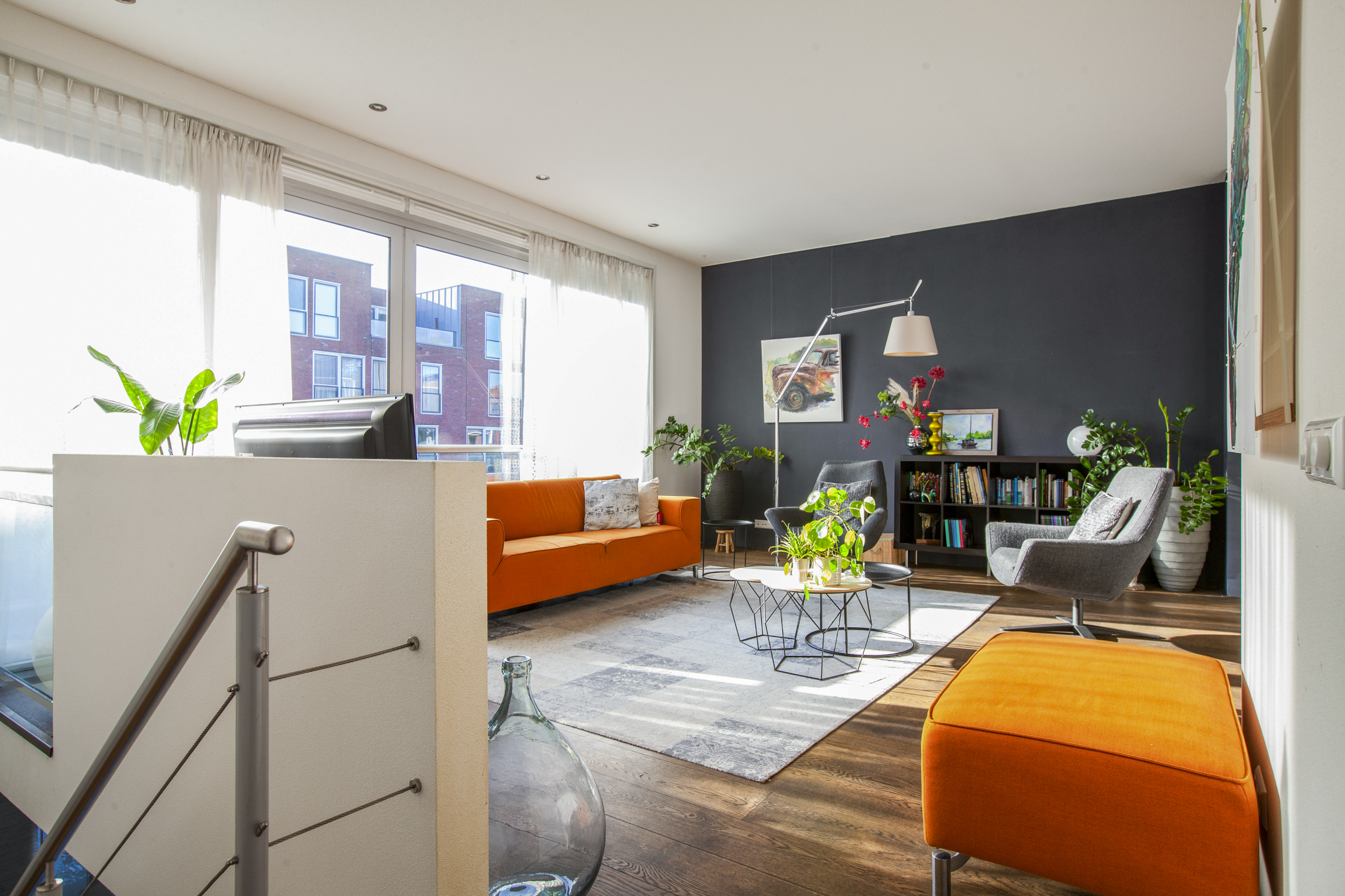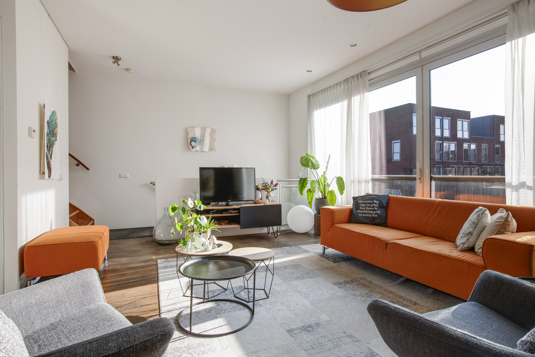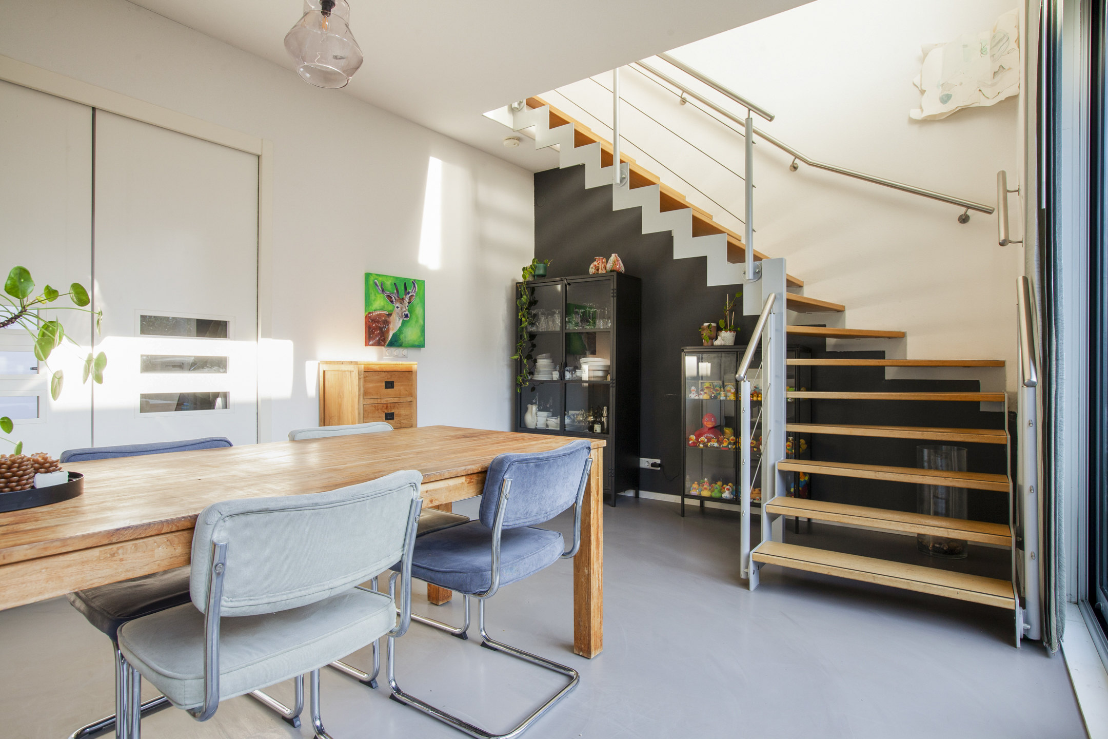 Op deze verdieping bevindt zich de royale living van ca. 30 m2, afgewerkt met een hardhoutenvloer en vloerverwarming. De hoge ramen met schuifdeuren en een frans balkon zorgen voor een goed lichtinval. Onder de trap naar de tweede verdieping is een praktische trapkast met een wastafel.
