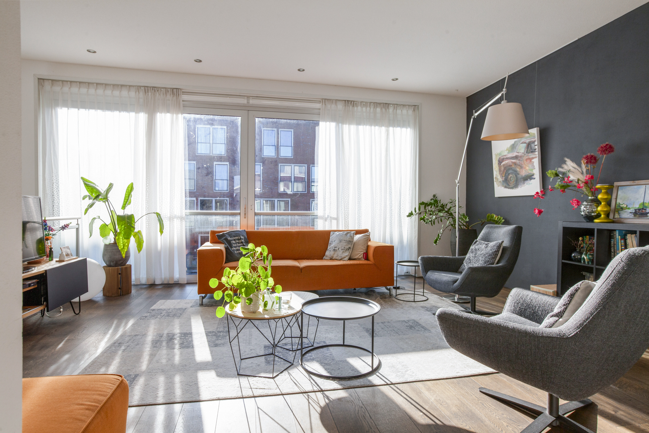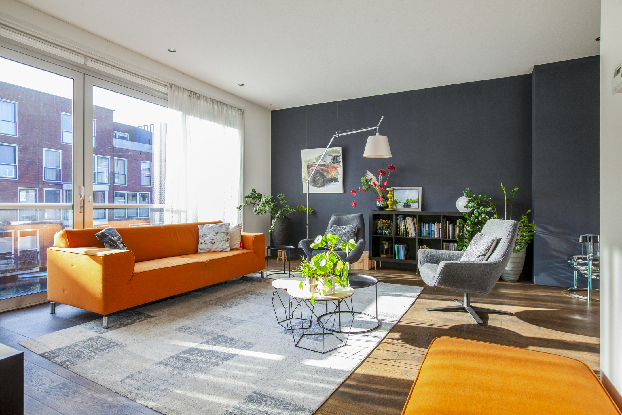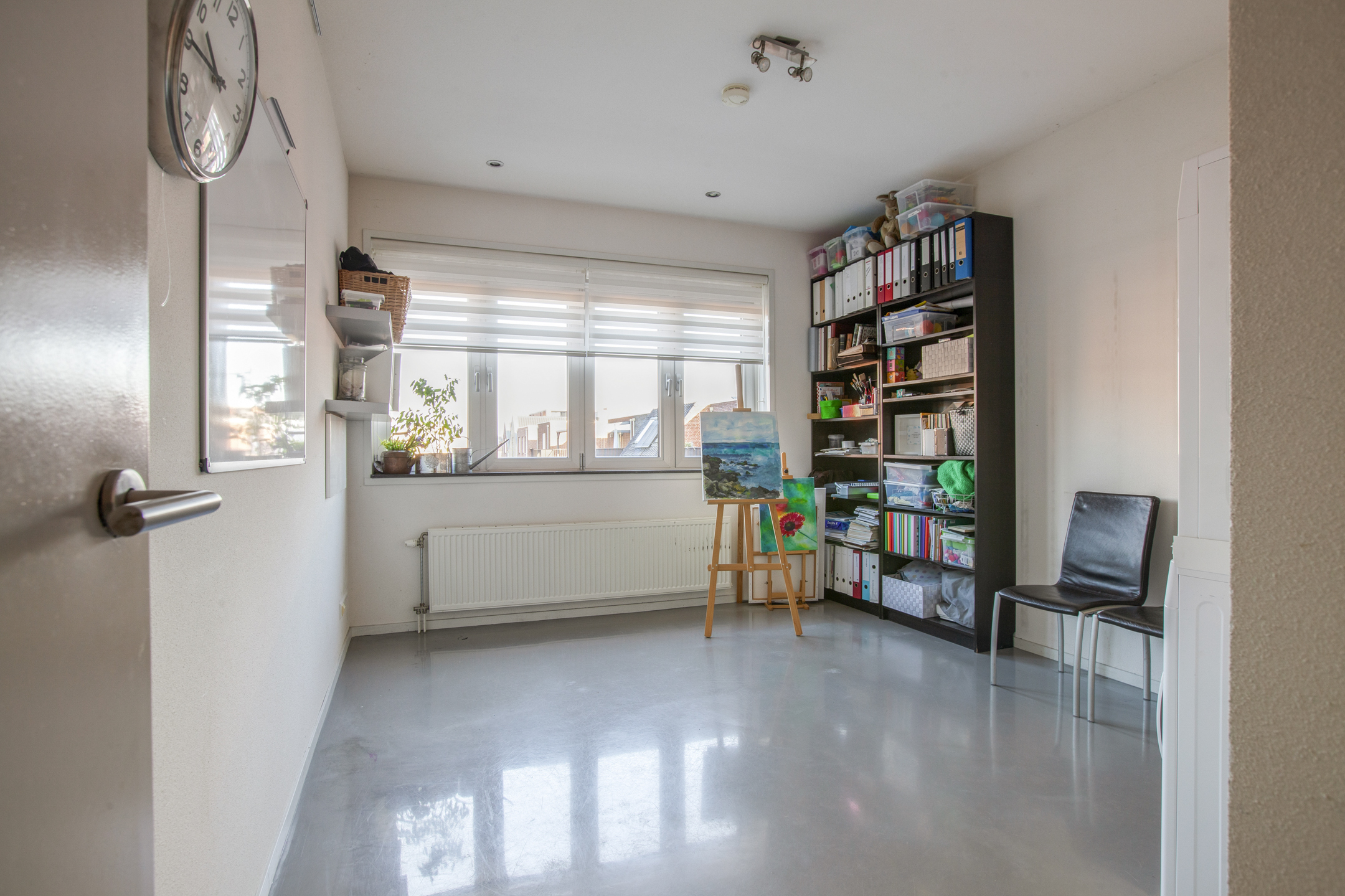 Op deze verdieping bevindt zich de royale living van ca. 30 m2, afgewerkt met een hardhoutenvloer en vloerverwarming. De hoge ramen met schuifdeuren en een frans balkon zorgen voor een goed lichtinval. Onder de trap naar de tweede verdieping is een praktische trapkast met een wastafel.