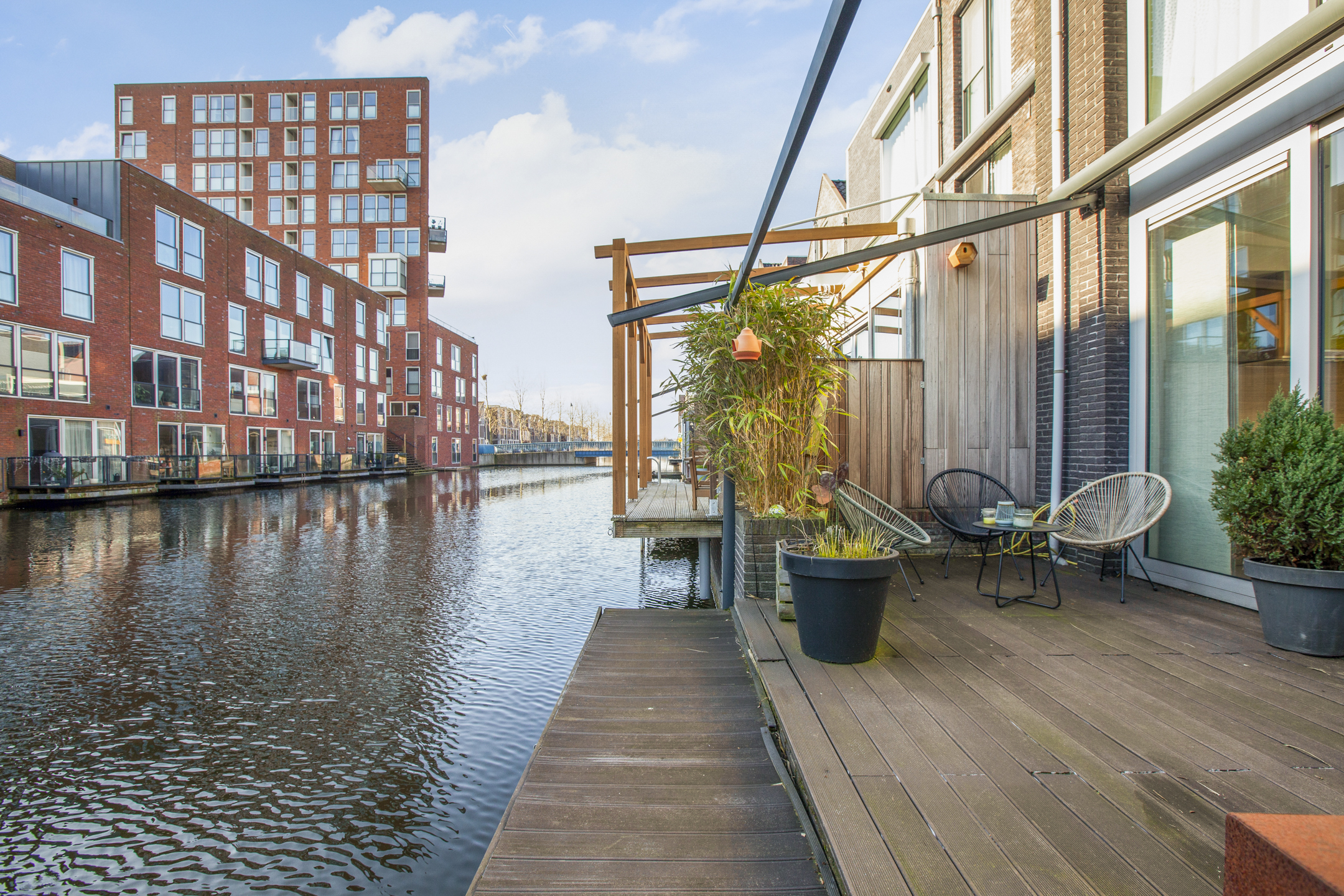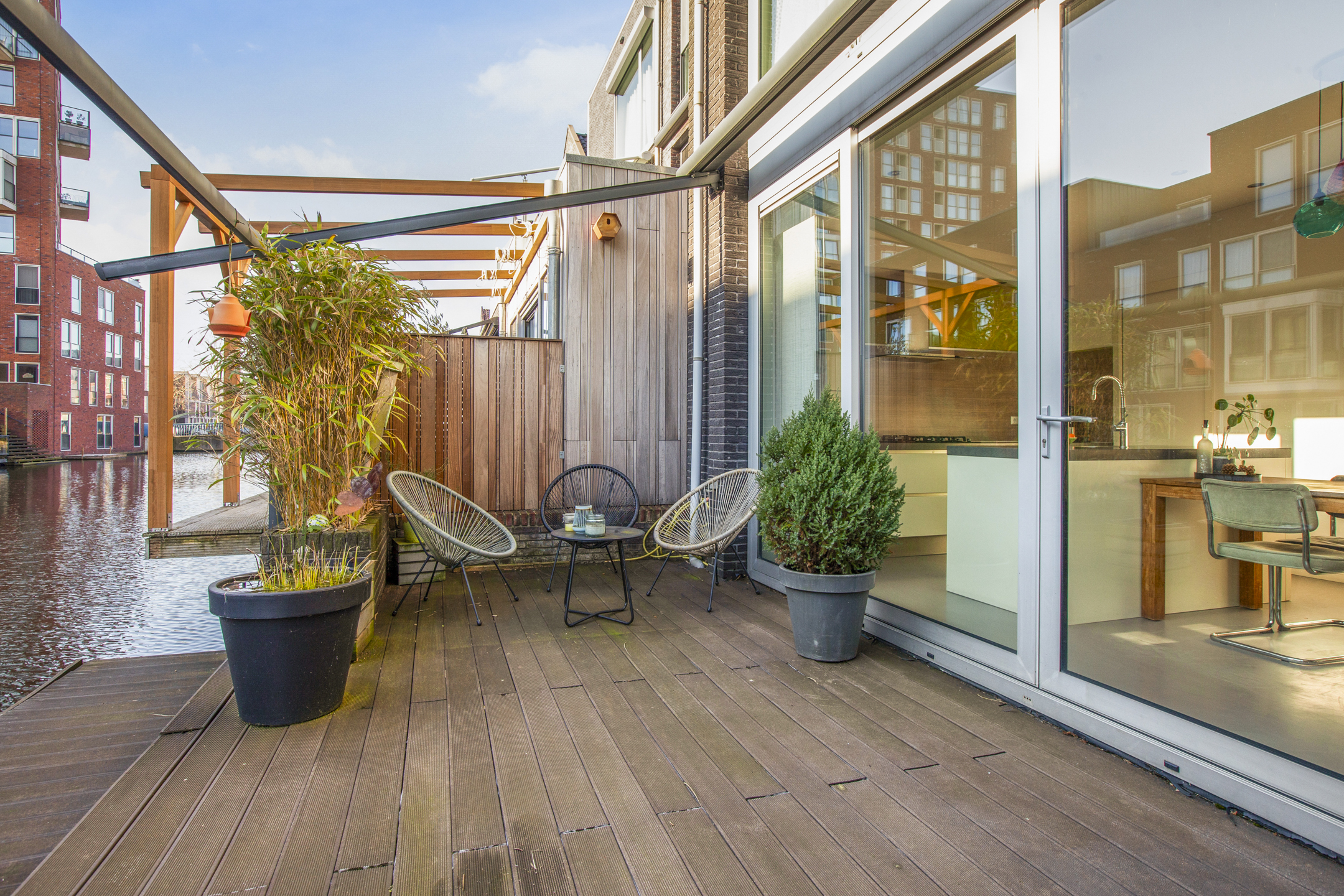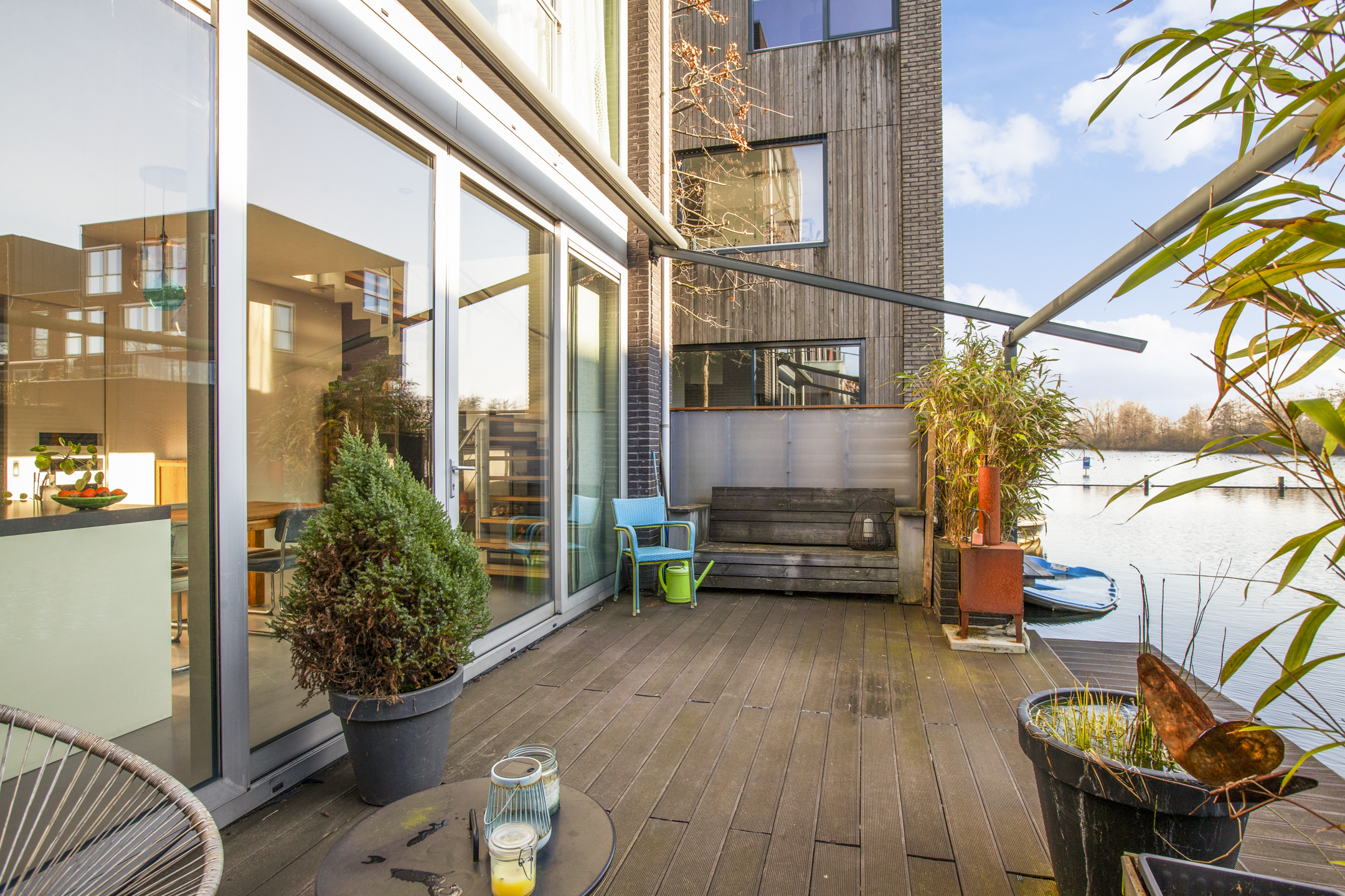 Via de schuifpui kom je op het zonnige terras aan het water waar je volop van het buitenleven kan genieten. Het terras is van kunststof, kan overdekt worden met een elektrisch zonnescherm en beschikt over een steiger voor het aanleggen van de boot.