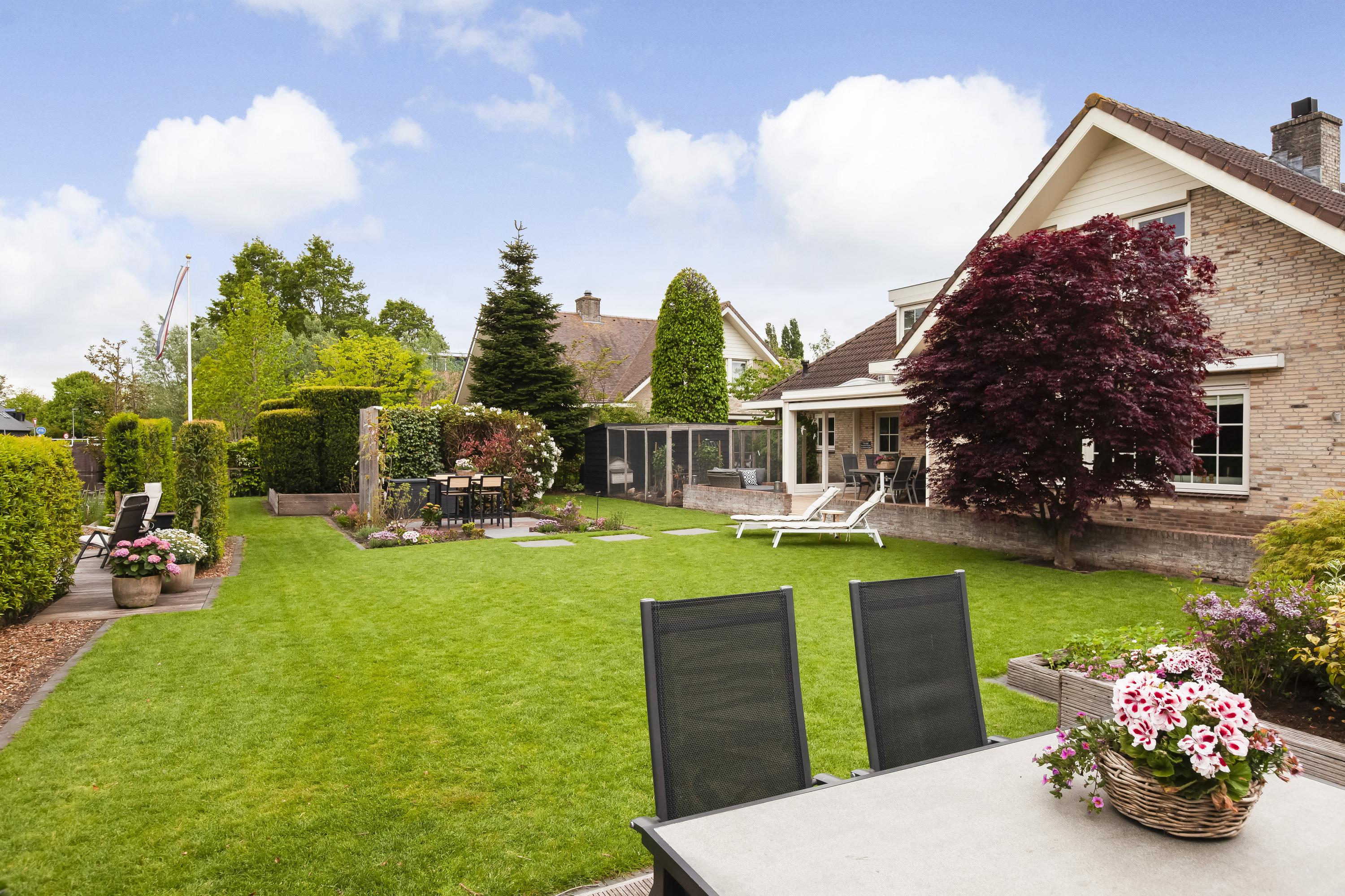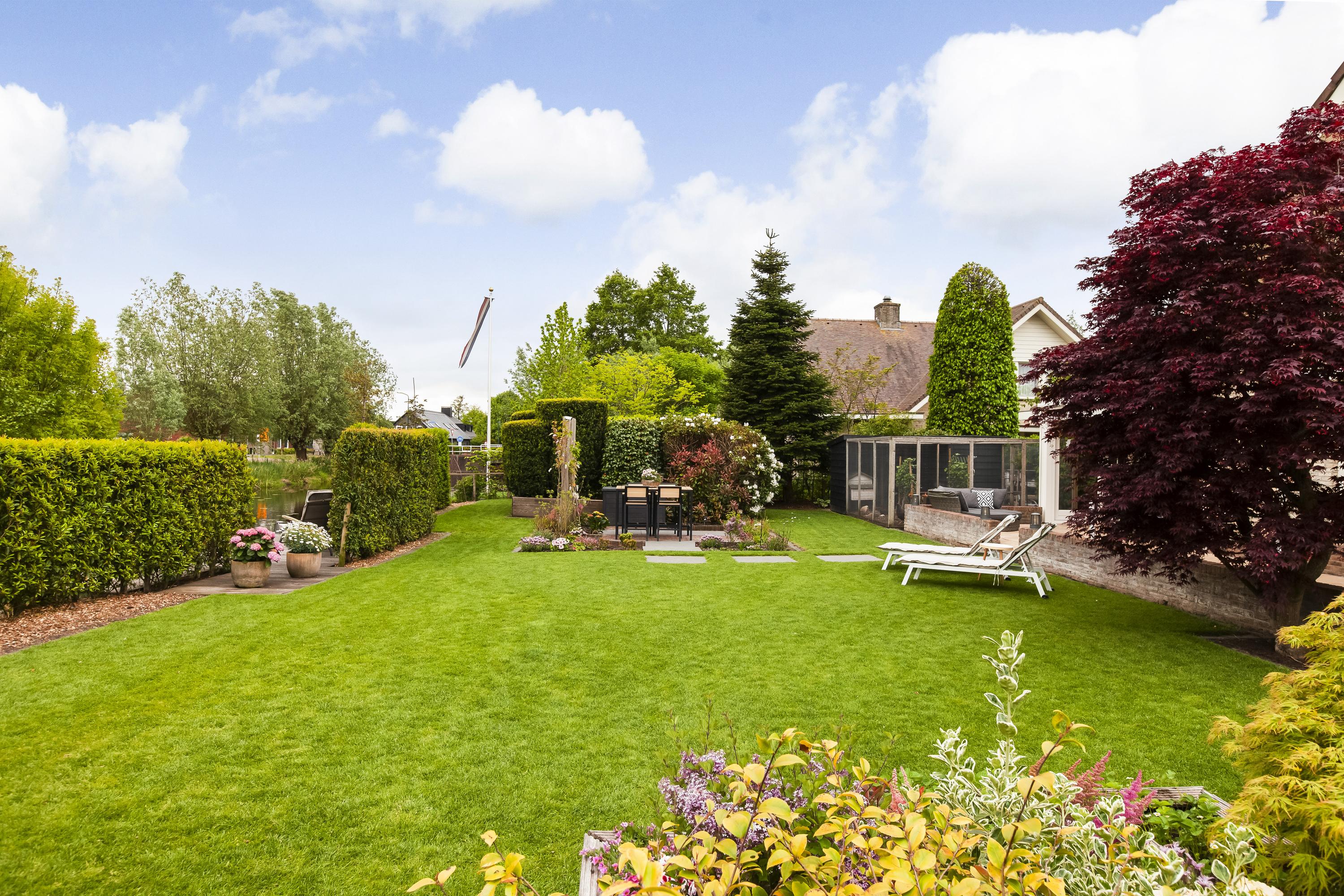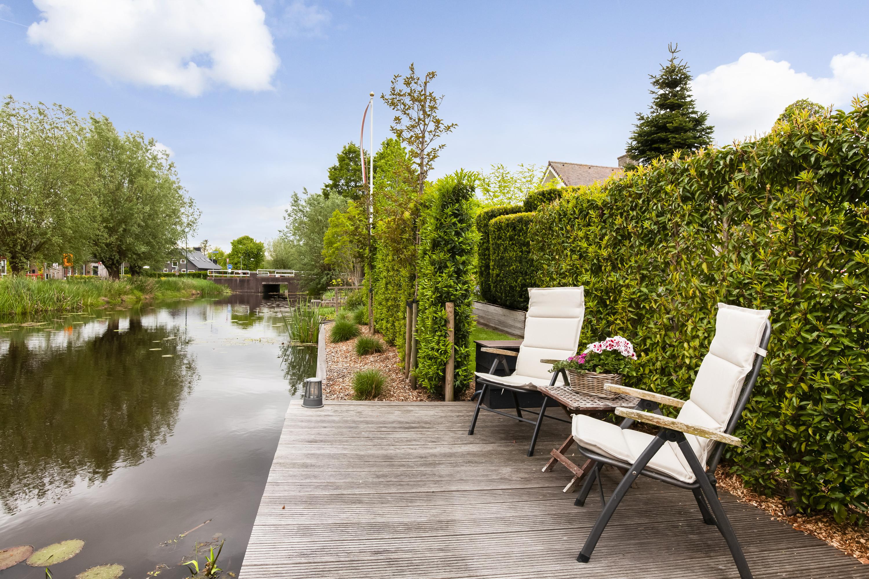 De fraai aangelegde tuin rondom de woning biedt volop privacy en is aan het water gelegen. Dankzij de royale afmetingen en de ideale ligging van het perceel geniet je hier op elk moment van de dag van zon of schaduw. Direct aan het huis ligt een onderheid terras met een sfeervolle overkapping – de perfecte plek om in alle rust buiten te leven. Aan het water is een hardhouten vlonder gemaakt.
