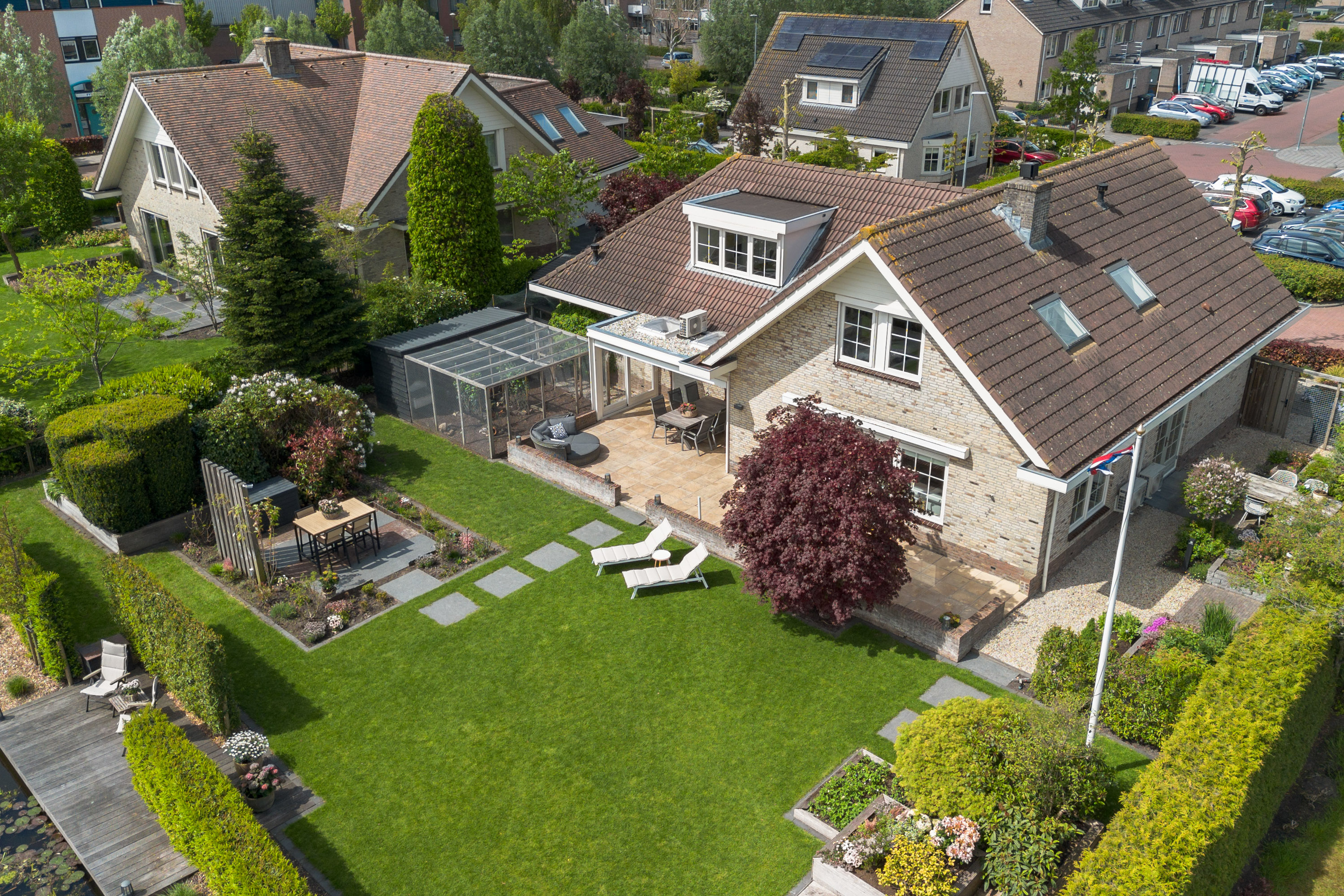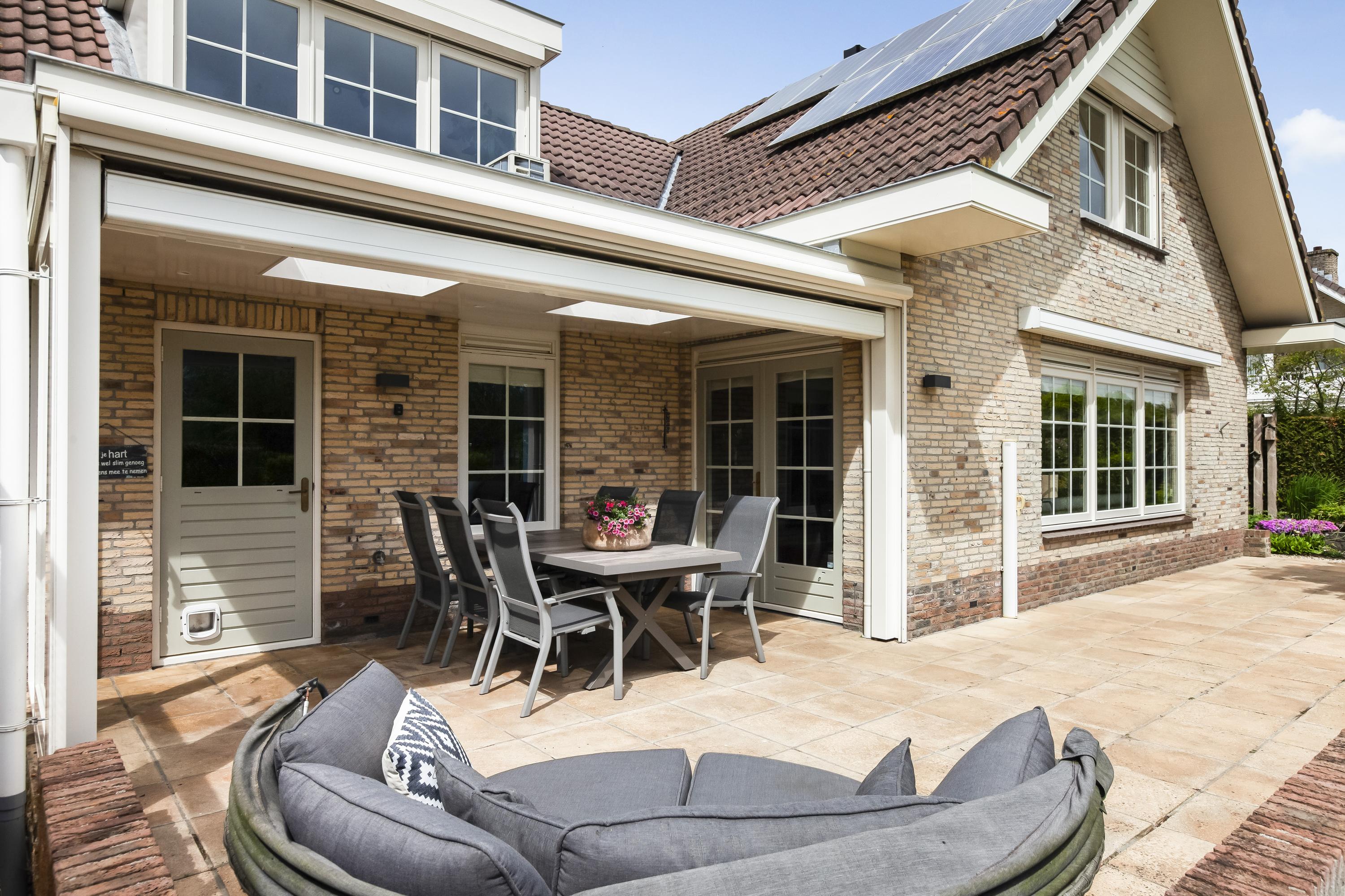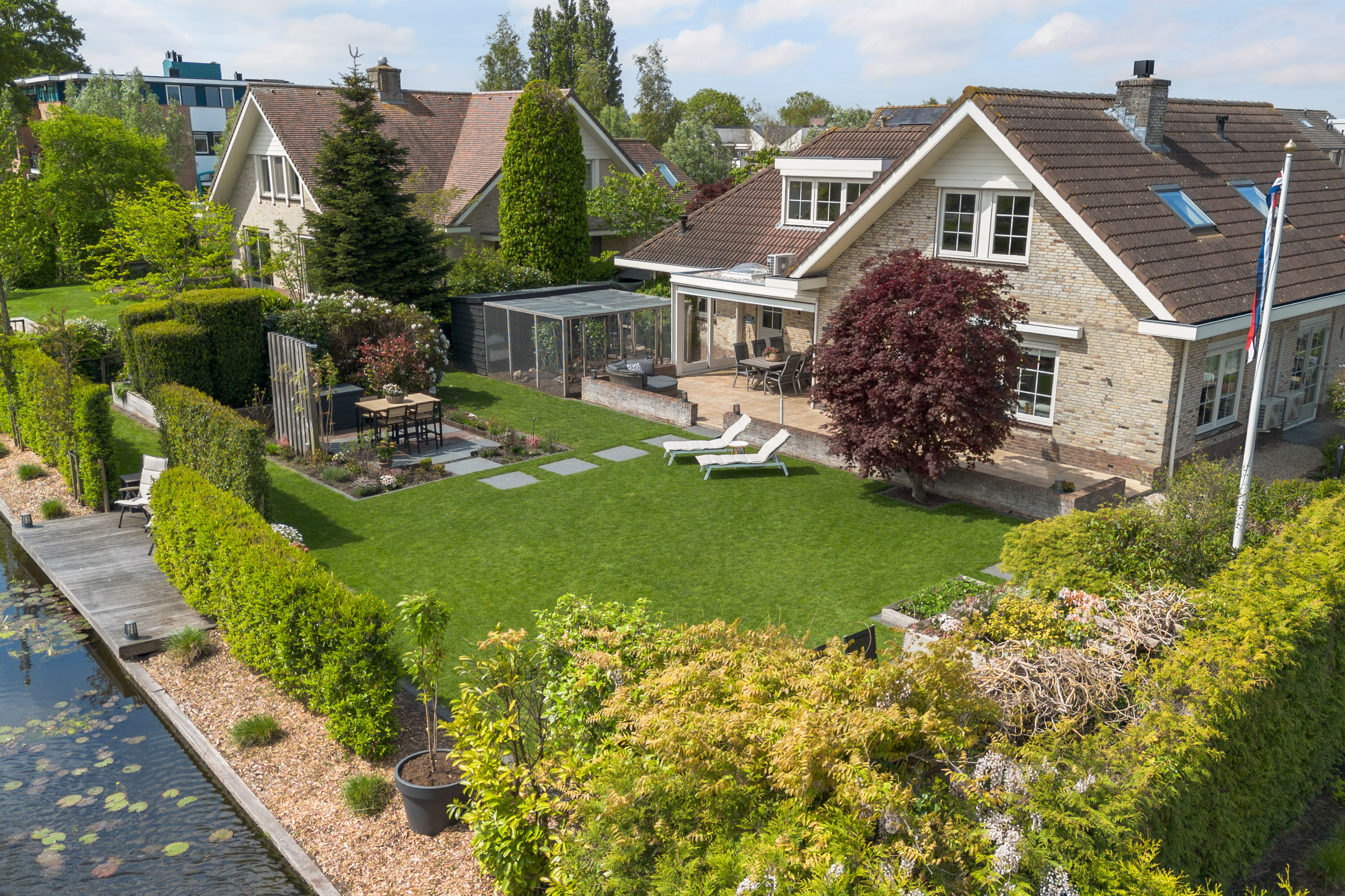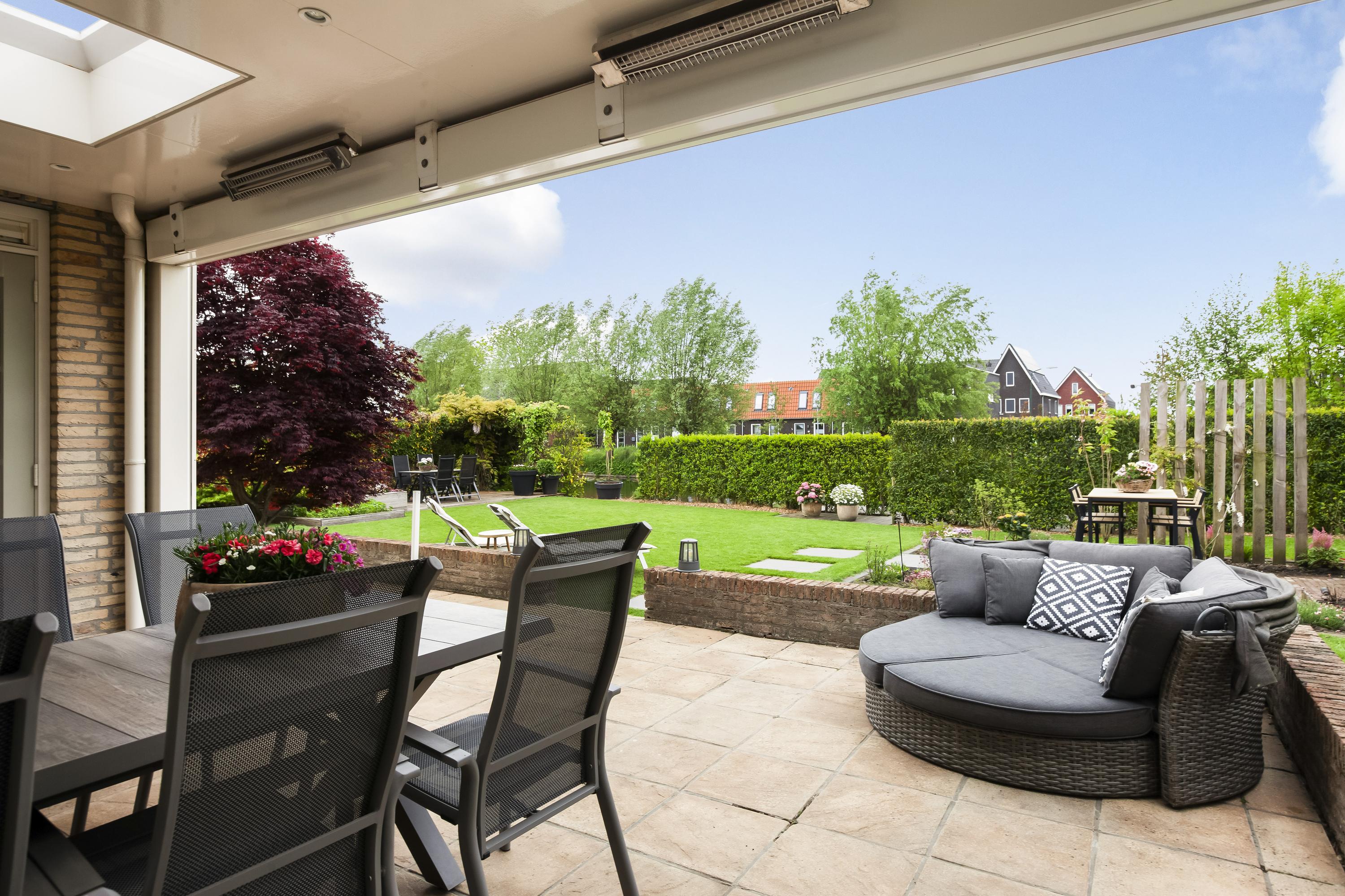 De fraai aangelegde tuin rondom de woning biedt volop privacy en is aan het water gelegen. Dankzij de royale afmetingen en de ideale ligging van het perceel geniet je hier op elk moment van de dag van zon of schaduw. Direct aan het huis ligt een onderheid terras met een sfeervolle overkapping – de perfecte plek om in alle rust buiten te leven. Aan het water is een hardhouten vlonder gemaakt.