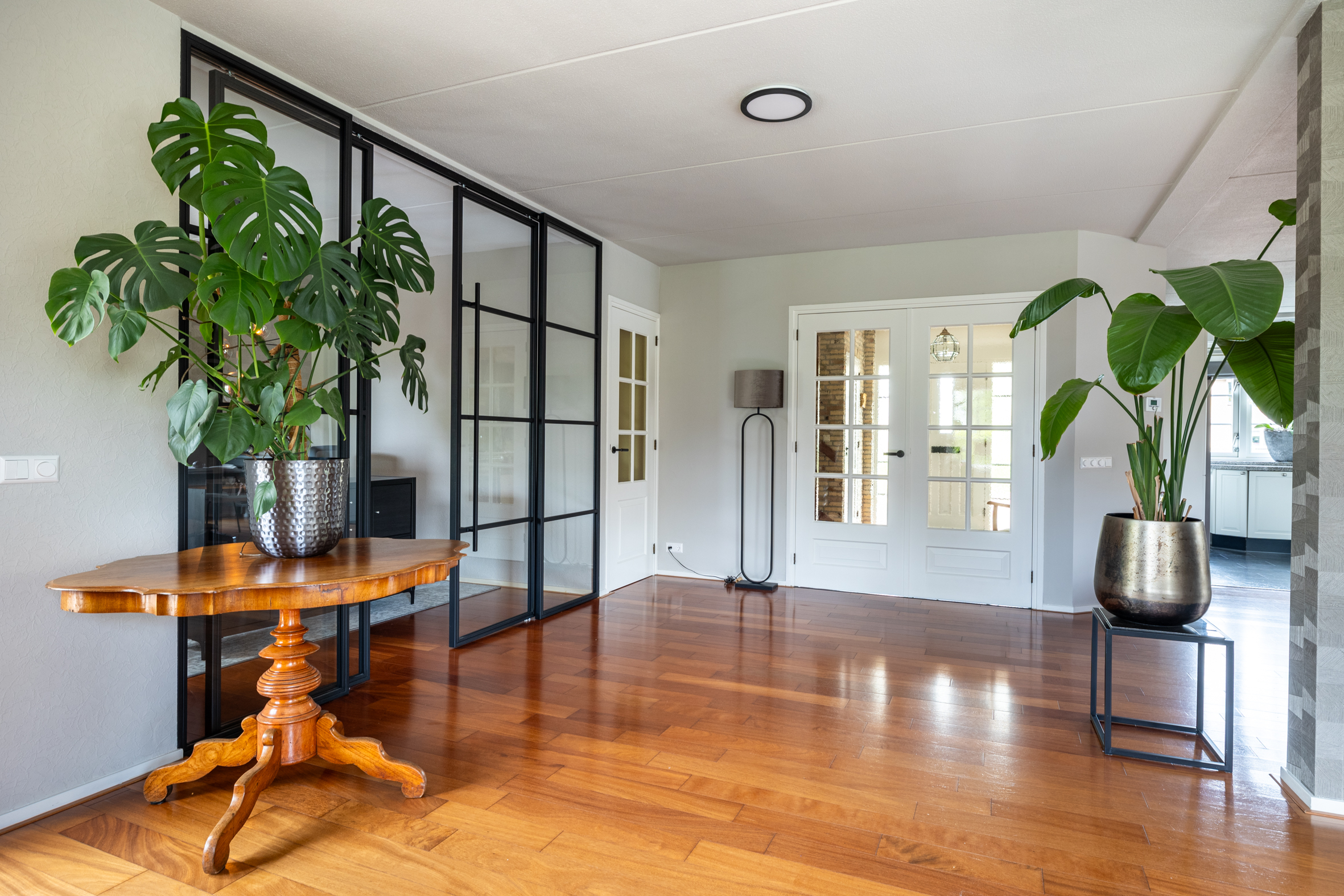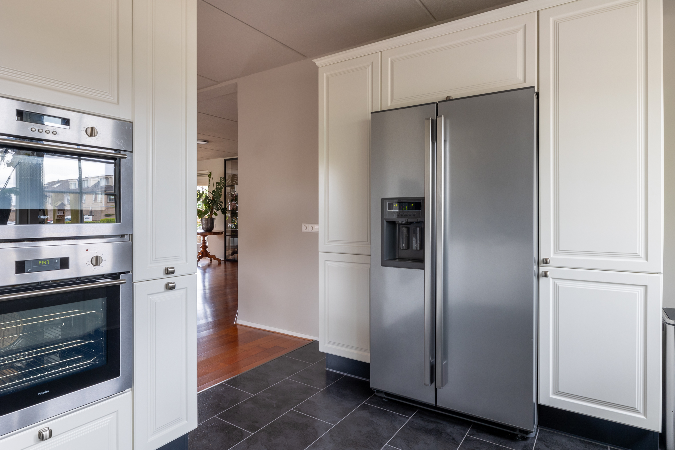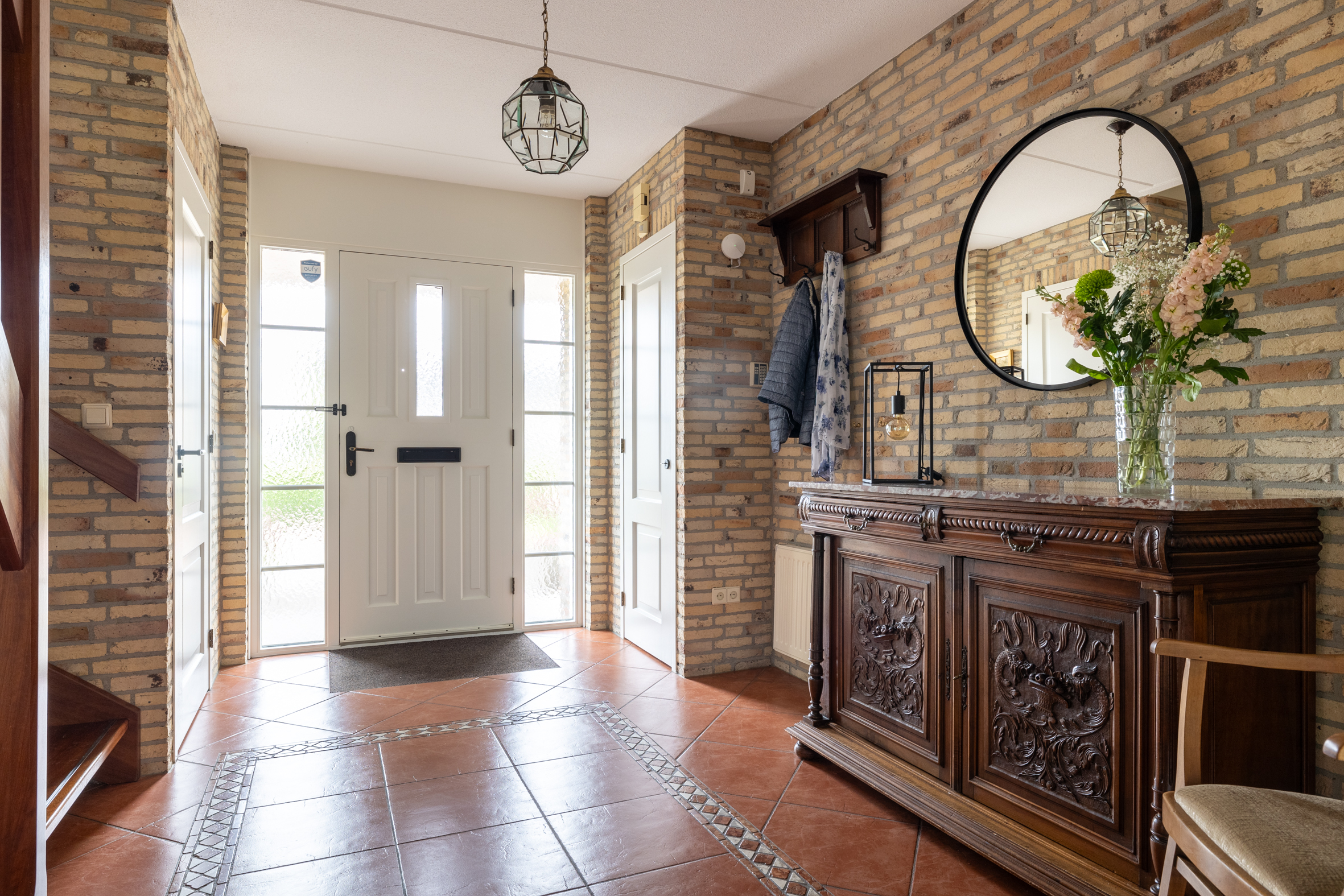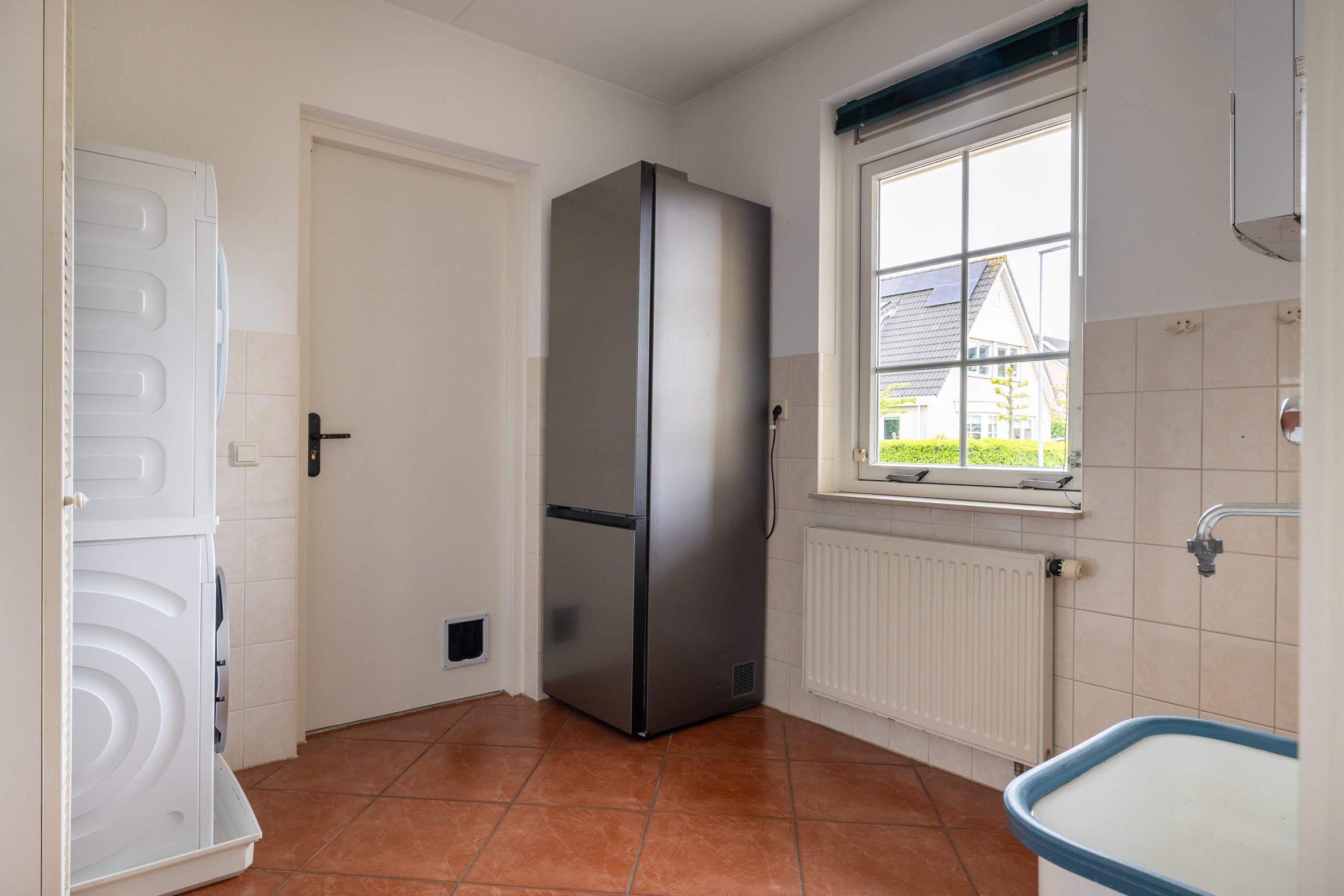 Vanuit de hal bereik je de praktische bijkeuken wat zorgt voor extra gemak, met plek voor wasapparatuur en toegang naar de dubbele garage.