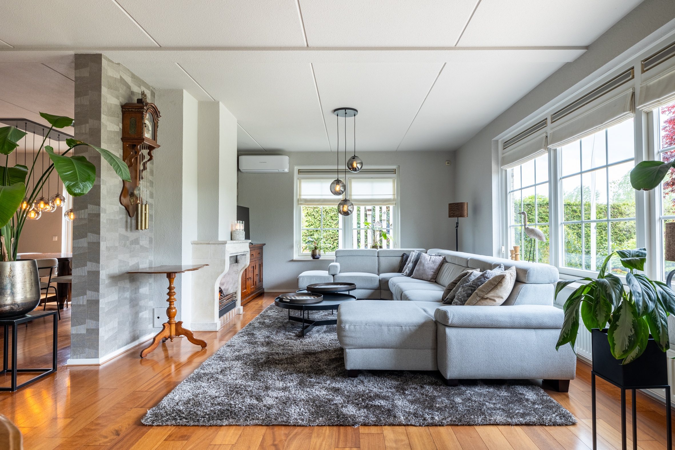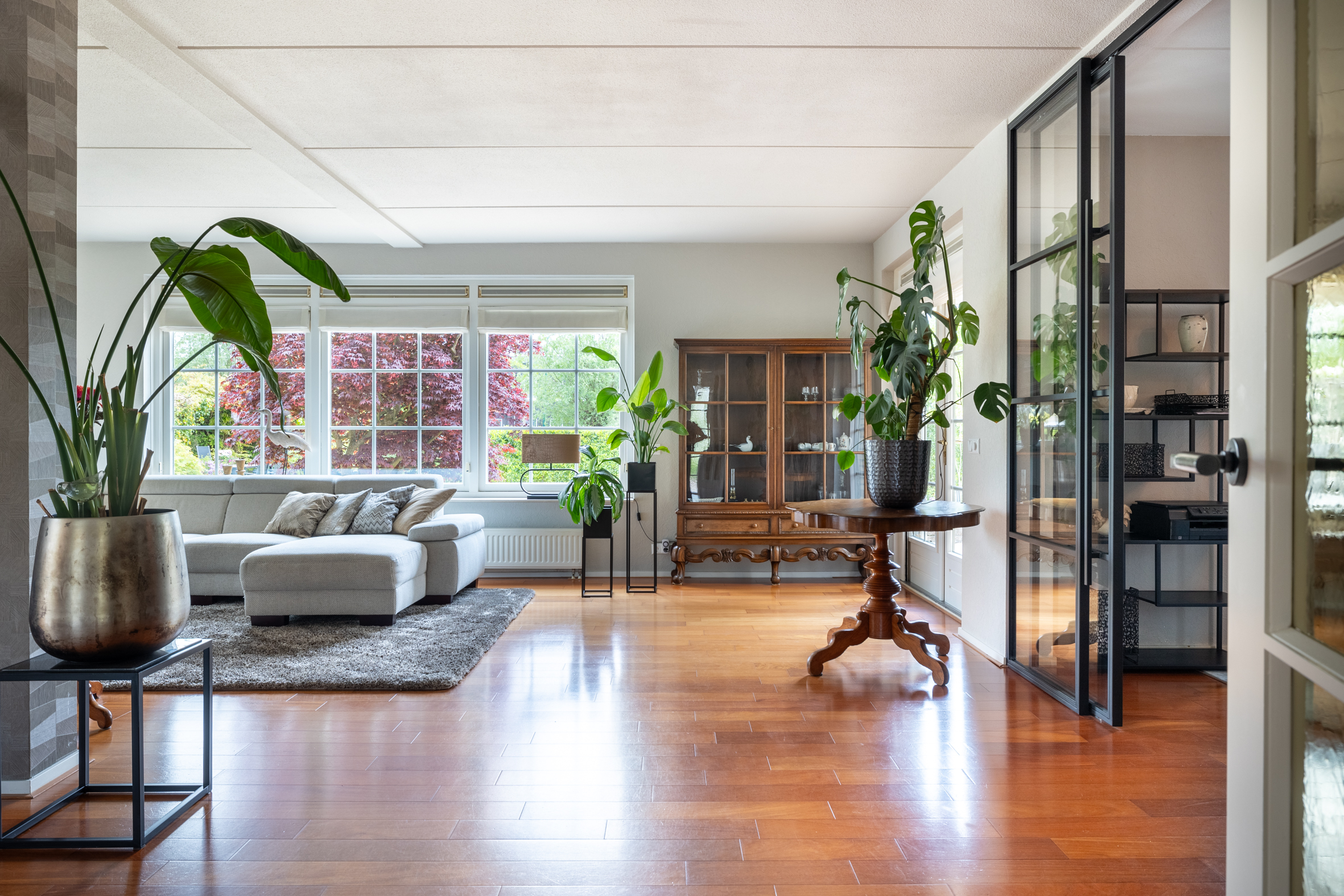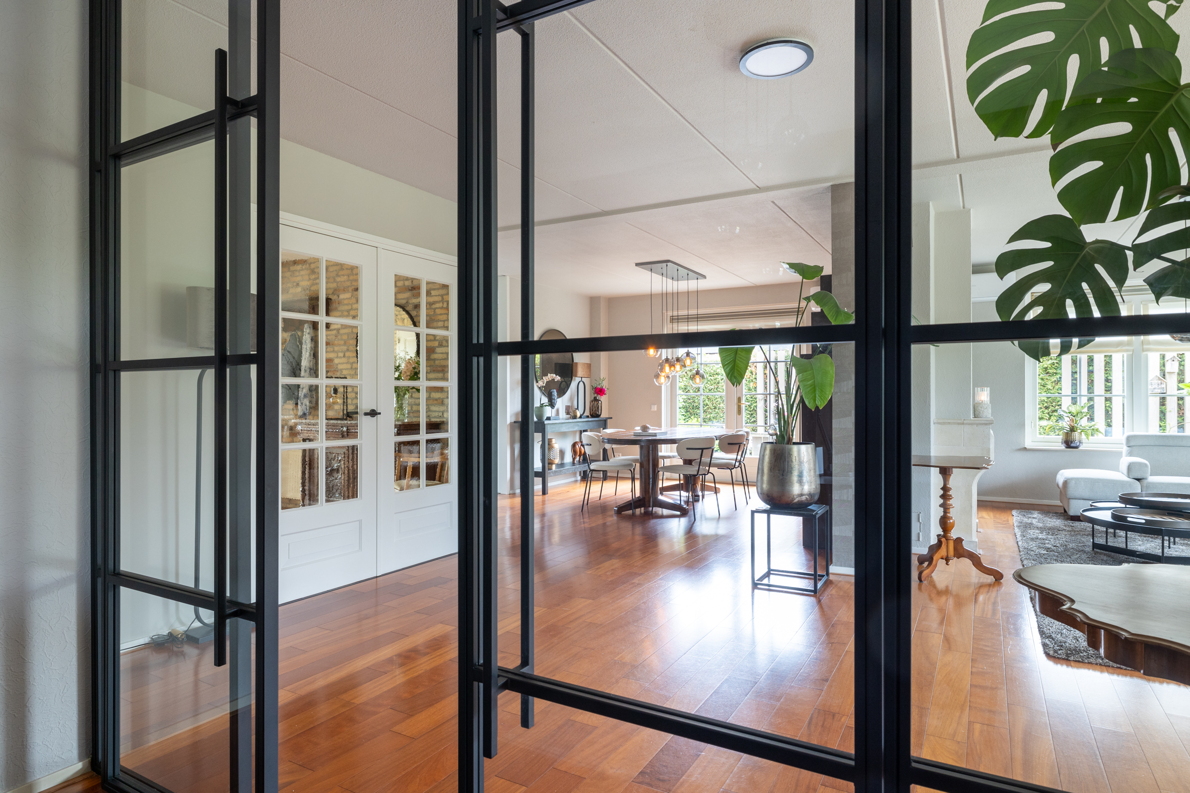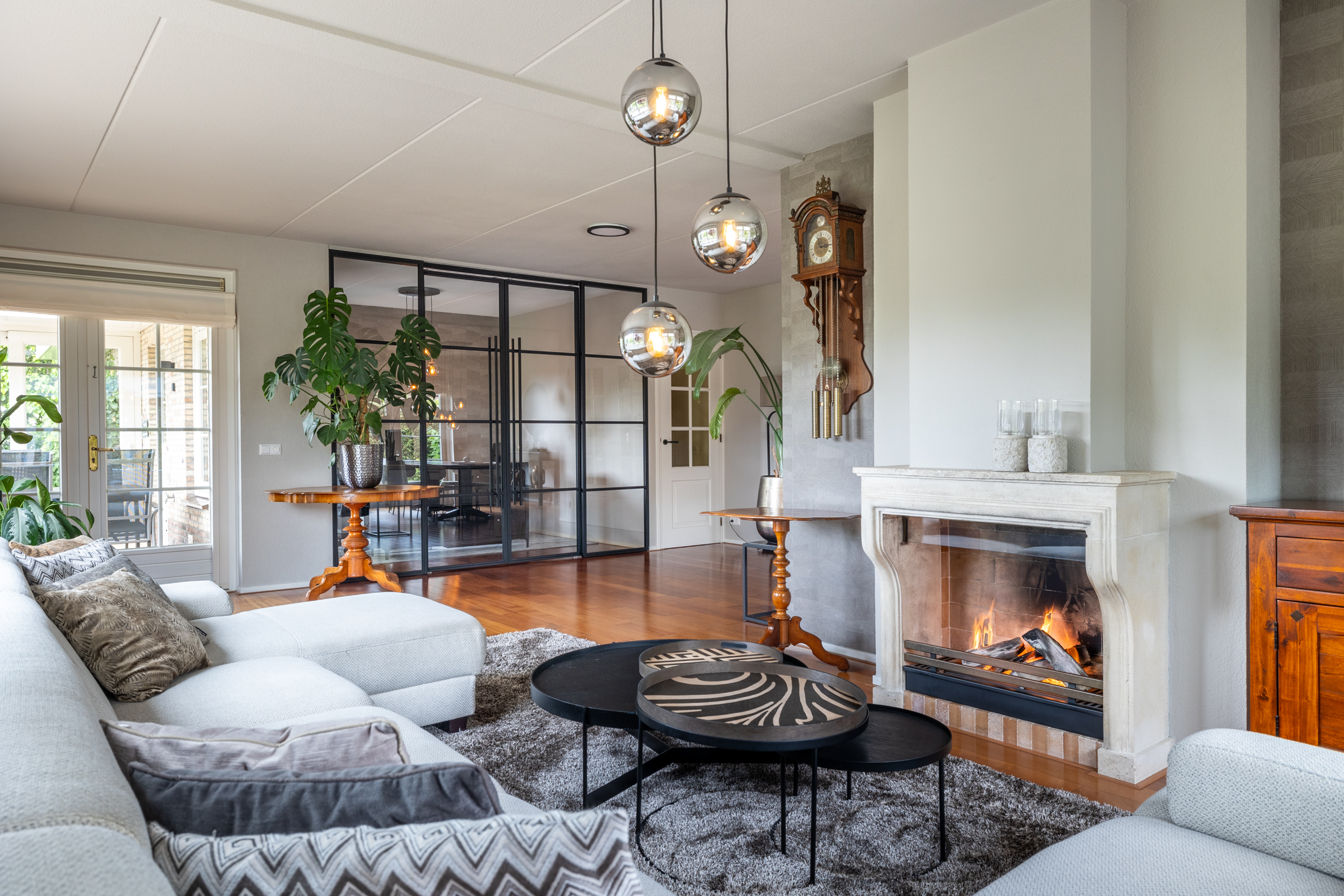 Via de ruime oprit bereik je de entree van de woning. In de hal tref je de meterkast, garderobe, een modern toilet en de trapopgang naar boven. De woonkamer is licht en ruim opgezet, met een fraai uitzicht over de tuin. Er is een breed zitgedeelte met een zandstenen schouw met open haard, afgeschermd van het eetkamergedeelte. De openslaande deuren naar het deels overdekte terras zorgen voor een fijne verbinding tussen binnen en buiten. Vanuit de living is de werkkamer bereikbaar, afgeschermd met industriële schuifdeuren met glas, zo is werken aan huis gemakkelijk en comfortabel. Het eetkamergedeelte ligt in lijn met de half open keuken en hier zijn openslaande deuren naar de zijtuin gemaakt. Vanuit de woonkamer is toegang naar de kelder van circa 8 m² groot.