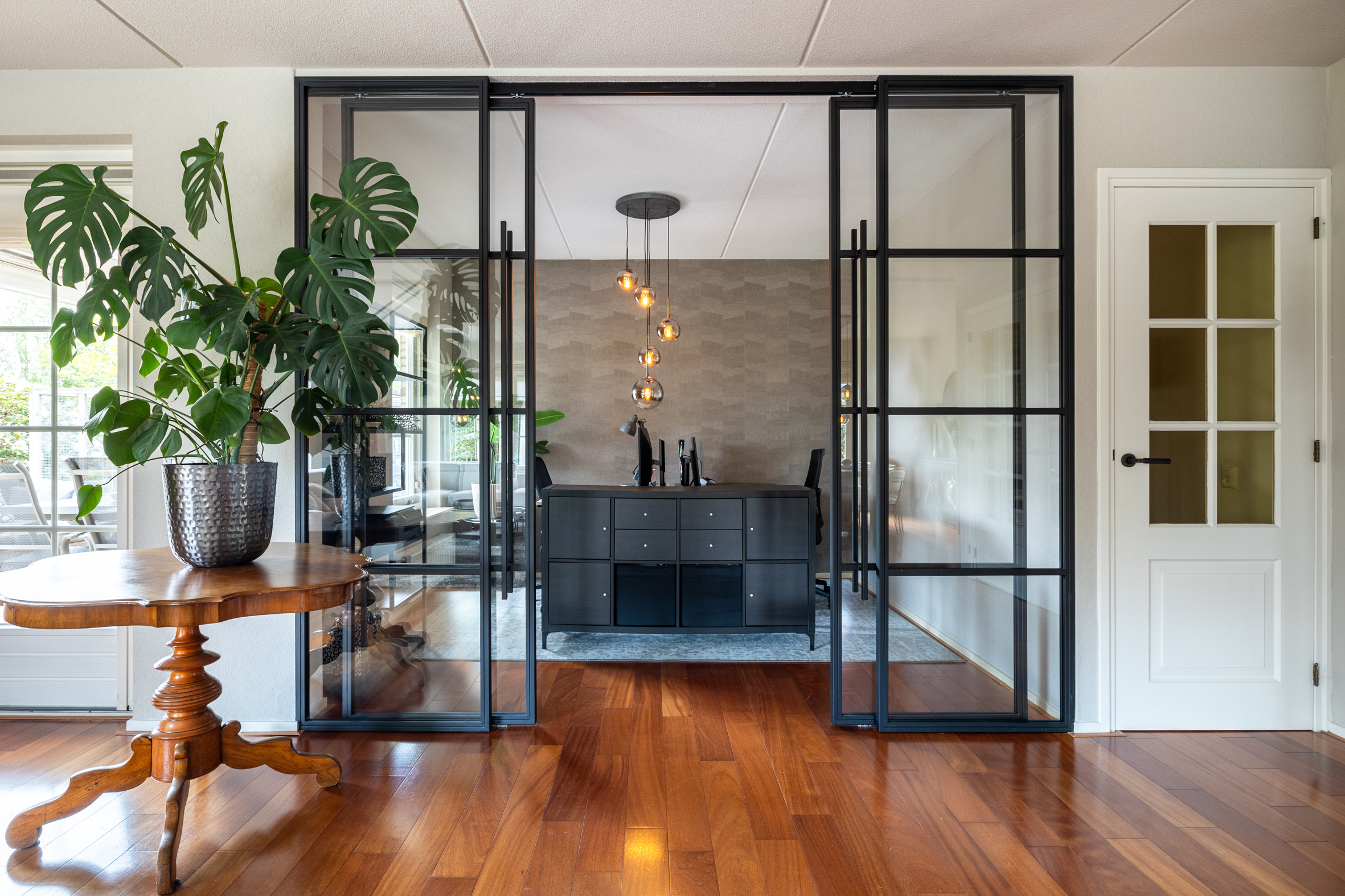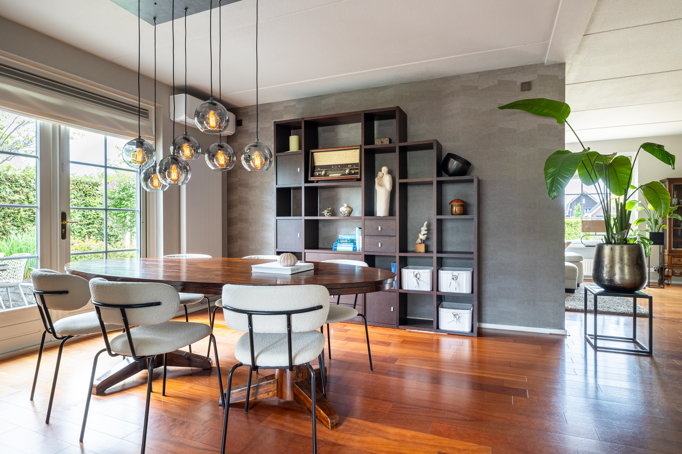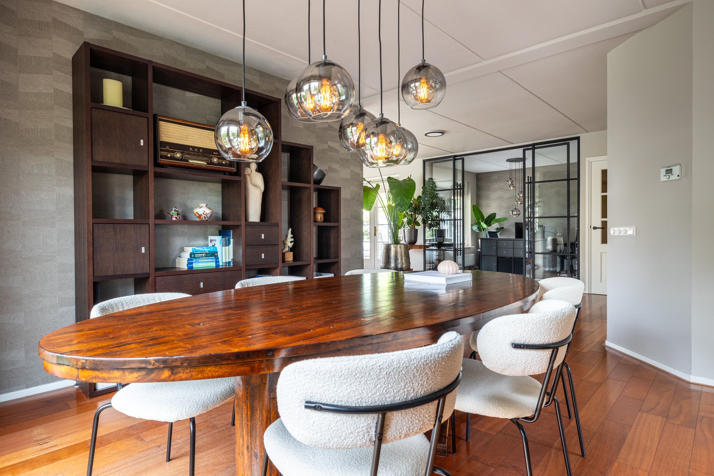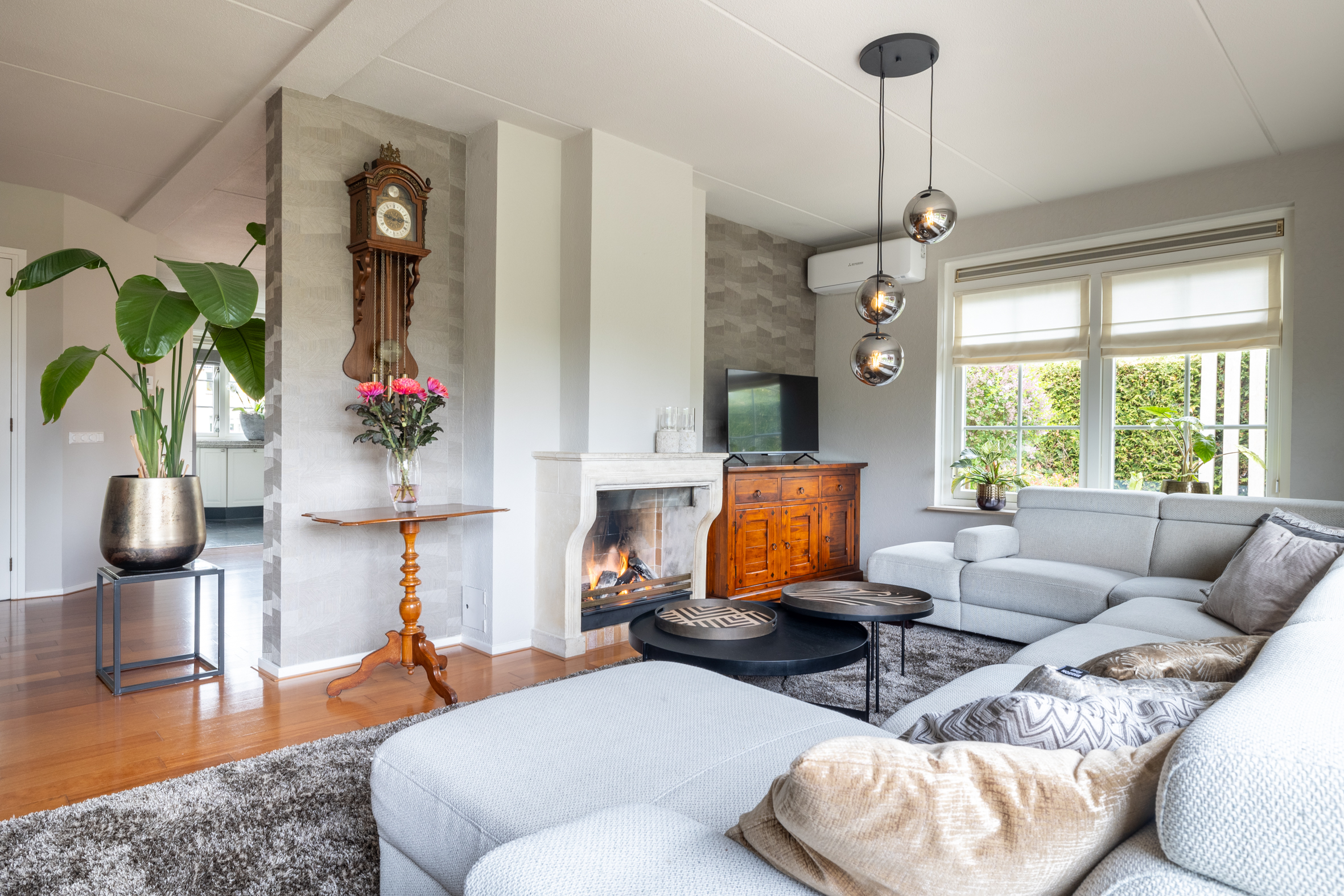 Via de ruime oprit bereik je de entree van de woning. In de hal tref je de meterkast, garderobe, een modern toilet en de trapopgang naar boven. De woonkamer is licht en ruim opgezet, met een fraai uitzicht over de tuin. Er is een breed zitgedeelte met een zandstenen schouw met open haard, afgeschermd van het eetkamergedeelte. De openslaande deuren naar het deels overdekte terras zorgen voor een fijne verbinding tussen binnen en buiten. Vanuit de living is de werkkamer bereikbaar, afgeschermd met industriële schuifdeuren met glas, zo is werken aan huis gemakkelijk en comfortabel. Het eetkamergedeelte ligt in lijn met de half open keuken en hier zijn openslaande deuren naar de zijtuin gemaakt. Vanuit de woonkamer is toegang naar de kelder van circa 8 m² groot.