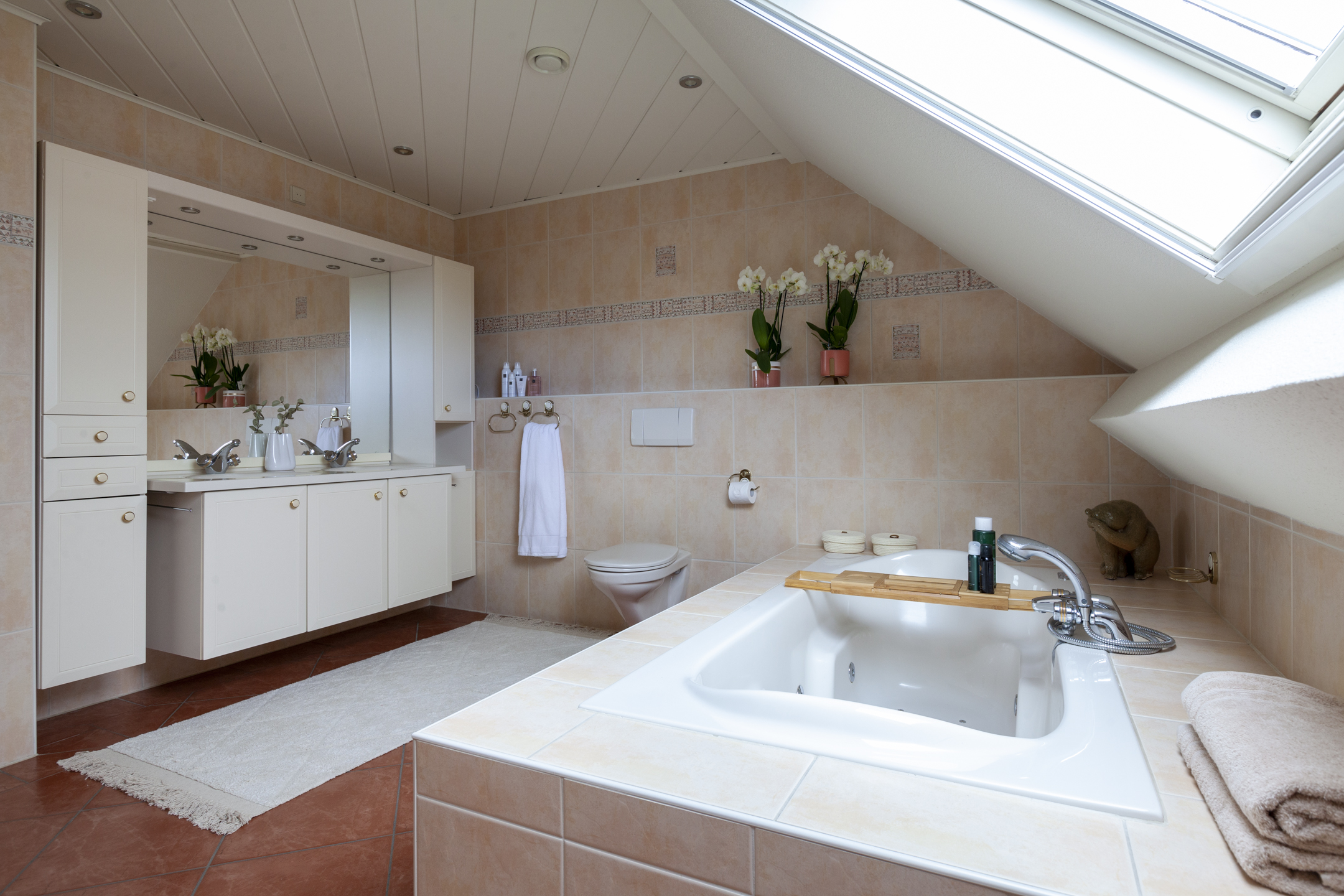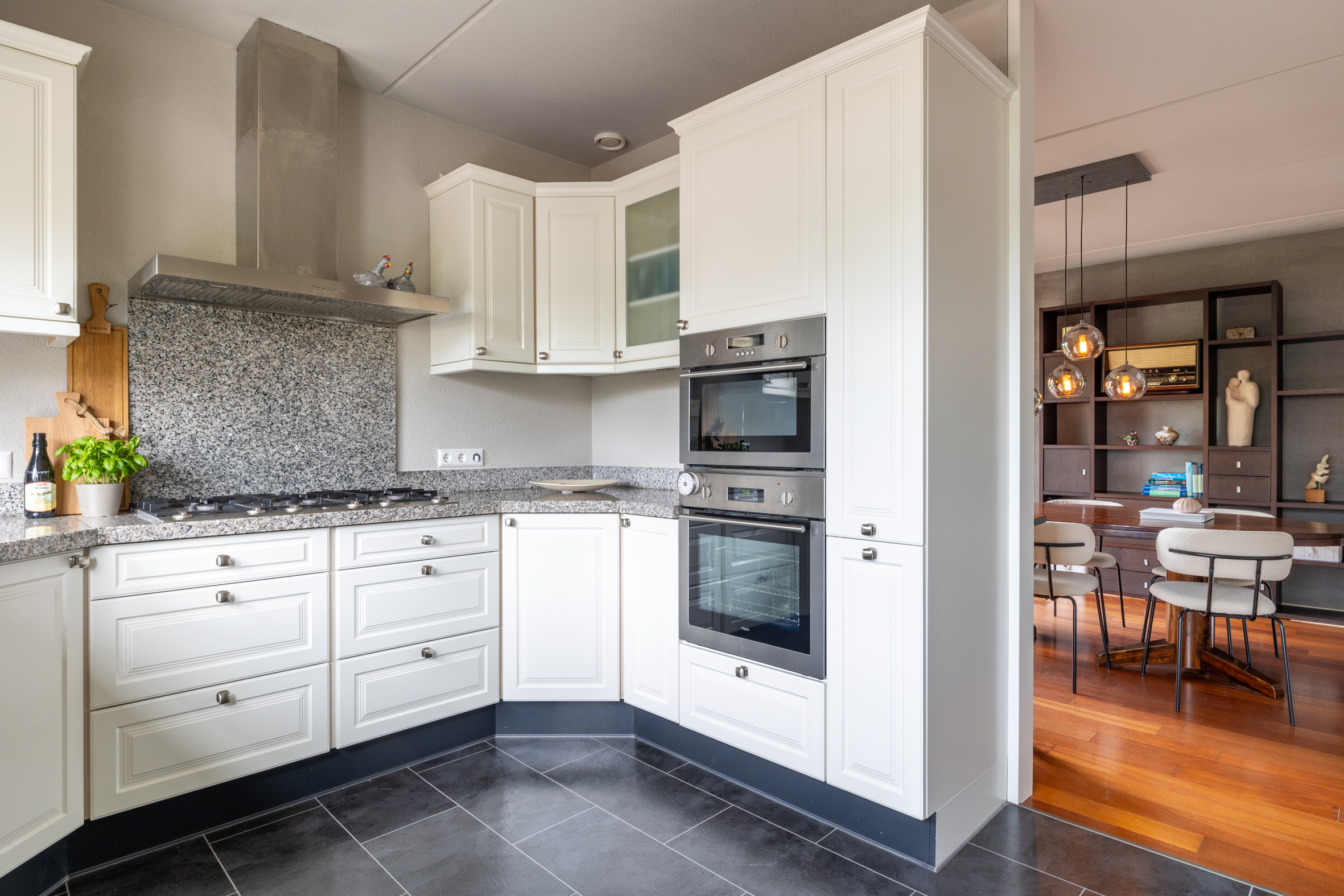 Aansluitend bevindt zich de gezellige keuken aan de voorzijde die is uitgerust met diverse inbouwapparatuur zoals een gaskookplaat, afzuigkap, vaatwasser, oven, combi-oven, een koel-vriescombinatie en voldoende werk- en bergruimte. Hier kun je heerlijk koken terwijl je uitkijkt over de omgeving.
