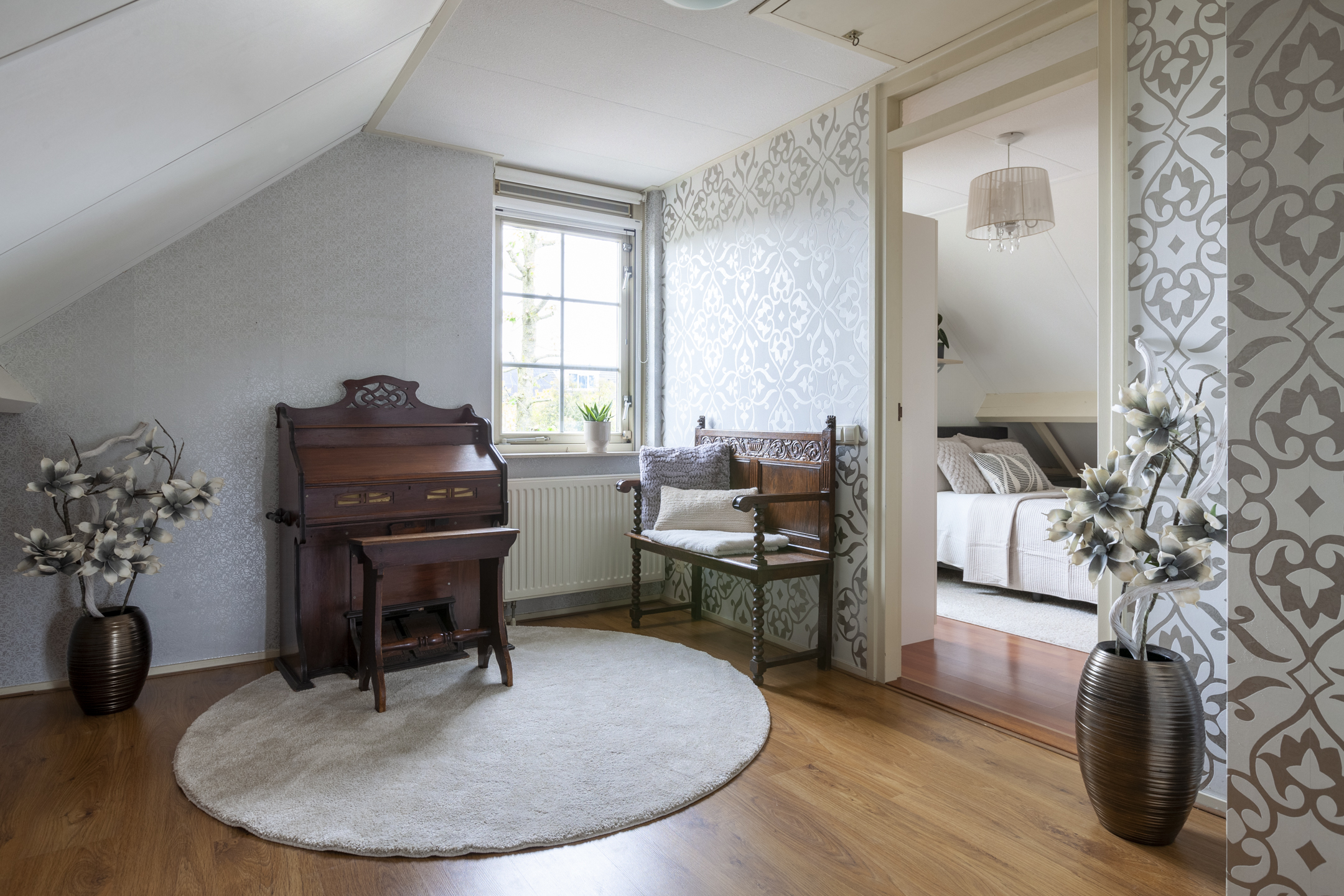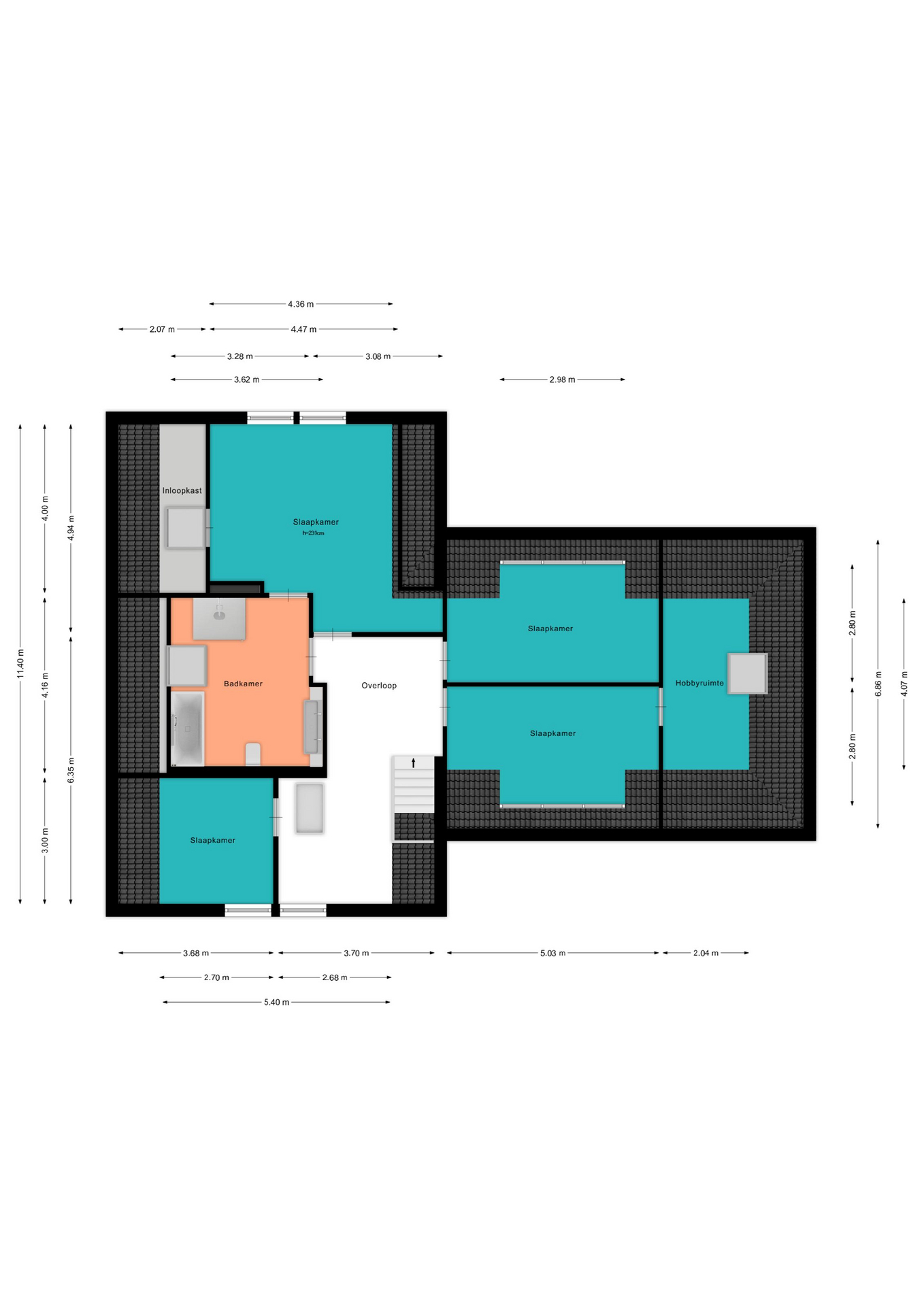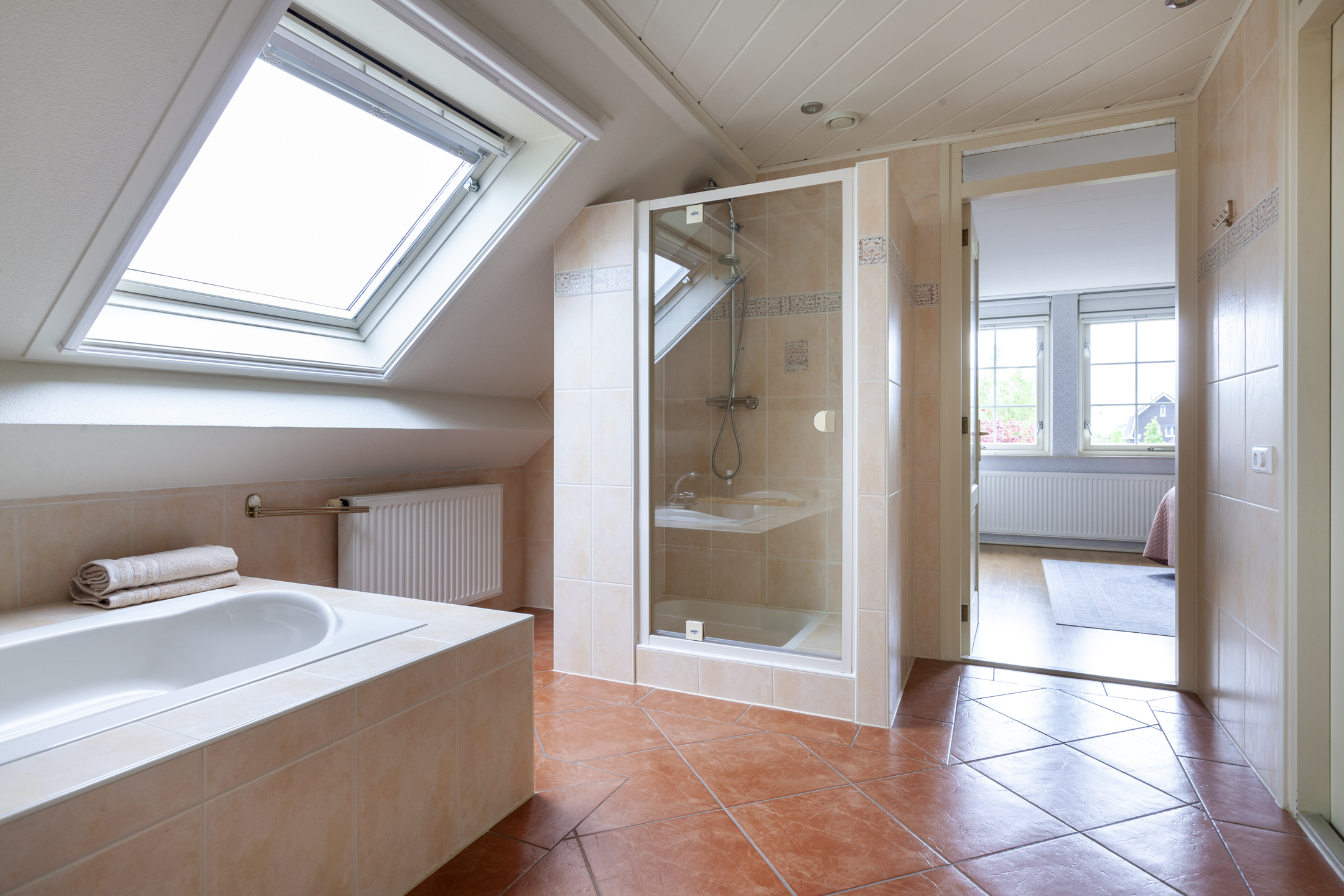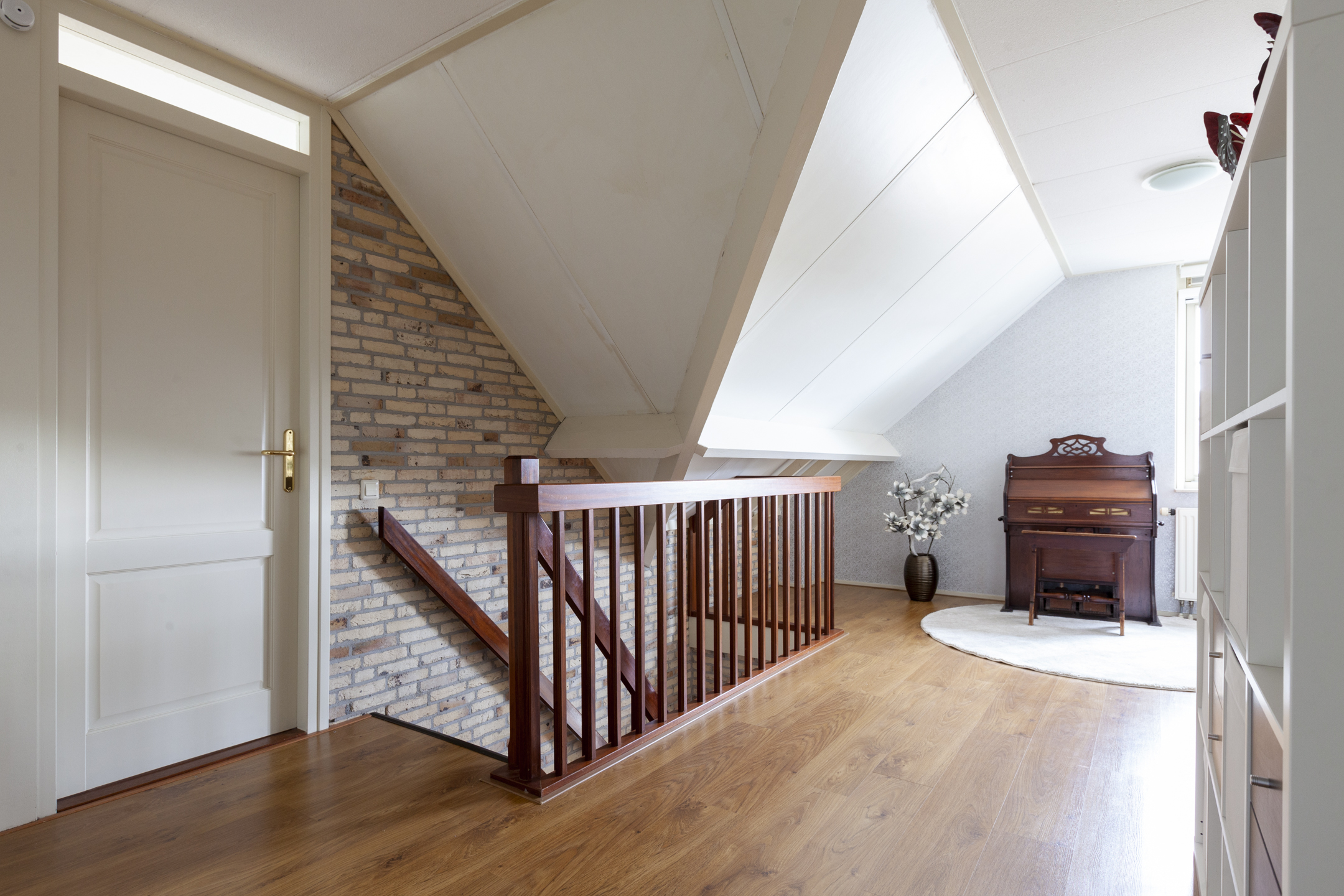 De brede overloop heeft een raam voor de juiste lichtinval en een luik met een vlizotrap naar de grote bergzolder. Er zijn vier slaapkamers, een hobbykamer en een ruime badkamer op deze woonlaag. De masterbedroom heeft een inloopkast en een eigen toegang naar de badkamer. De badkamer is circa 16 m² groot en heeft een extra deur naar de overloop en een dakraam. De ruimte is ingericht met een ligbad, wastafelmeubel, douchehoek en een tweede toilet. Aan de andere zijde van de badkamer ligt de tweede slaapkamer met een gevelraam. De derde en vierde slaapkamer liggen deels boven de garage en zijn beide voorzien van een dakkapel. De vierde slaapkamer heeft een doorgang naar de hobbykamer die is voorzien van een dakraam.