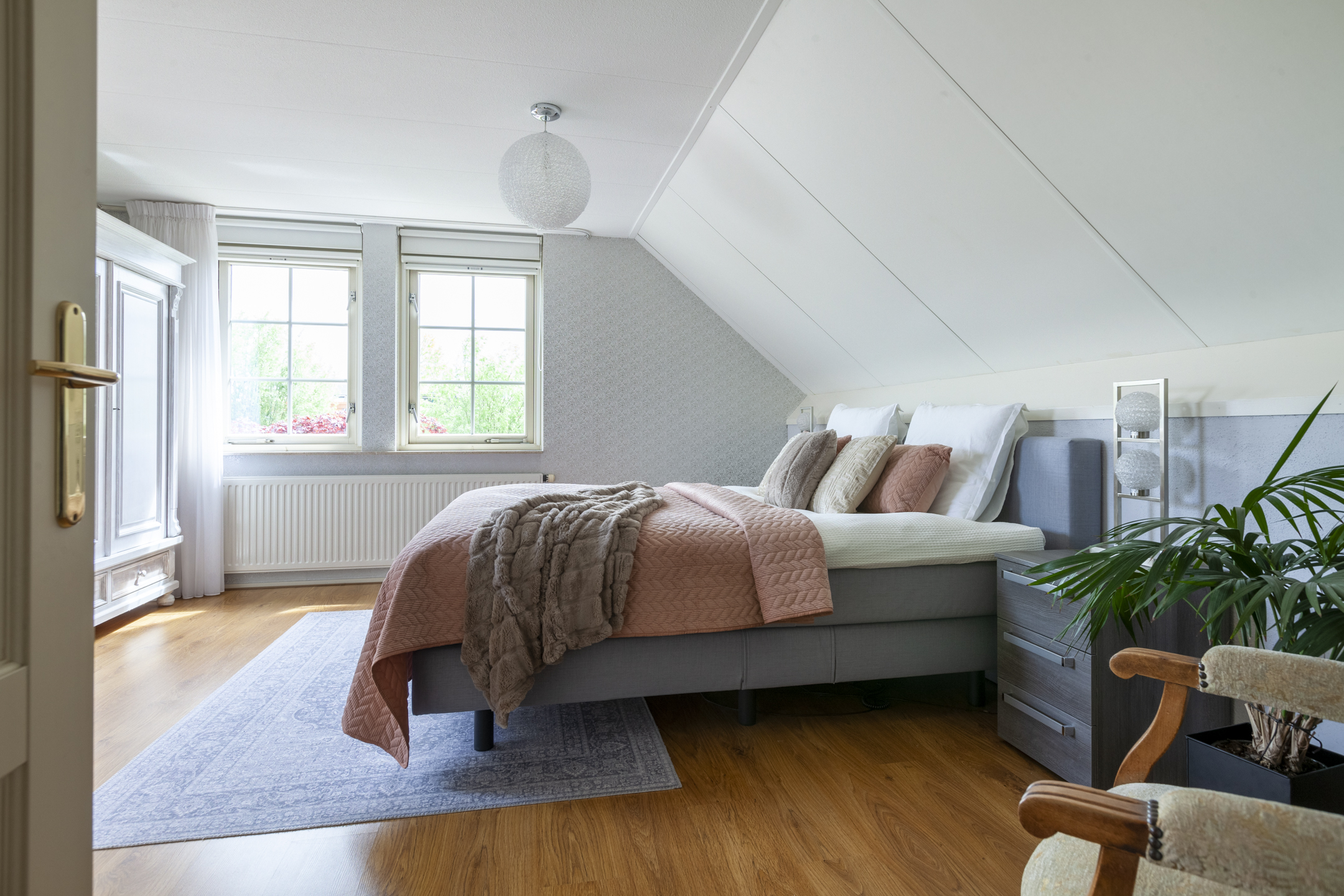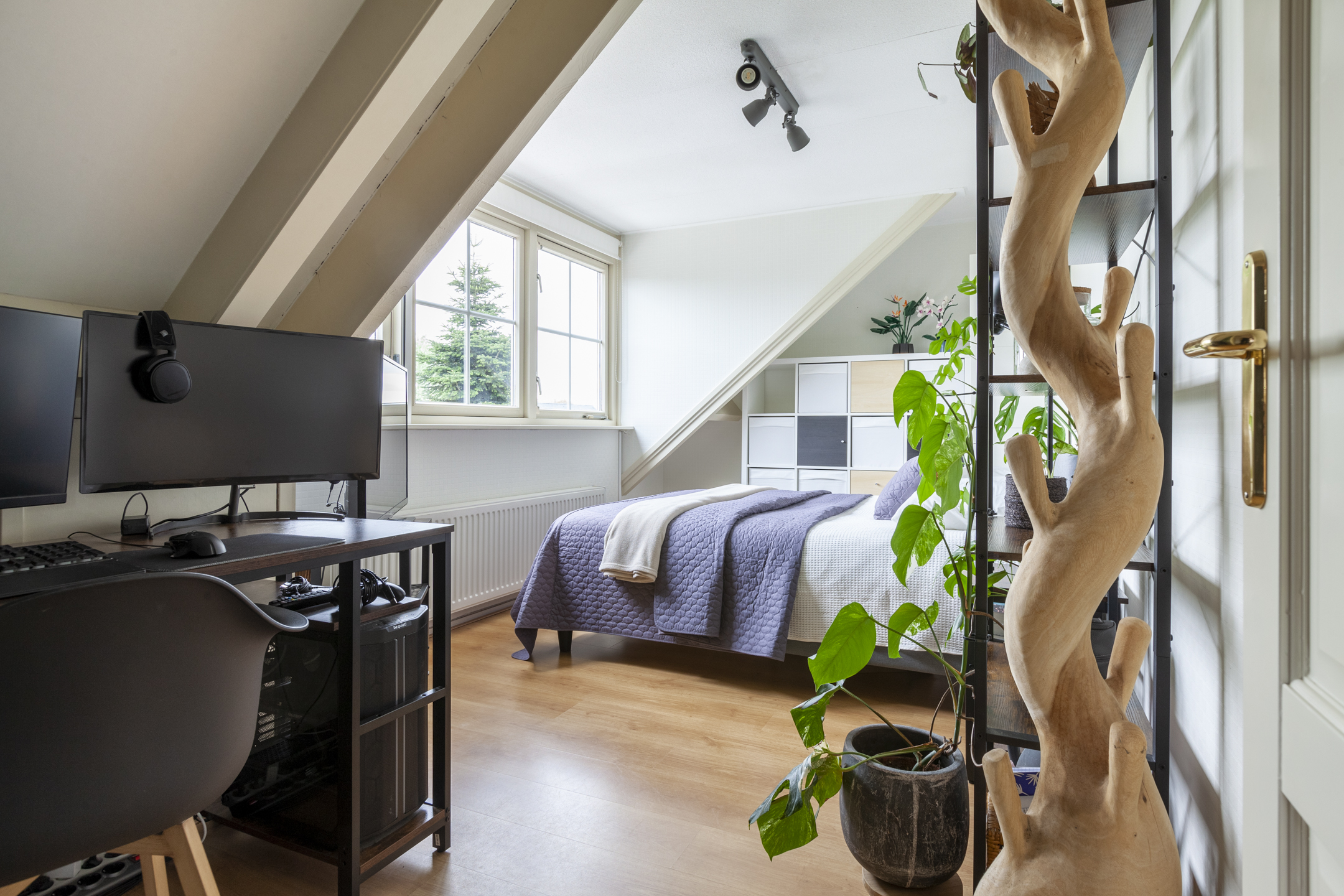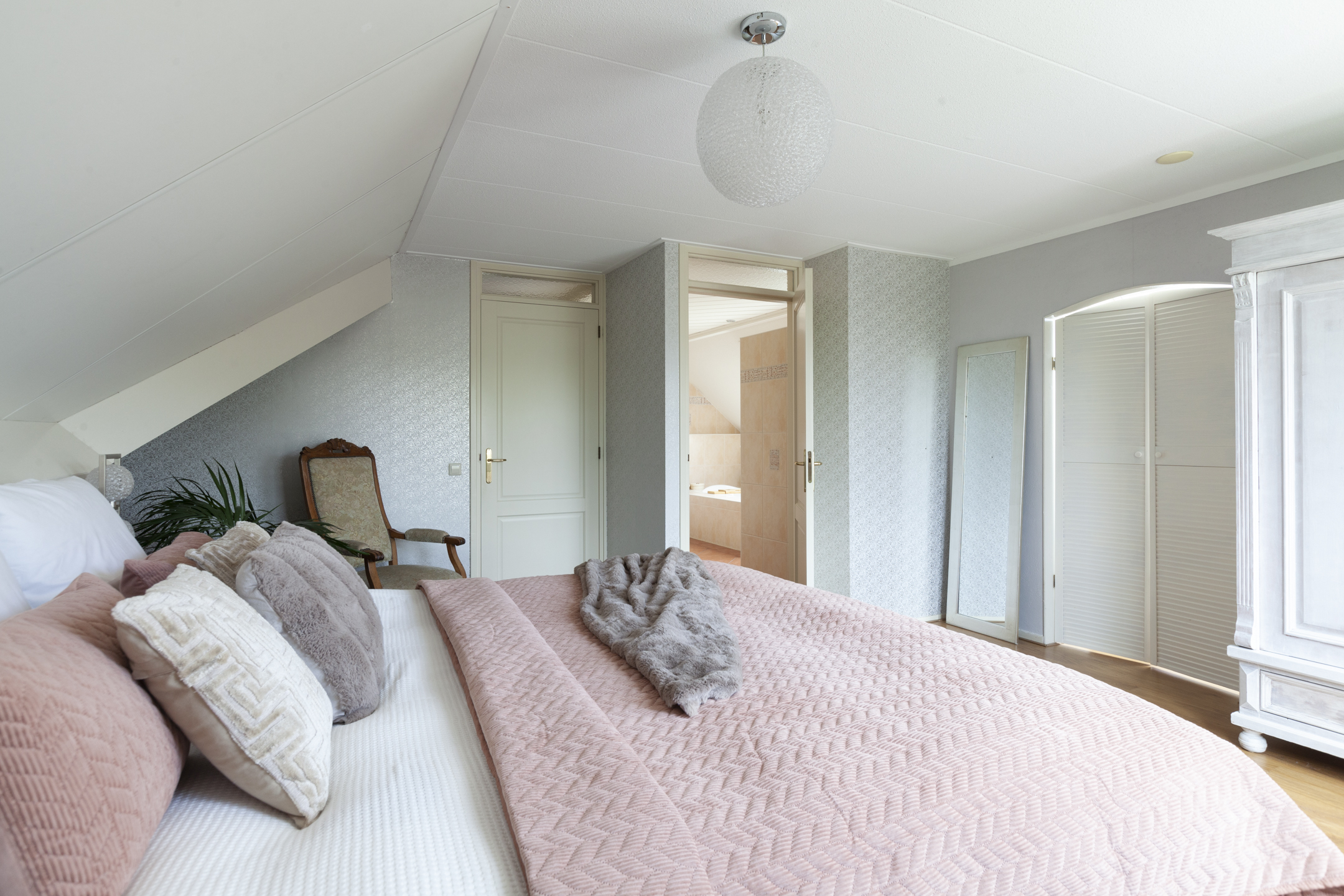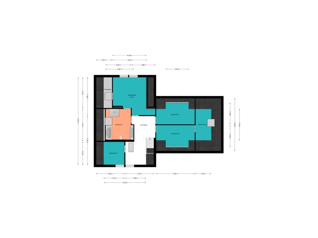 De brede overloop heeft een raam voor de juiste lichtinval en een luik met een vlizotrap naar de grote bergzolder. Er zijn vier slaapkamers, een hobbykamer en een ruime badkamer op deze woonlaag. De masterbedroom heeft een inloopkast en een eigen toegang naar de badkamer. De badkamer is circa 16 m² groot en heeft een extra deur naar de overloop en een dakraam. De ruimte is ingericht met een ligbad, wastafelmeubel, douchehoek en een tweede toilet. Aan de andere zijde van de badkamer ligt de tweede slaapkamer met een gevelraam. De derde en vierde slaapkamer liggen deels boven de garage en zijn beide voorzien van een dakkapel. De vierde slaapkamer heeft een doorgang naar de hobbykamer die is voorzien van een dakraam.
