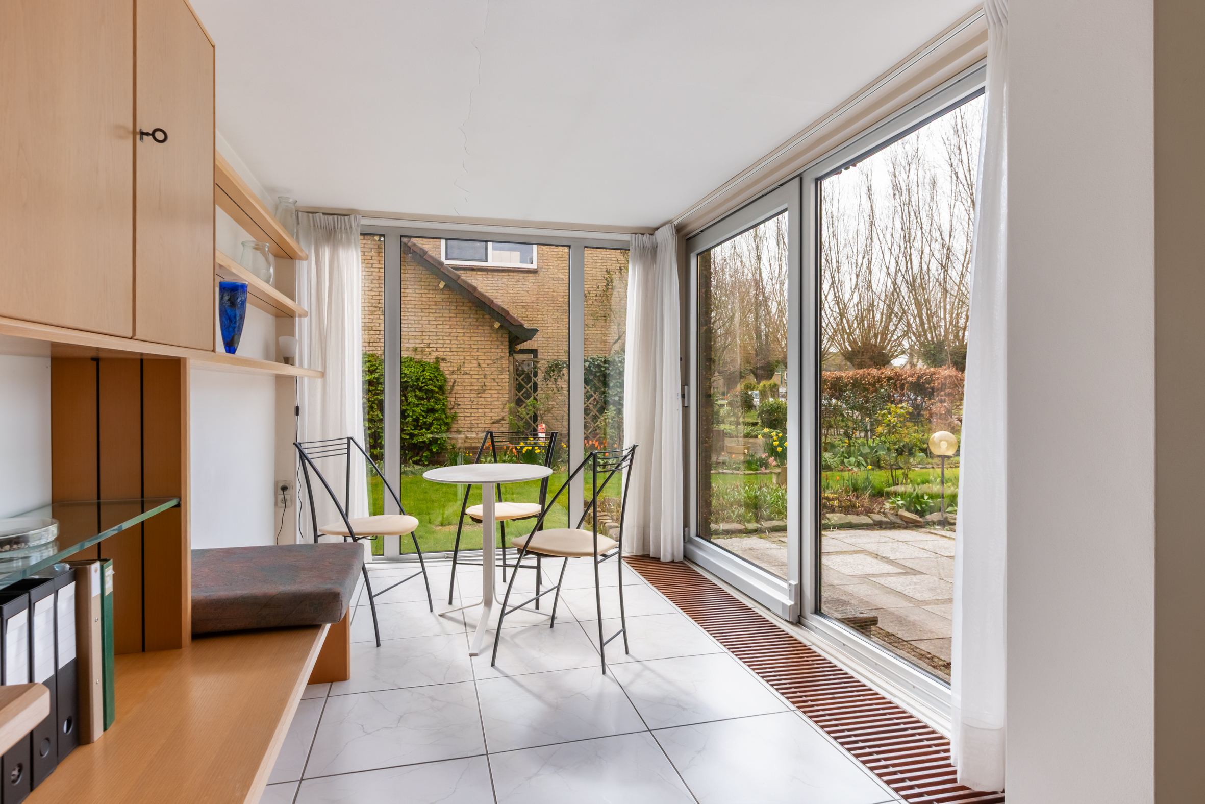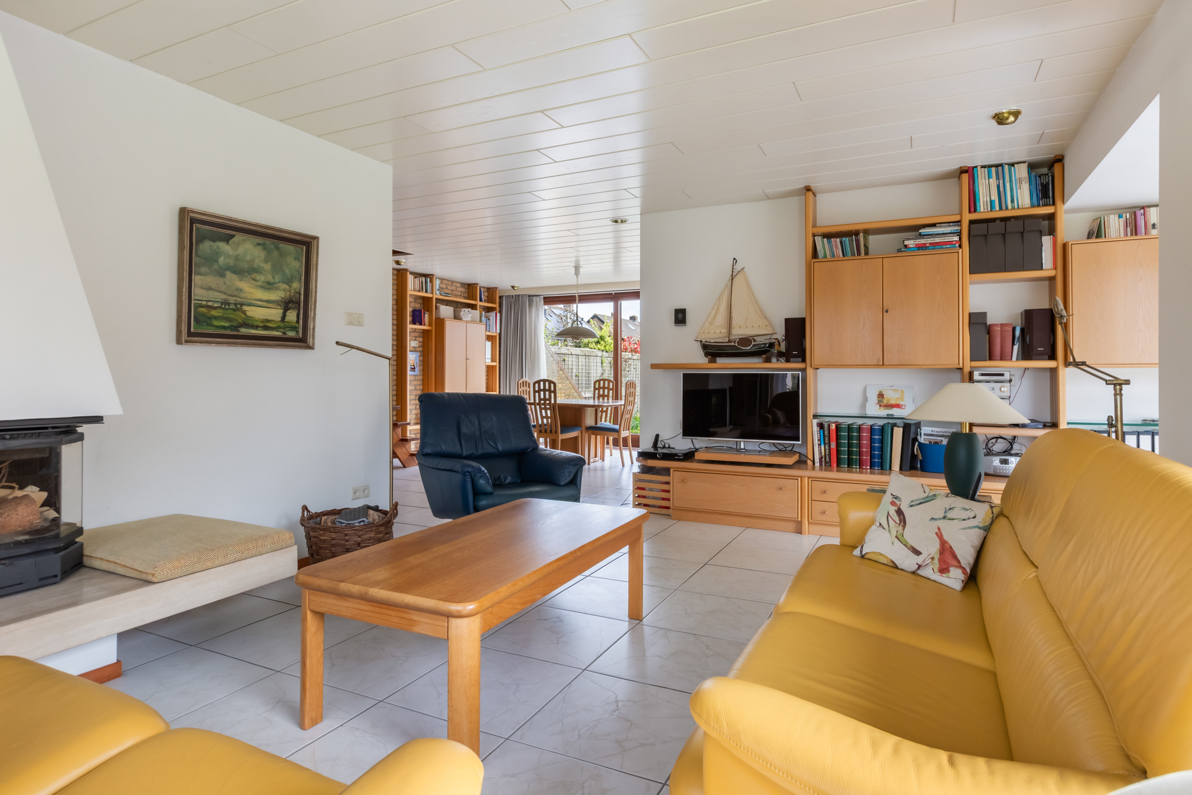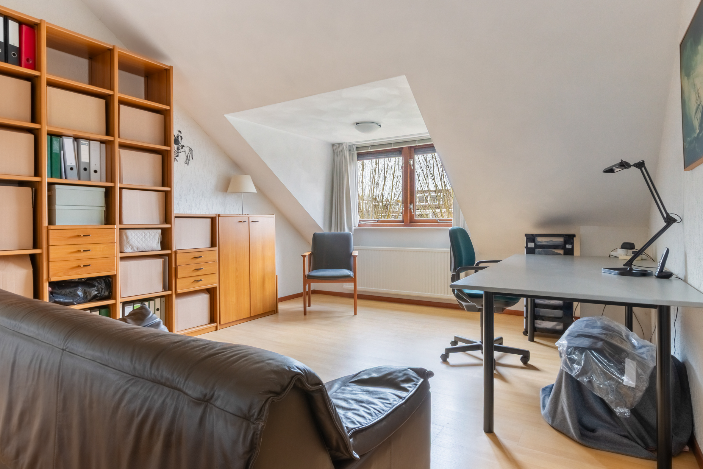 Aan de voorzijde van de woning vind je het sfeervolle zitgedeelte, met open haard en grote raampartijen die zorgen voor veel lichtinval en een vrij uitzicht over de groene omgeving. Aansluitend bevindt zich een extra, lichte ruimte met een schuifpui naar de voortuin. Ideaal als leeshoek, speelruimte of werkplek.
