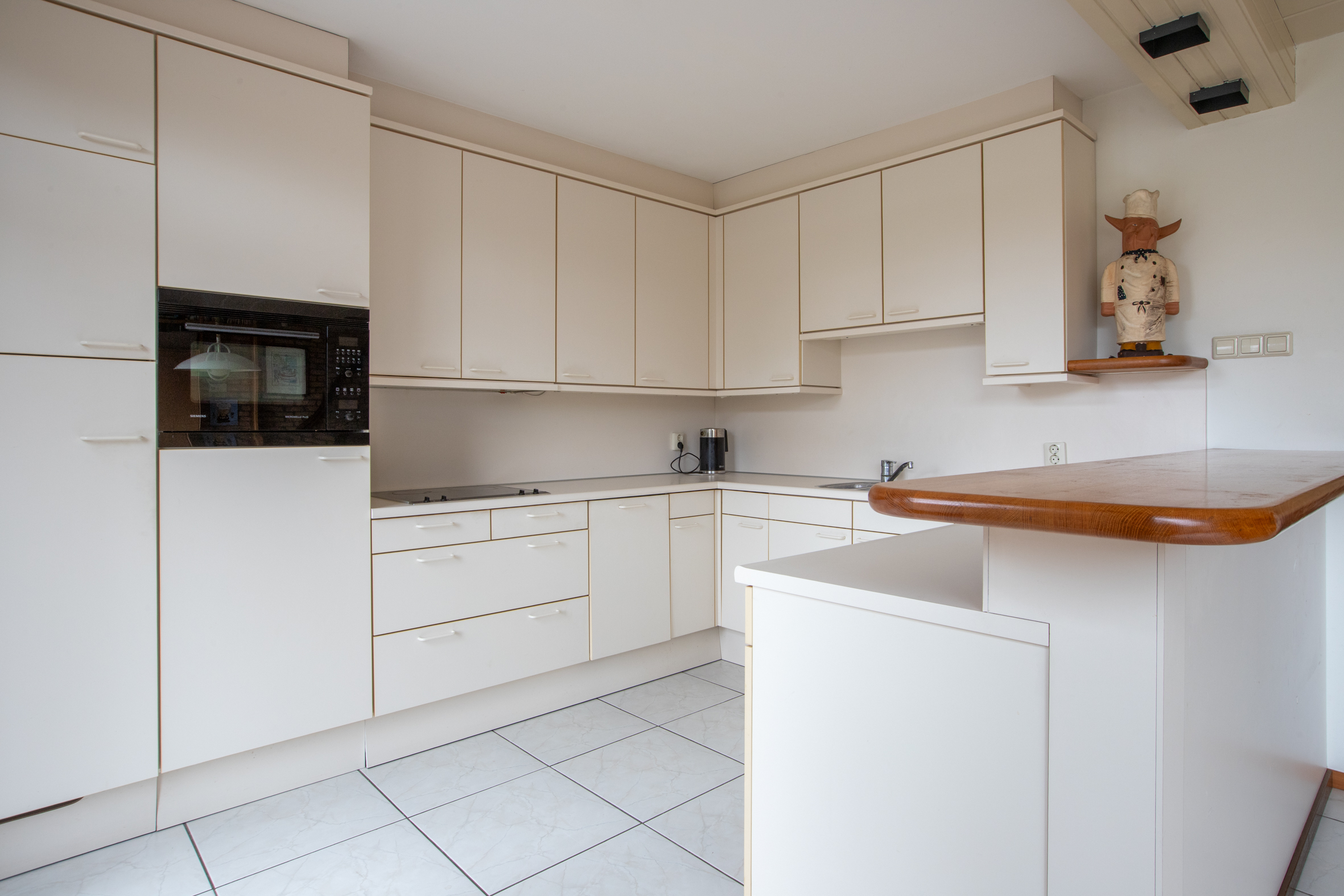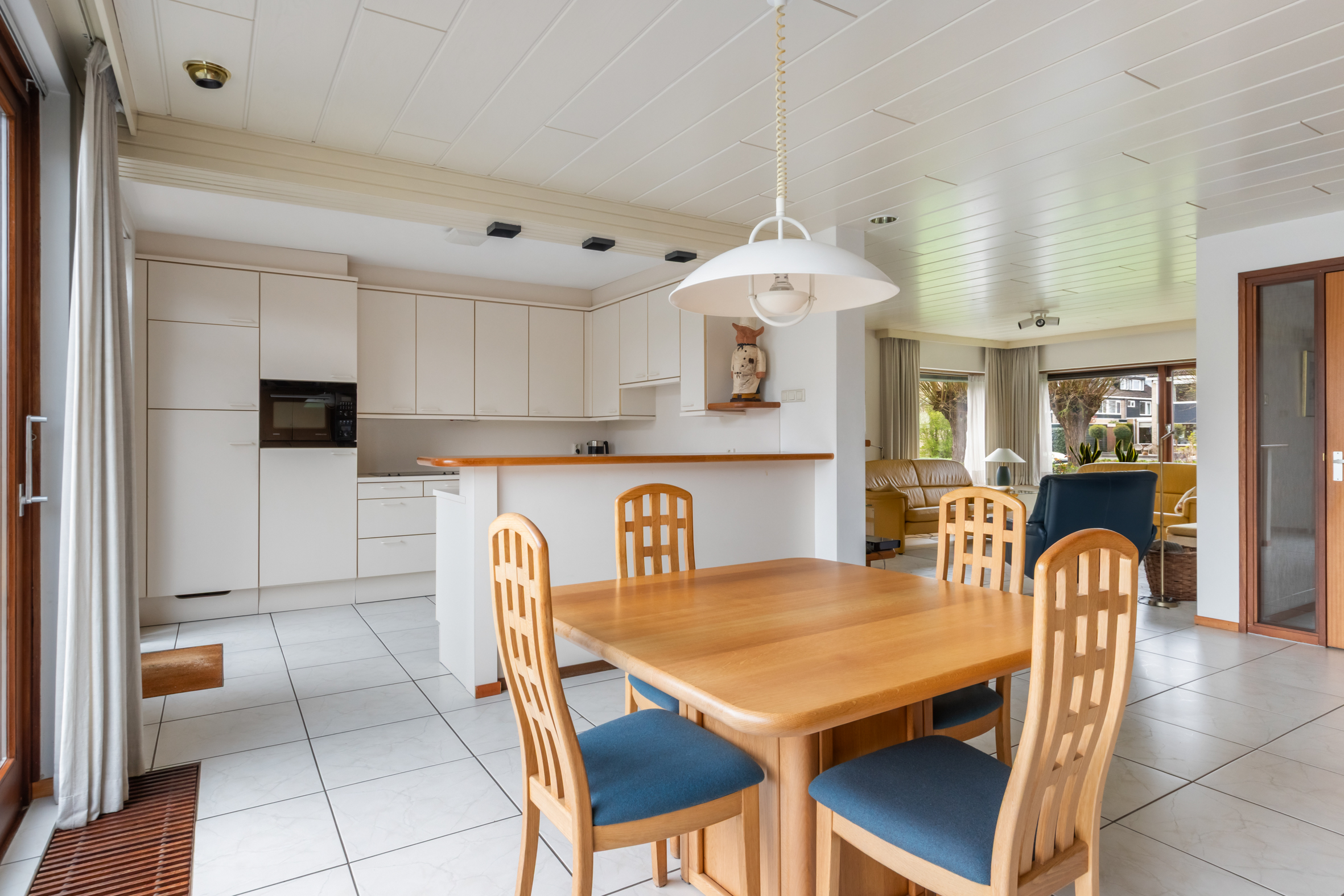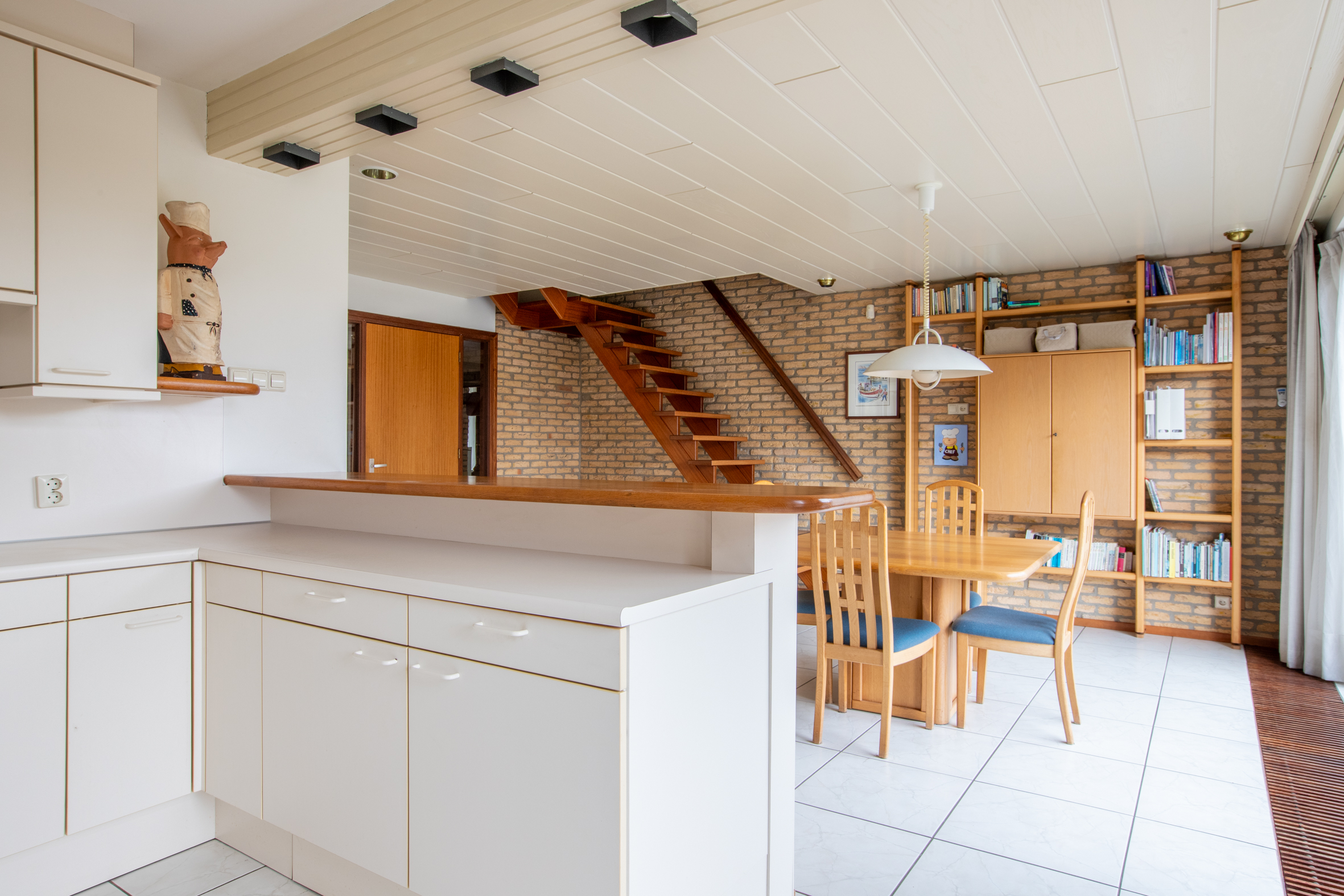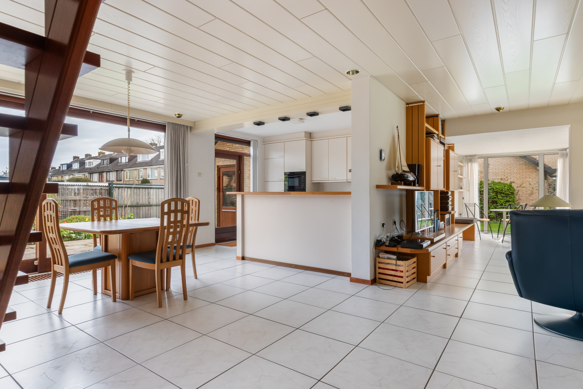 Aan de achterzijde ligt het eetgedeelte met de royale open keuken. De keuken is opgesteld in een U-vorm en vormt een sfeervolle en speelse leefruimte. Via de schuifpui of de loopdeur in de achtergevel stap je zo de zonnige achtertuin in.