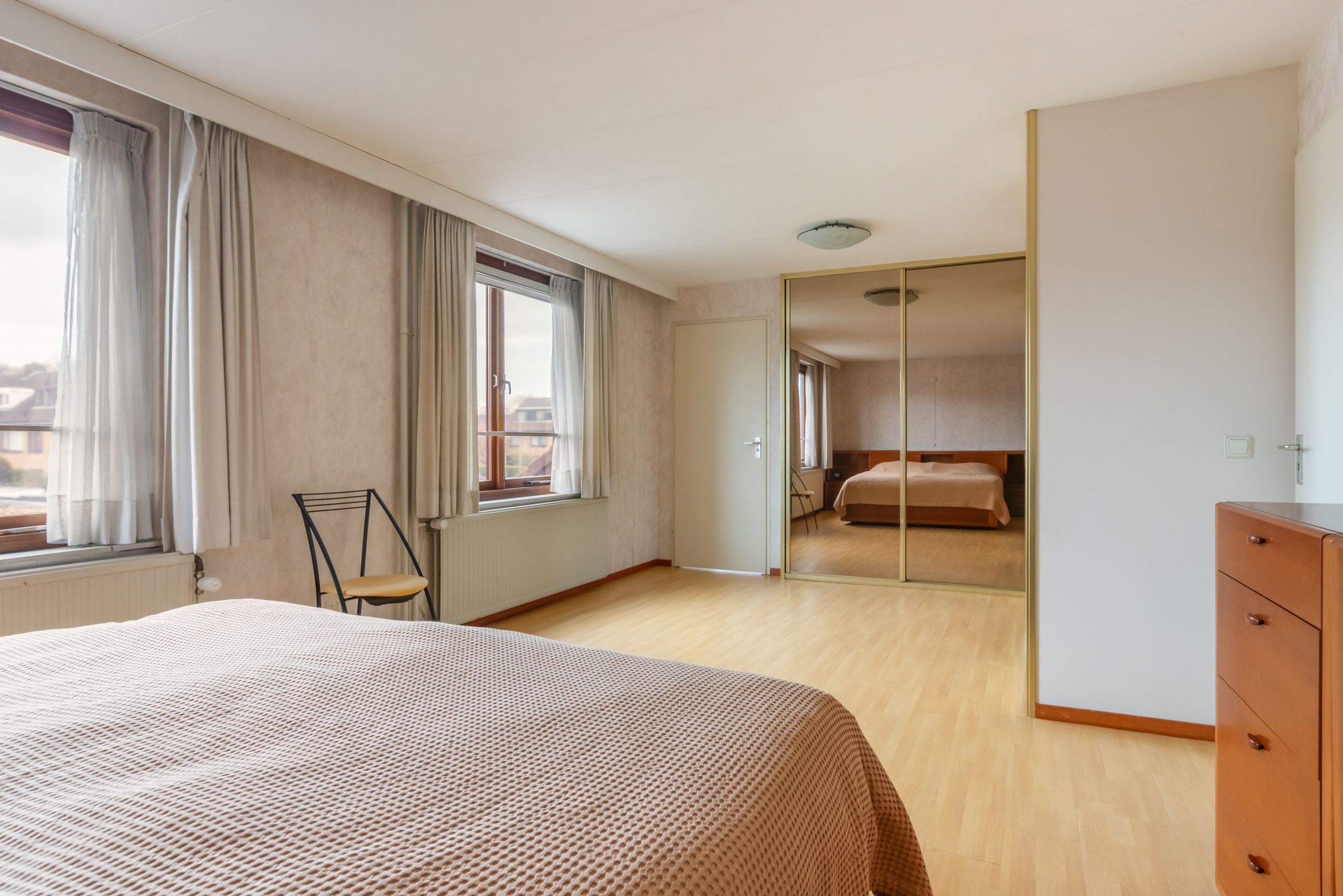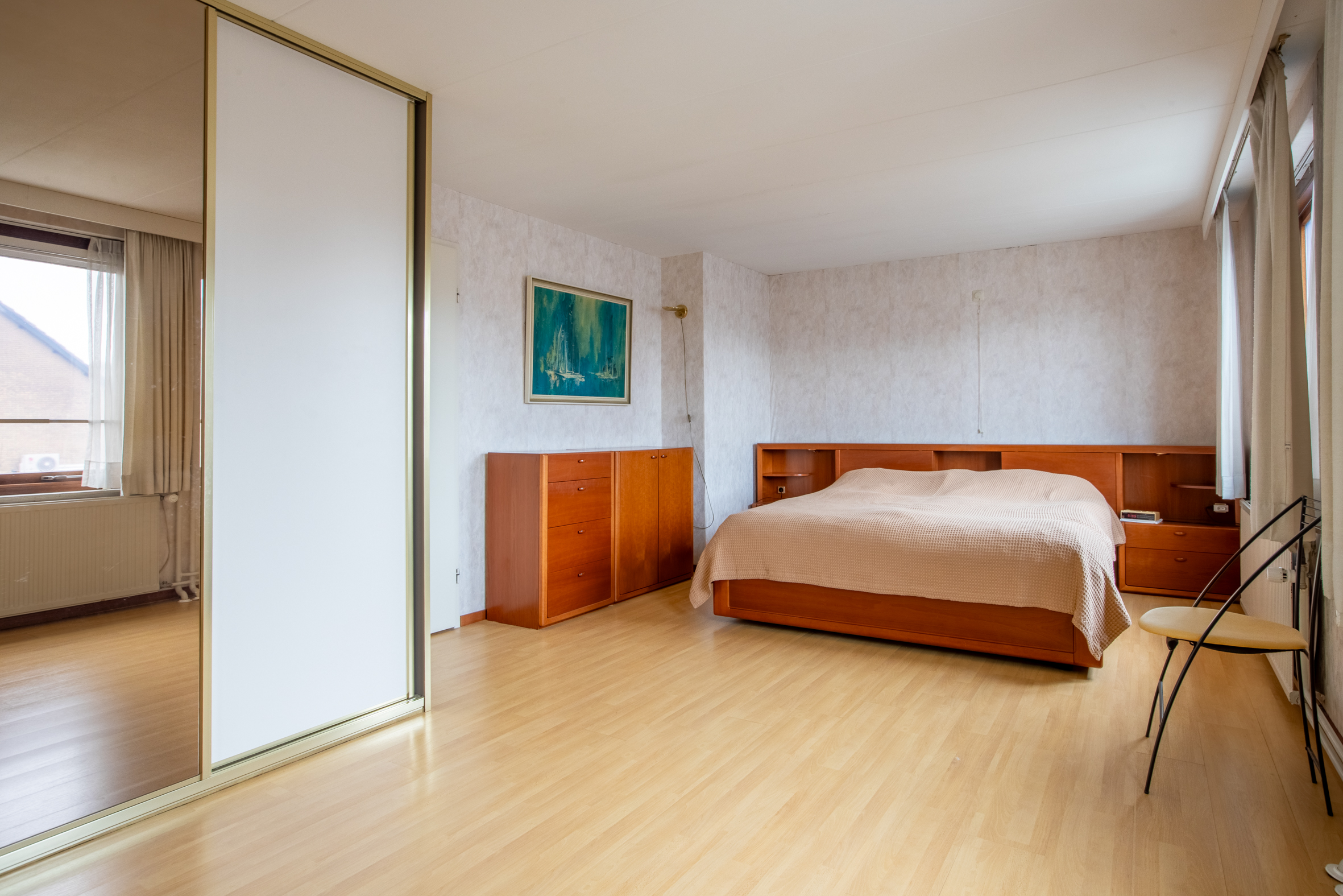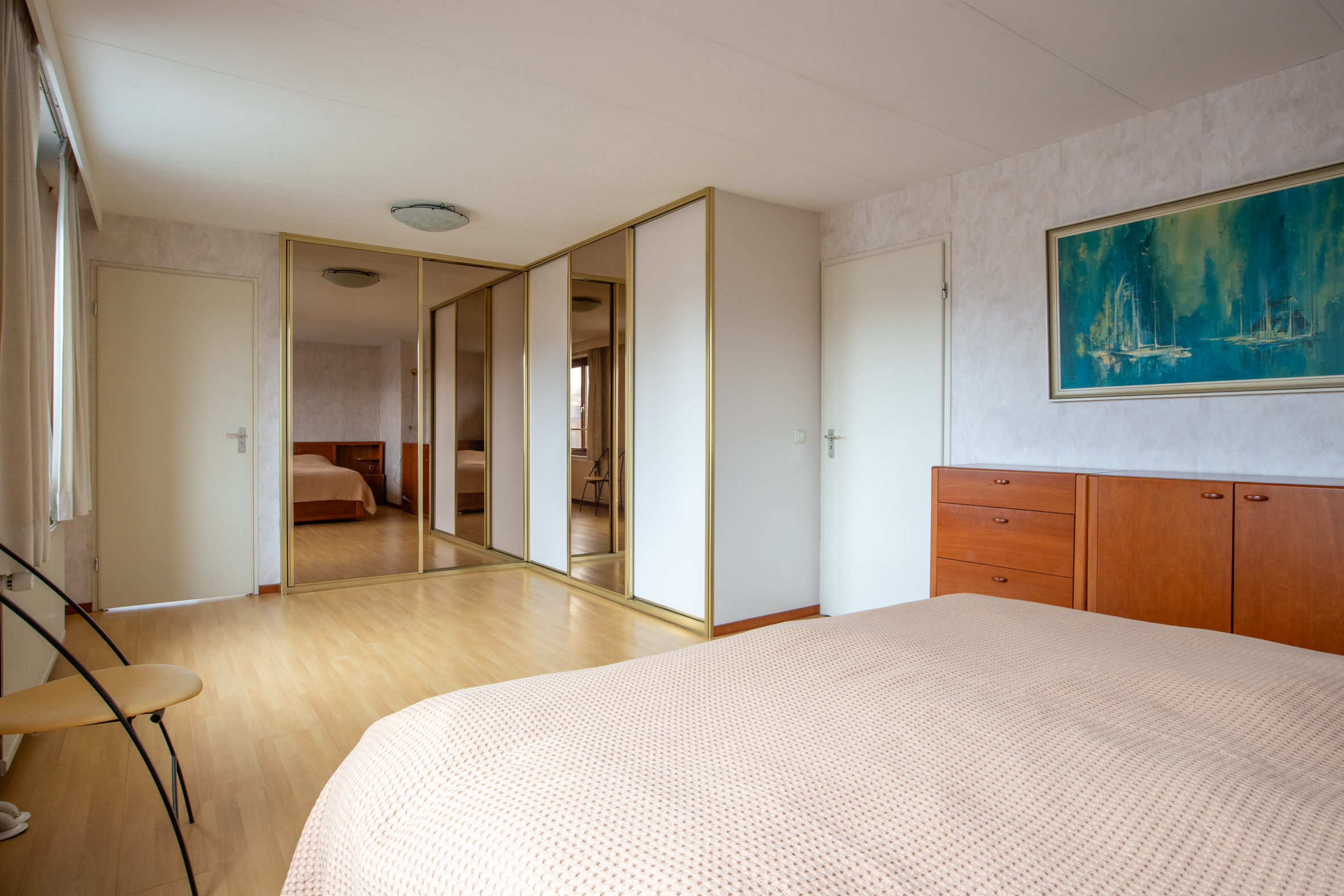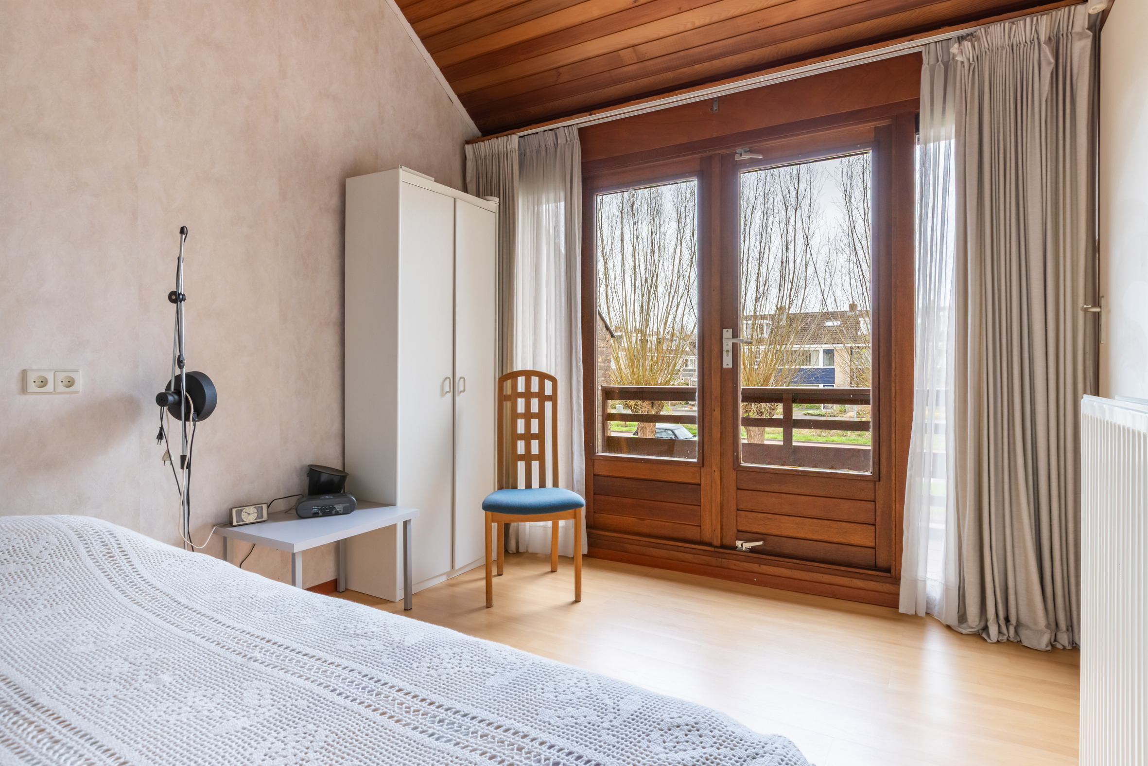 Aan de rechterzijde van de woning bevindt zich de tweede slaapkamer met een hoge nok. De openslaande deuren in deze kamer brengen je naar het balkon aan de voorzijde.
