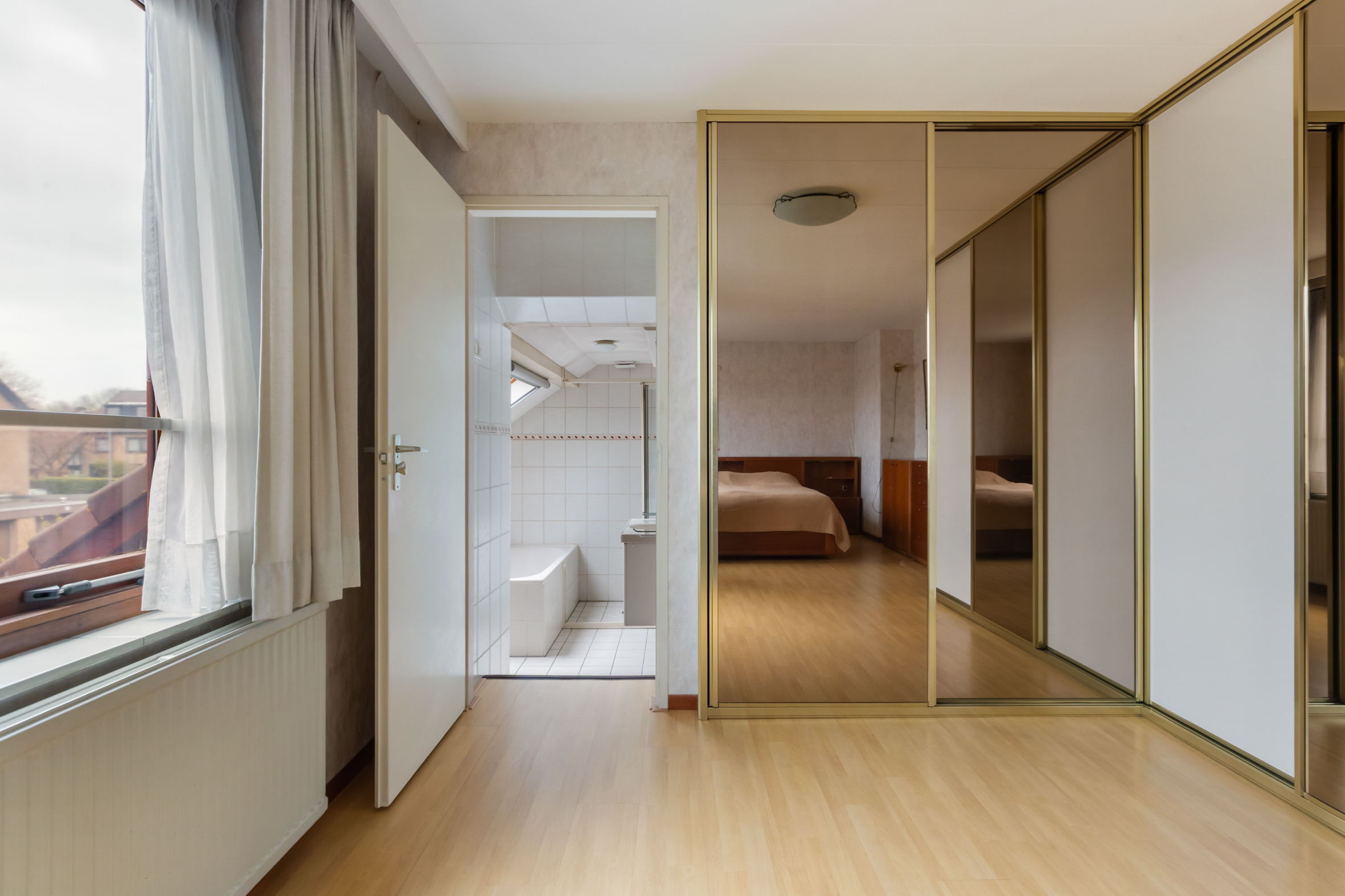 Er is verder een riante overloop die geheel naar eigen smaak en wens kan worden ingericht. De hoofdslaapkamer (voorheen twee aparte kamers) bevindt zich aan de achterzijde en strekt zich uit over de volledige breedte. Er zijn vaste kasten aanwezig en vanuit deze kamer is de tweede badkamer te bereiken. De badkamer is voorzien van een: