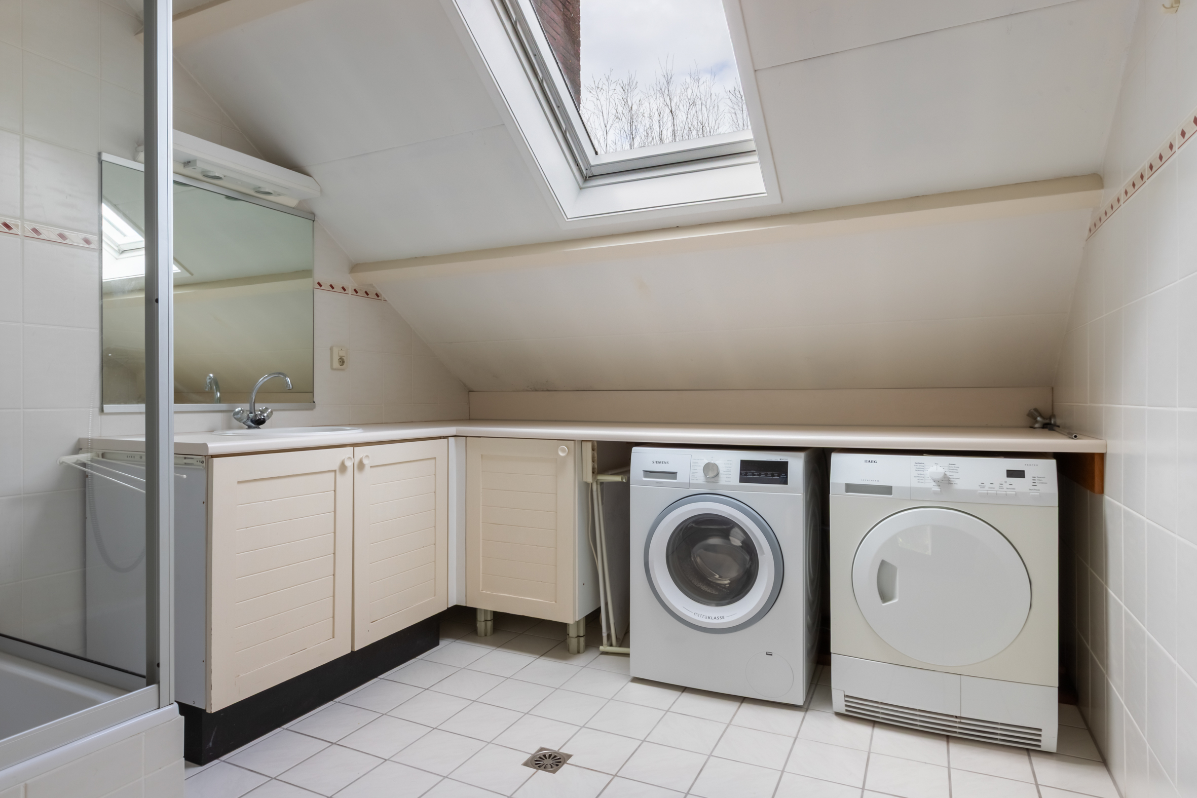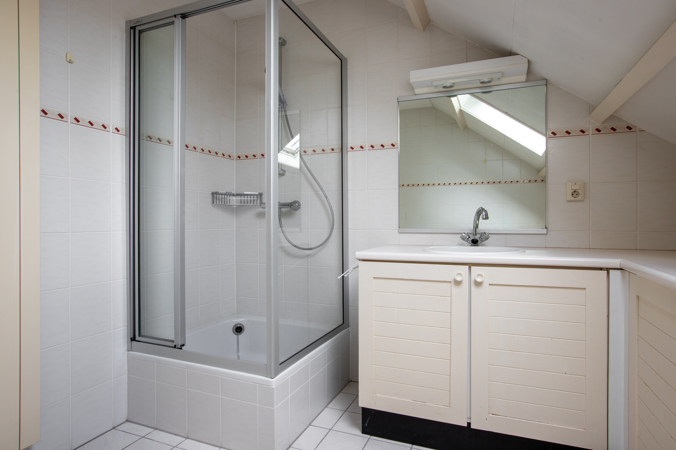 Via de open trap in de woonkamer kom je eerst bij een praktische wasruimte die tevens als badkamer is ingericht. Deze ruimte is voorzien van een douchecabine, een wastafel, handige kastruimte en de aansluitingen voor wasapparatuur. Het dakraam zorgt daarbij voor een prettige lichtinval.