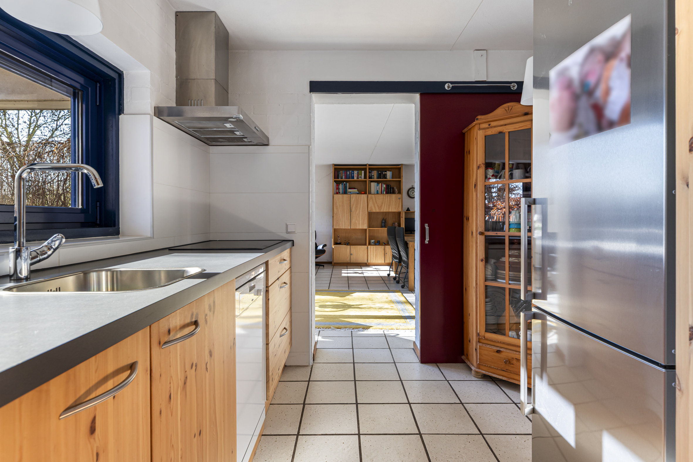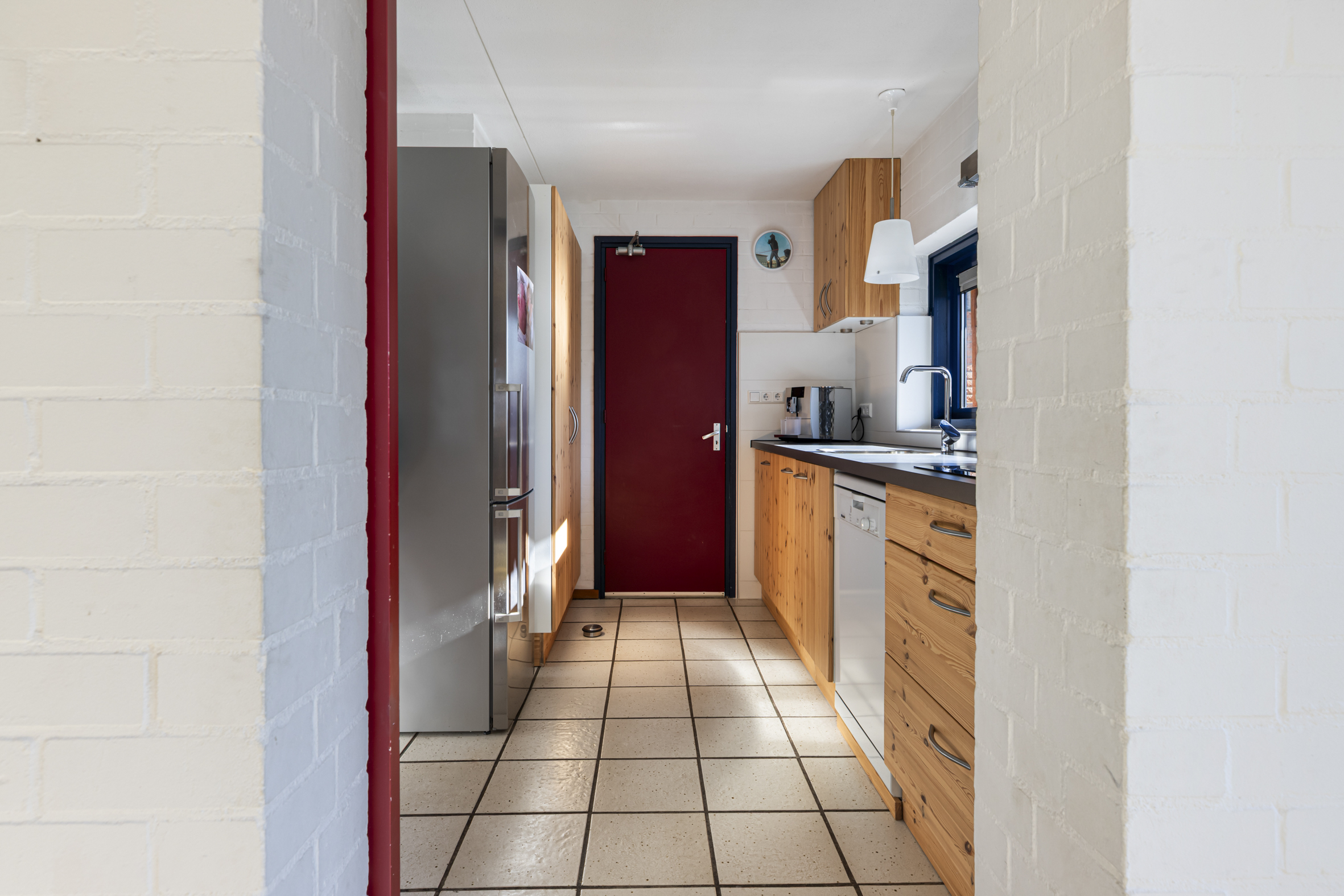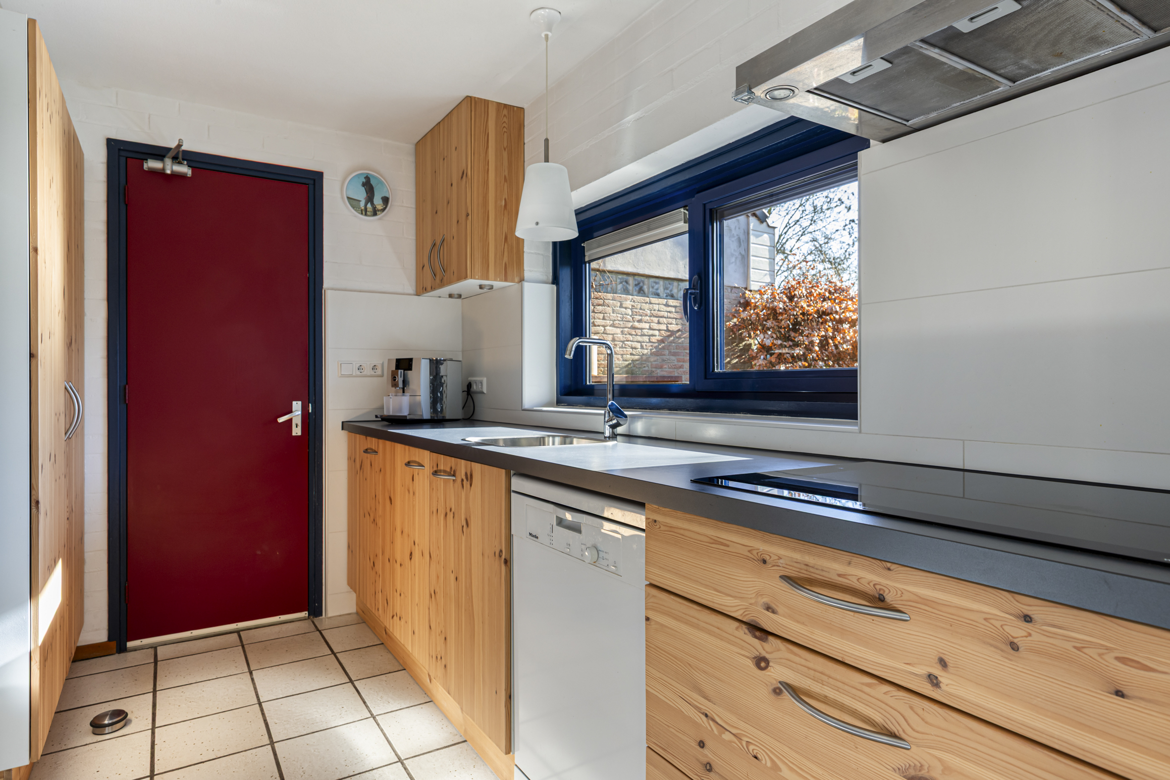 De keuken met uitzicht op de tuin staat in verbinding met de bijkeuken, waar de cv-ketel met extra boilervat zijn opgesteld. Hier is een deur naar de achtertuin en vanuit de bijkeuken is tevens de garage binnendoor bereikbaar.
