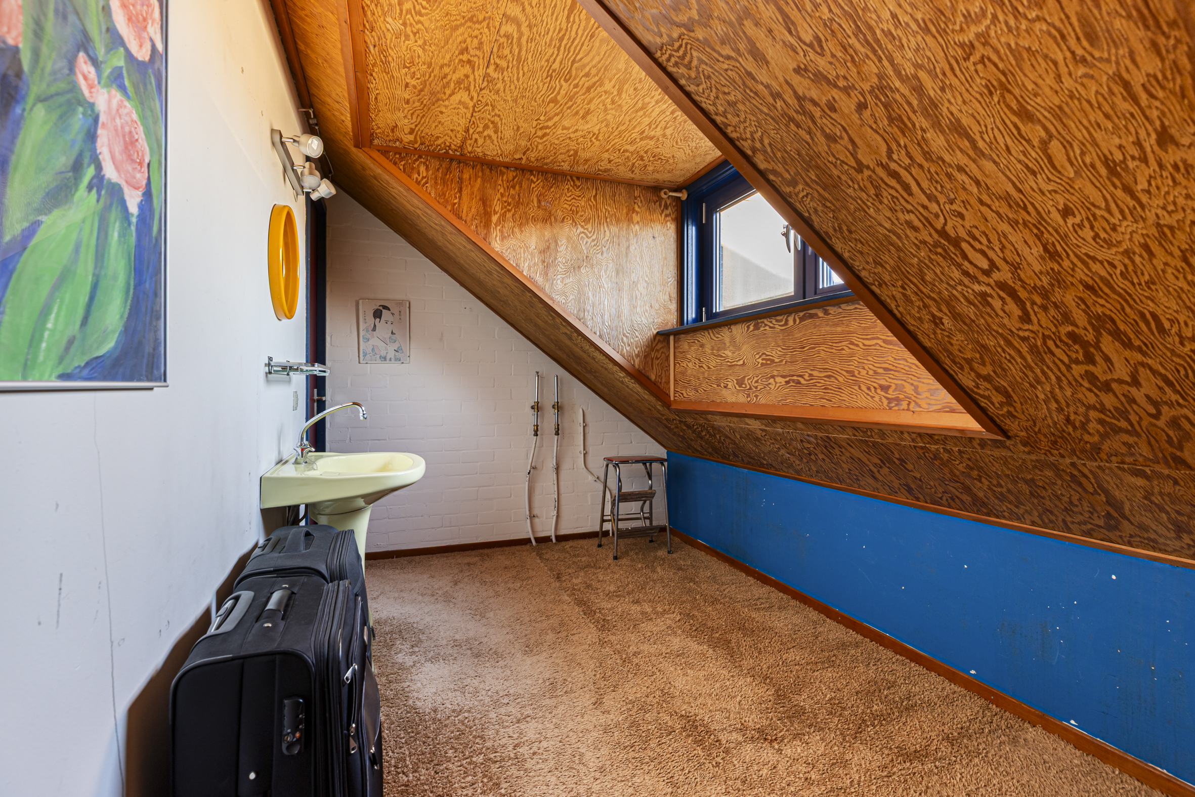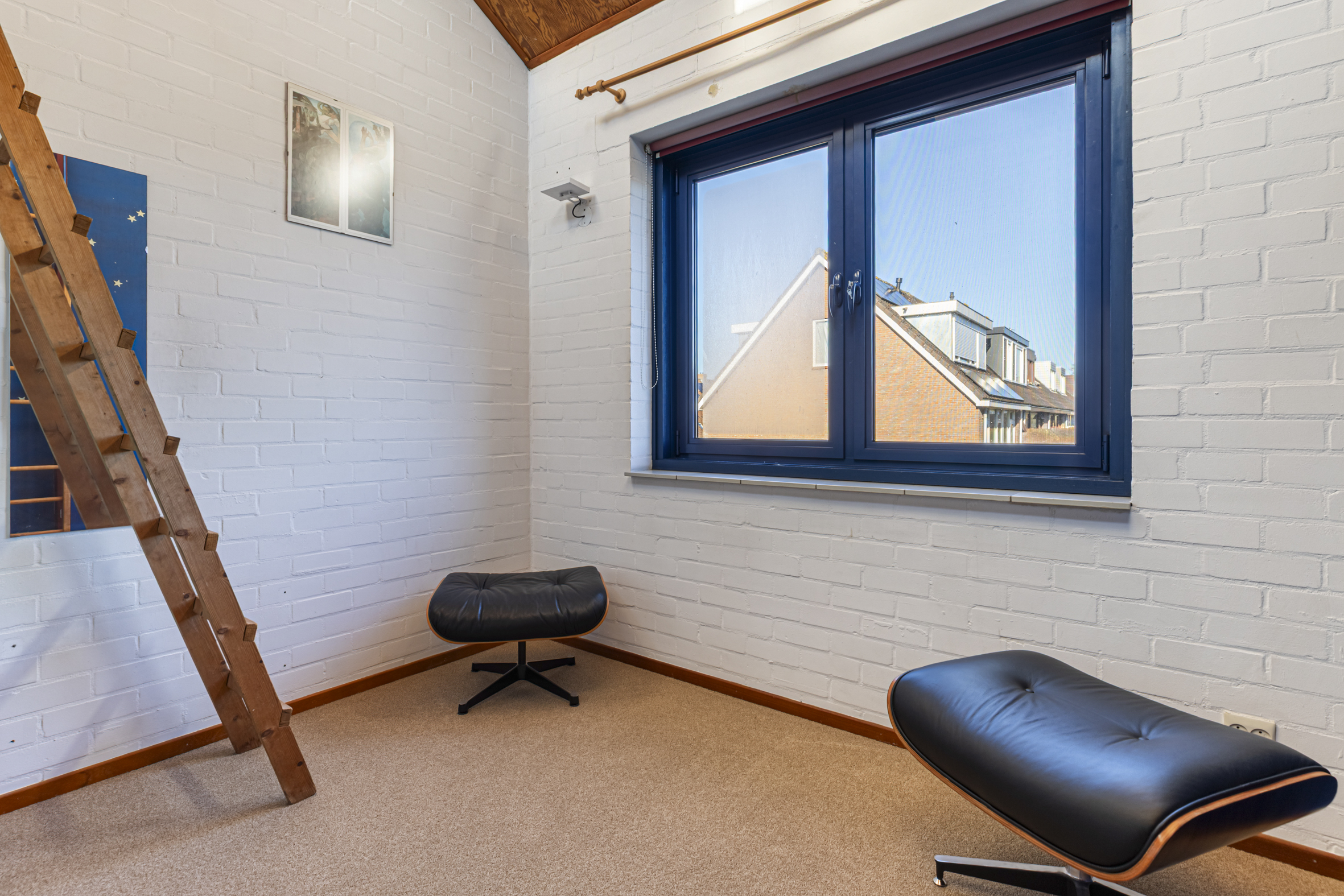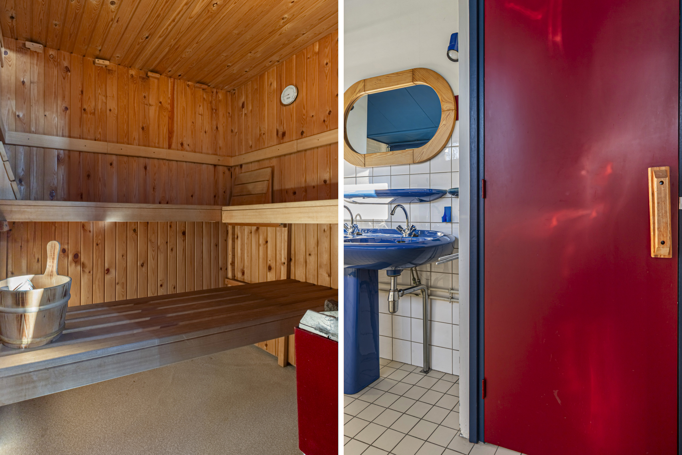 De master bedroom is aan de achterzijde gelegen en voorzien van een vaste schuifkastenwand. Vanuit deze kamer heb je toegang tot het dakterras en de tweede badkamer. De badkamer is uitgerust met een ligbad en een wastafelmeubel met dubbele kraan. Aangrenzend bevindt zich een ruimte met de zonneboiler, de warmtepomp, de wasmachineaansluitingen en een deur naar het royale dakterras. Vanuit hier is de sauna bereikbaar, een heerlijke en luxe toevoeging aan het wooncomfort.