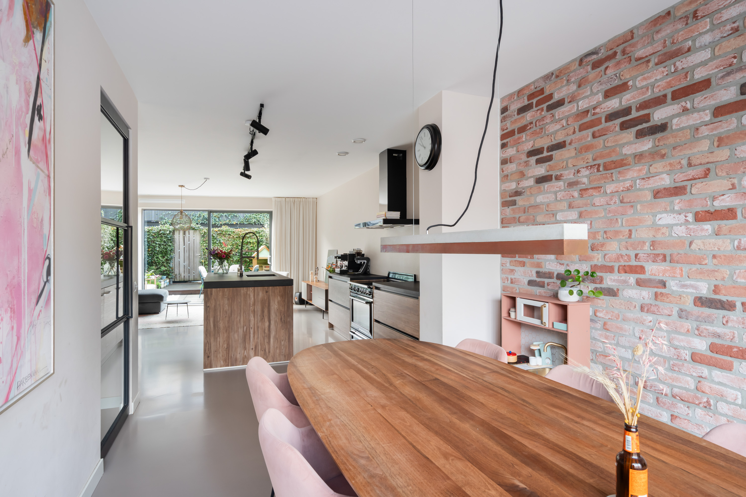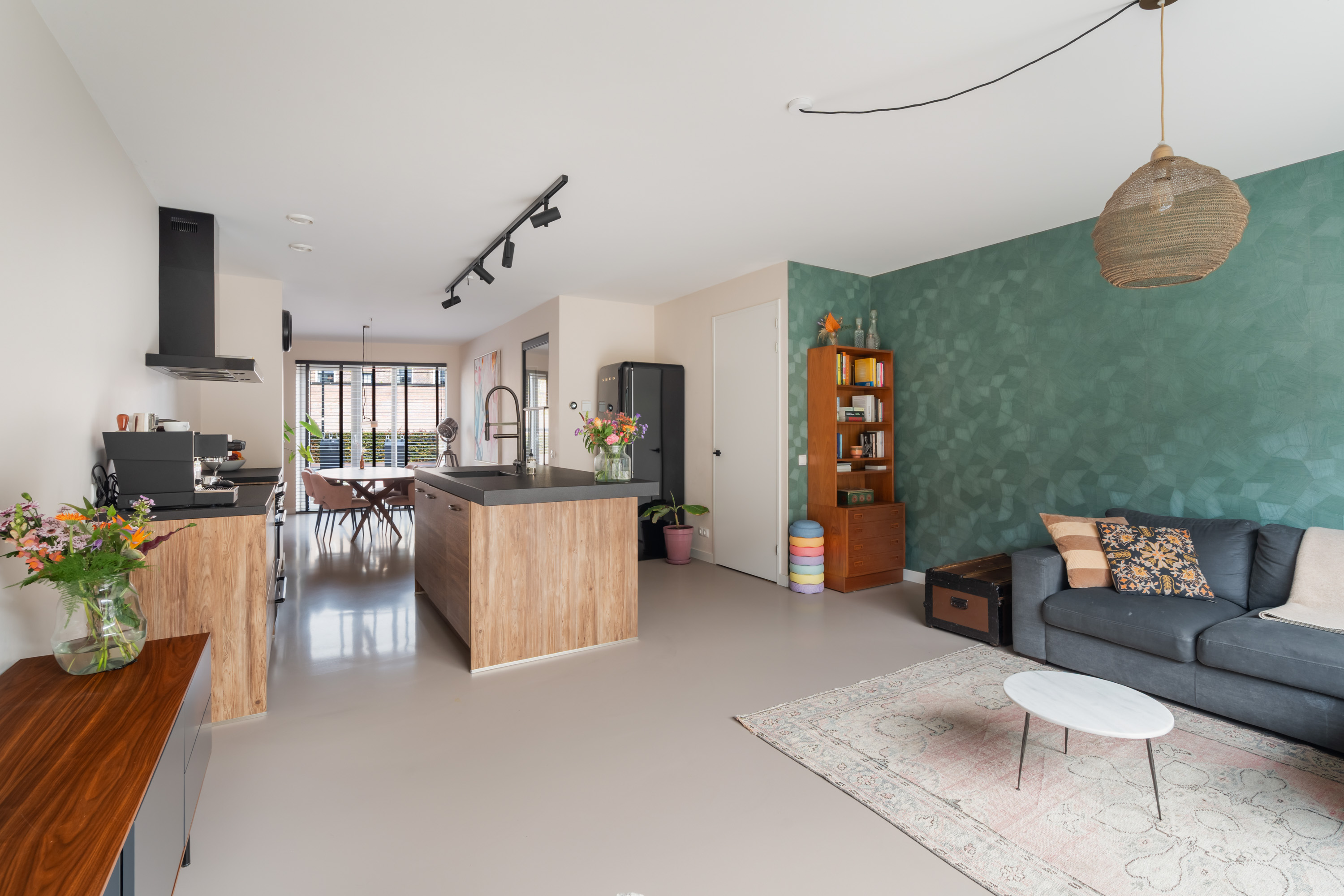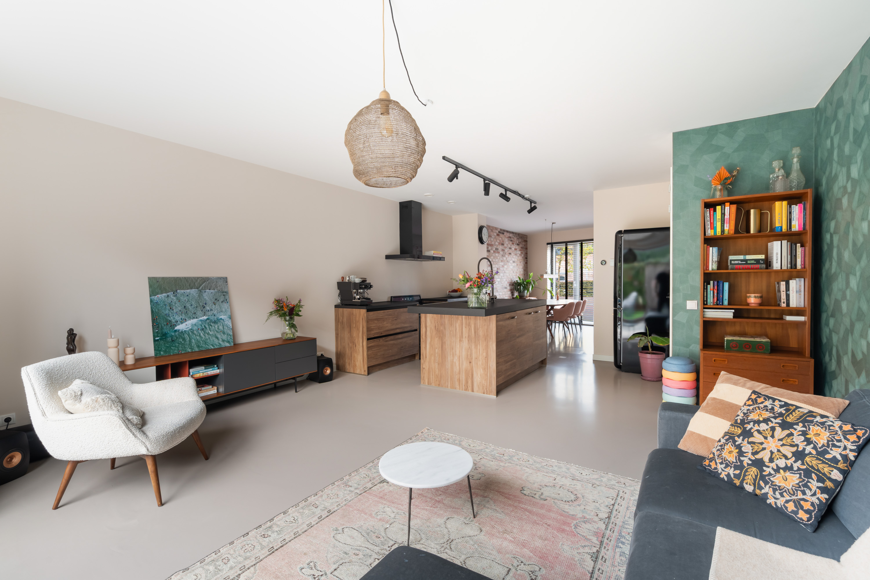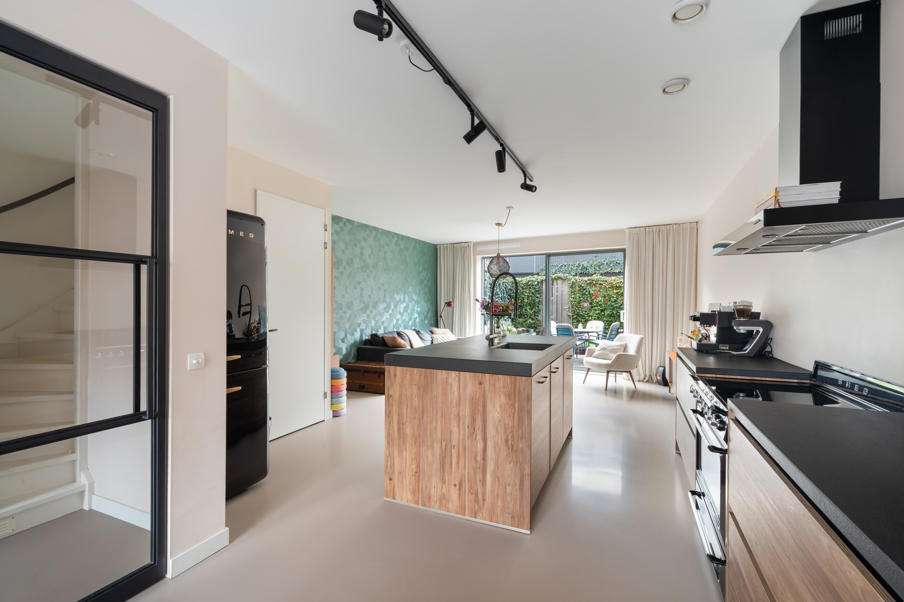 Aan de voorzijde is het sfeervolle zitgedeelte gelegen, een fijne plek om te dineren met een prachtig uitzicht op het kasteel. Aan de achterzijde zorgt de grote schuifpui voor veel lichtinval en een directe verbinding met de achtertuin. De gehele begane grond is afgewerkt met een nette gietvloer en voorzien van comfortabele vloerverwarming.
