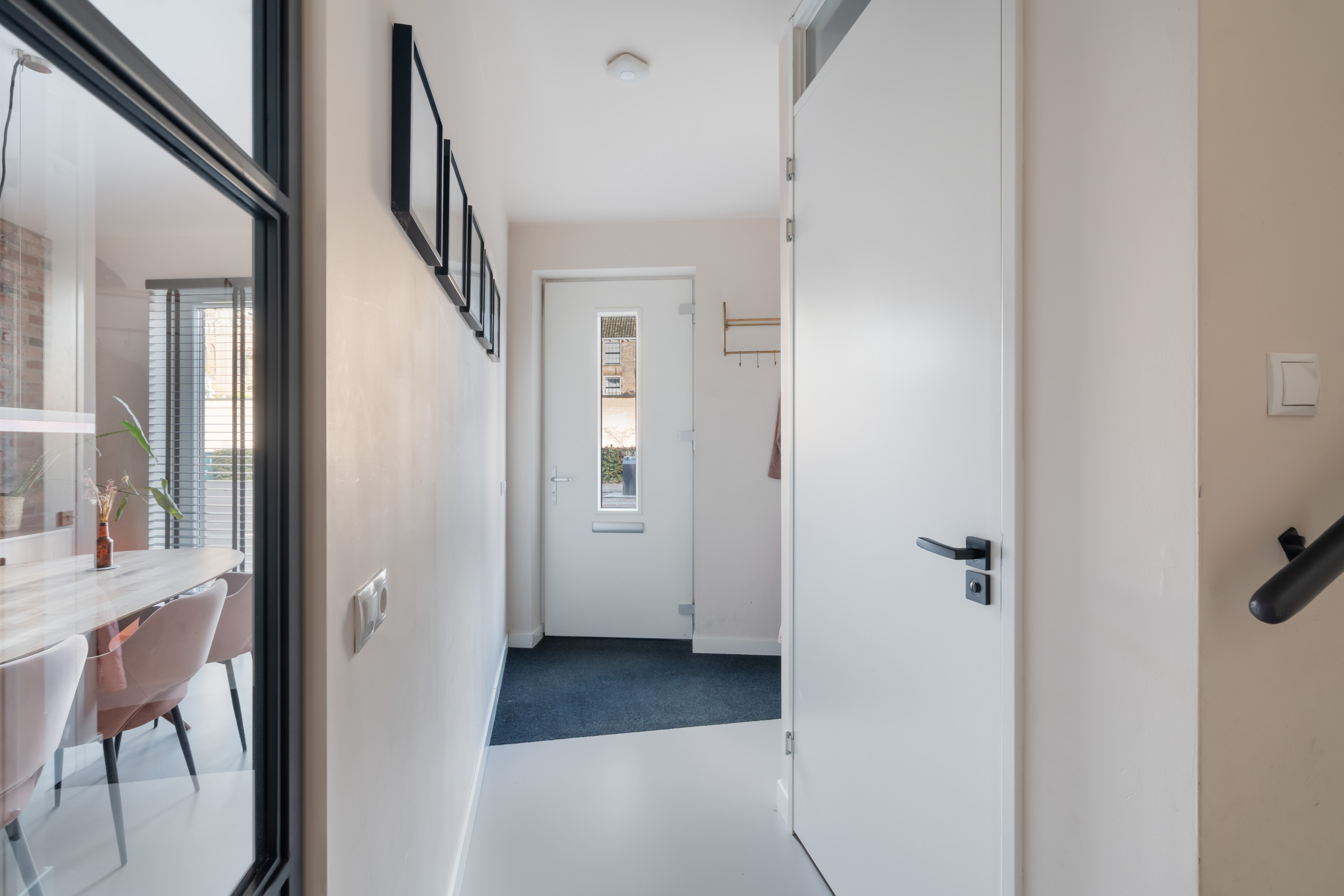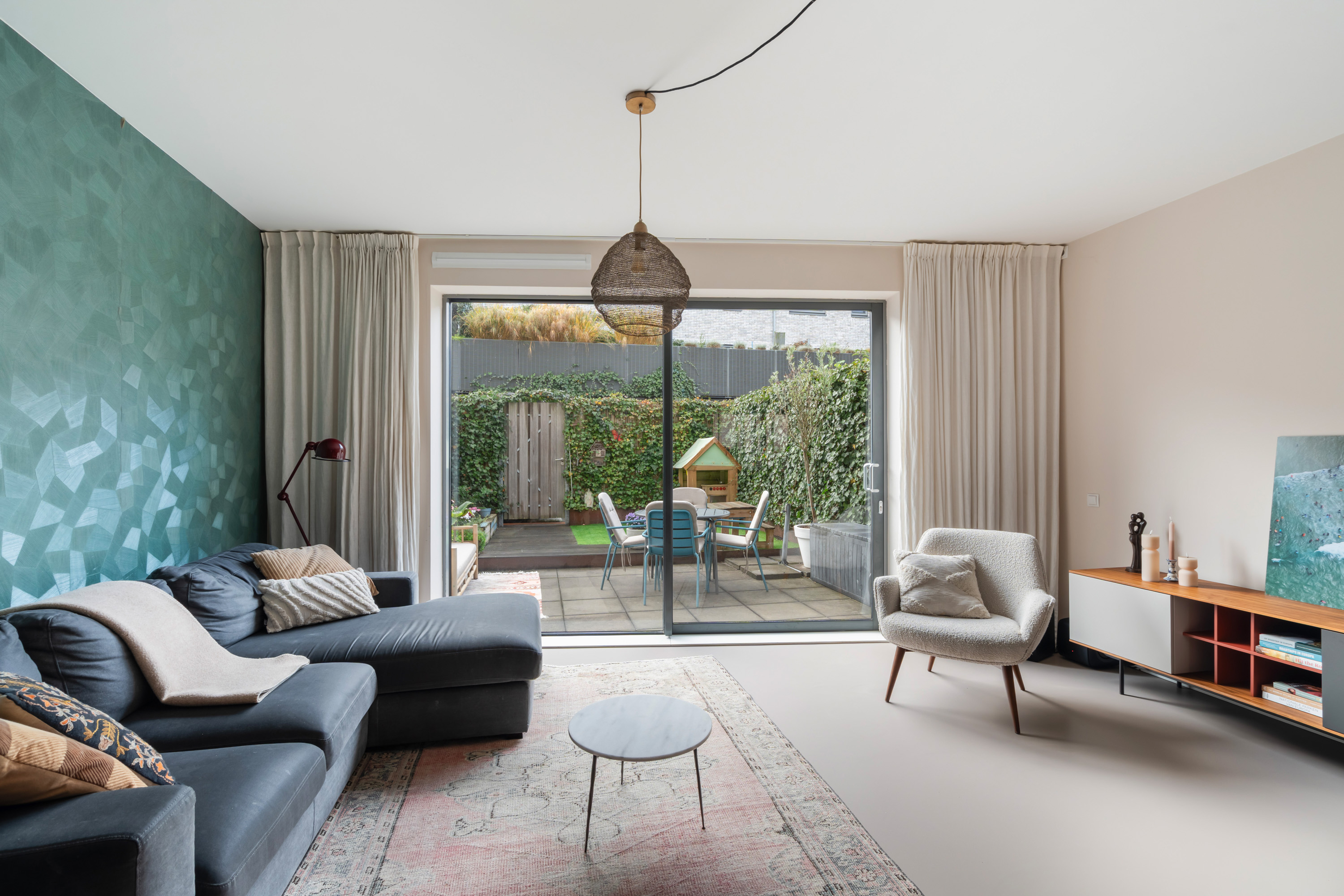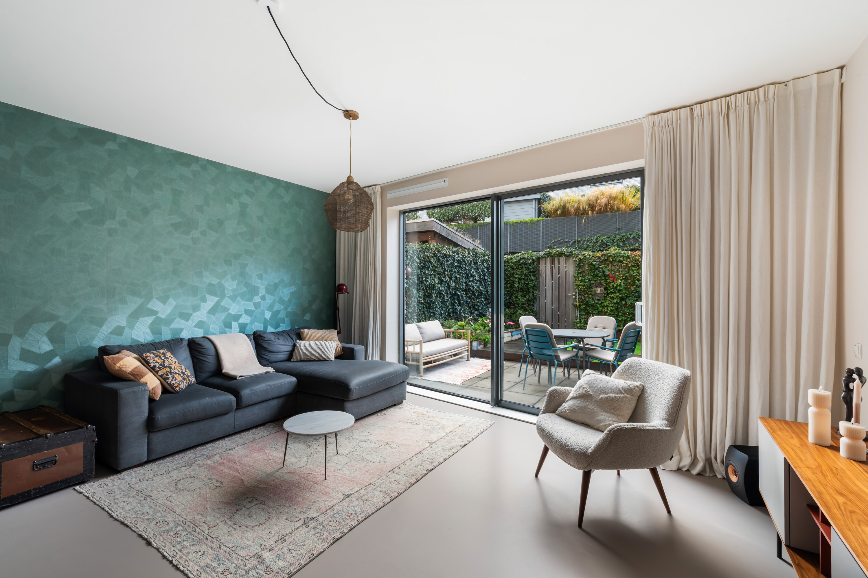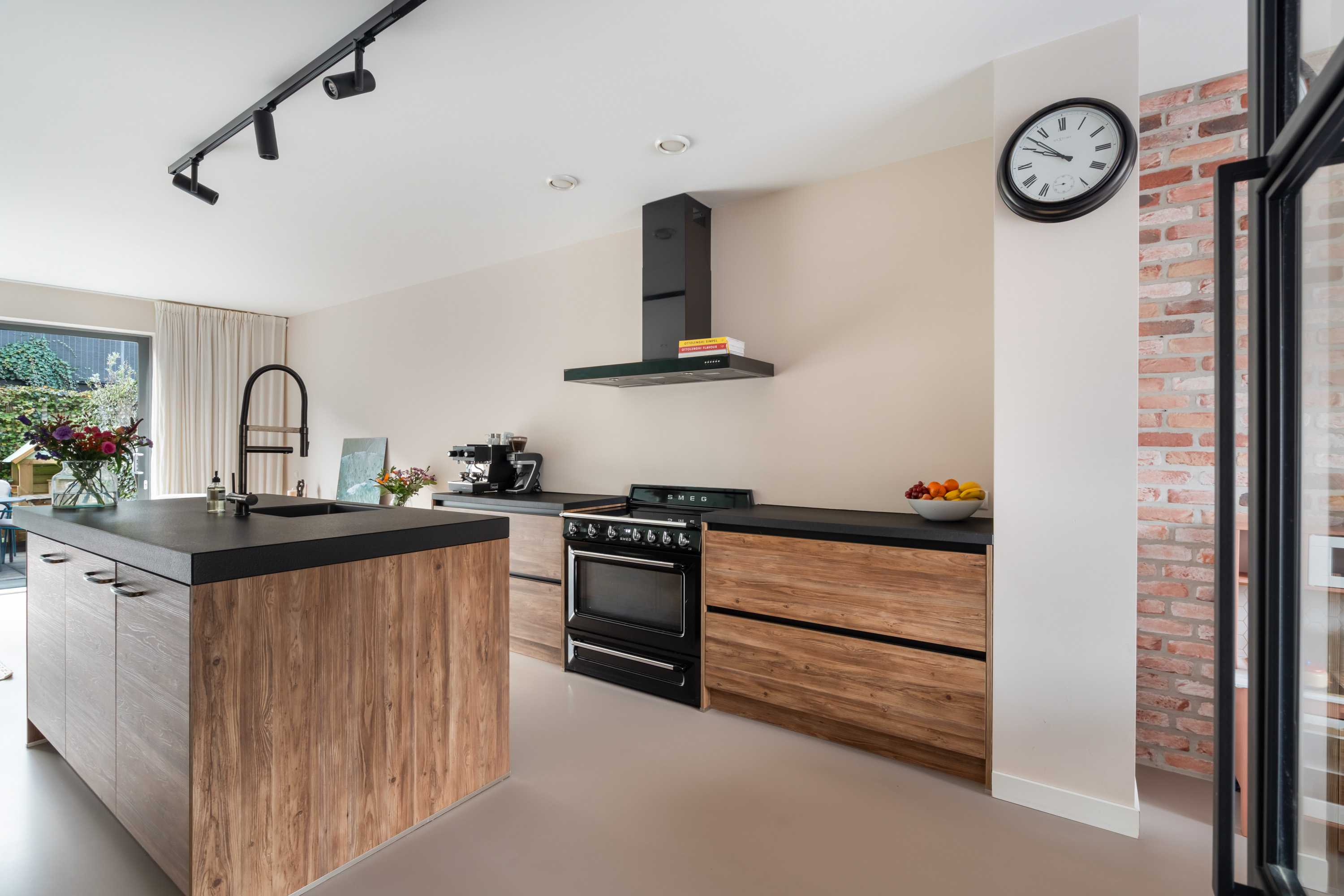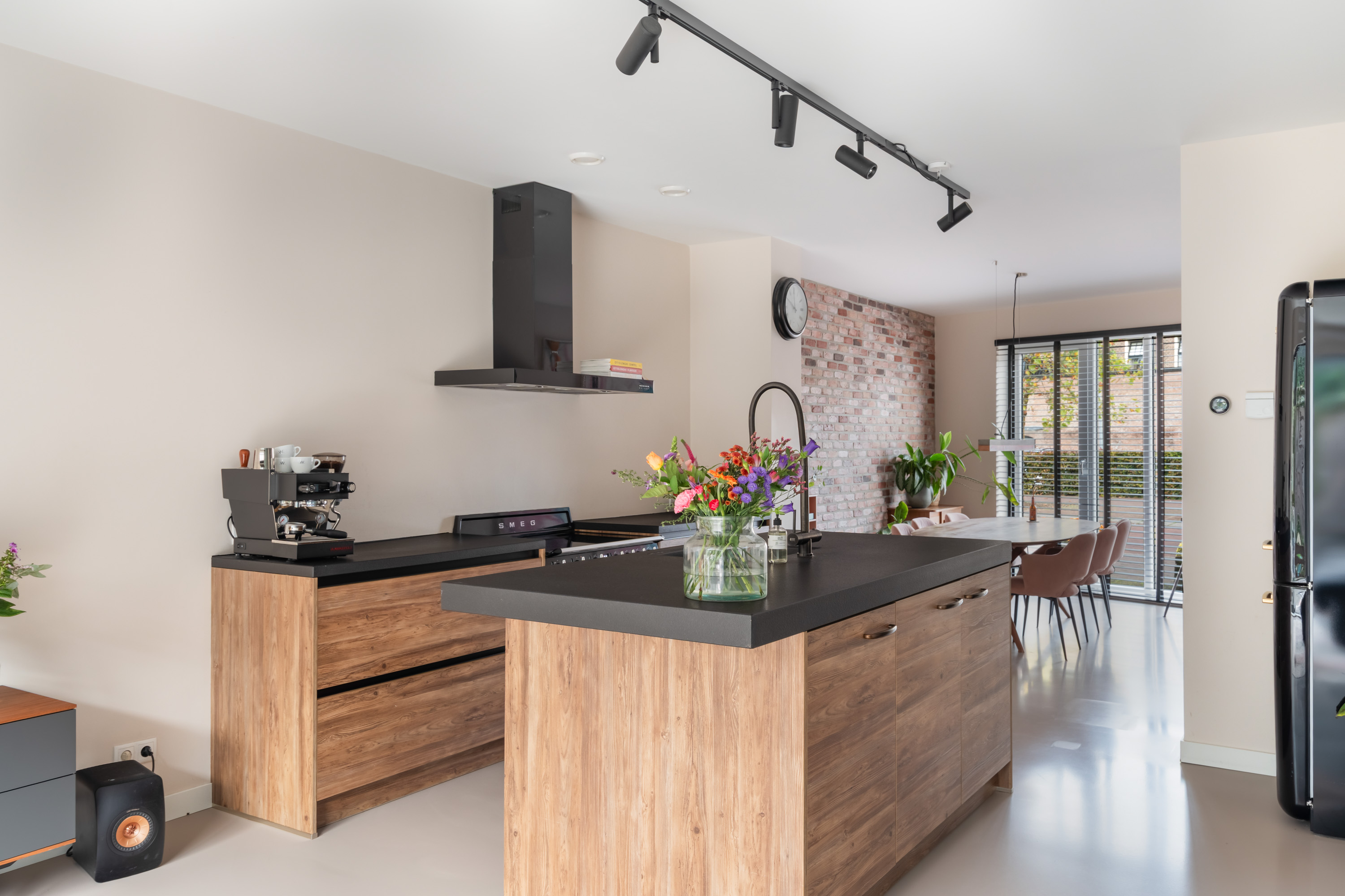 Aan de voorzijde is het sfeervolle zitgedeelte gelegen, een fijne plek om te dineren met een prachtig uitzicht op het kasteel. Aan de achterzijde zorgt de grote schuifpui voor veel lichtinval en een directe verbinding met de achtertuin. De gehele begane grond is afgewerkt met een nette gietvloer en voorzien van comfortabele vloerverwarming.