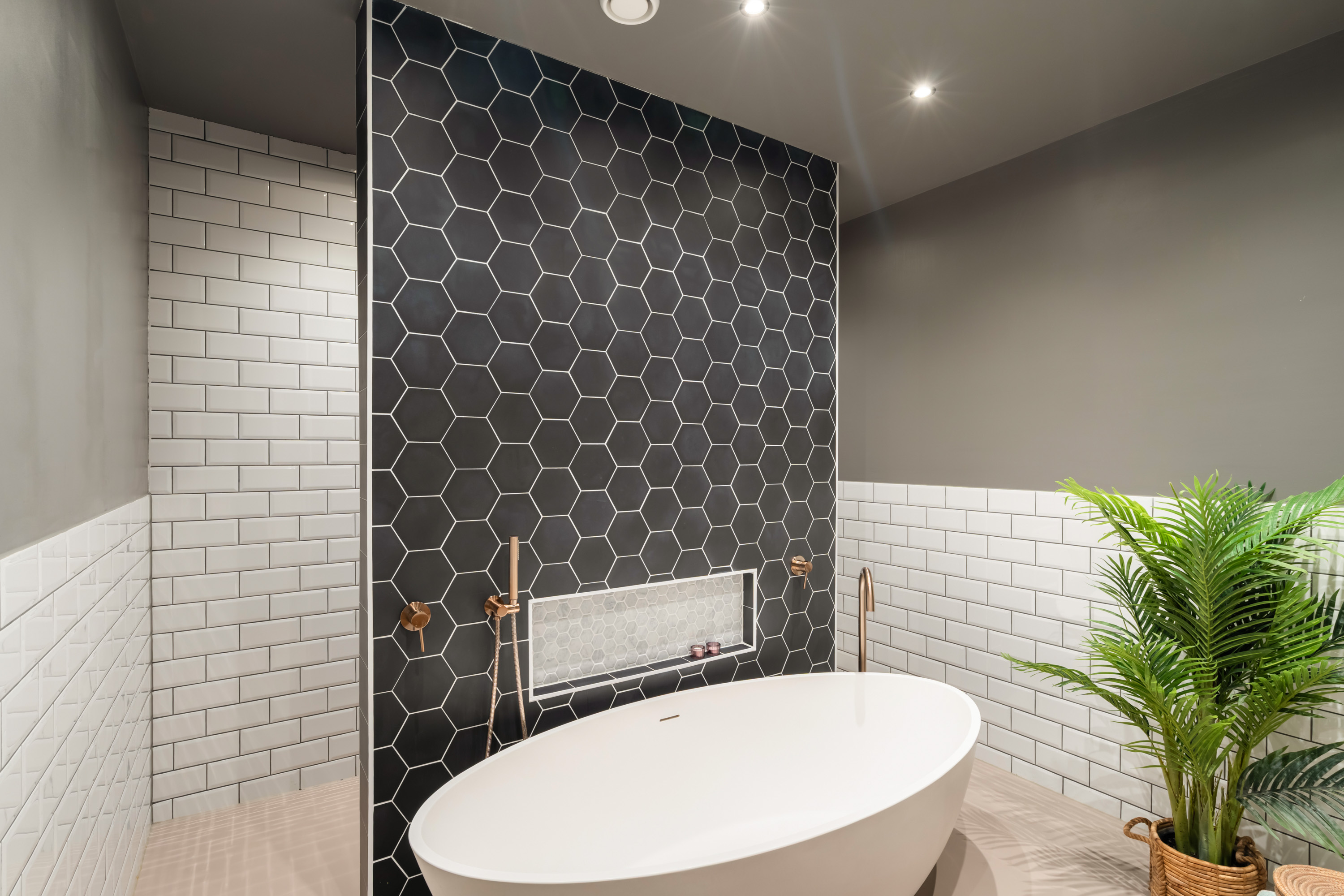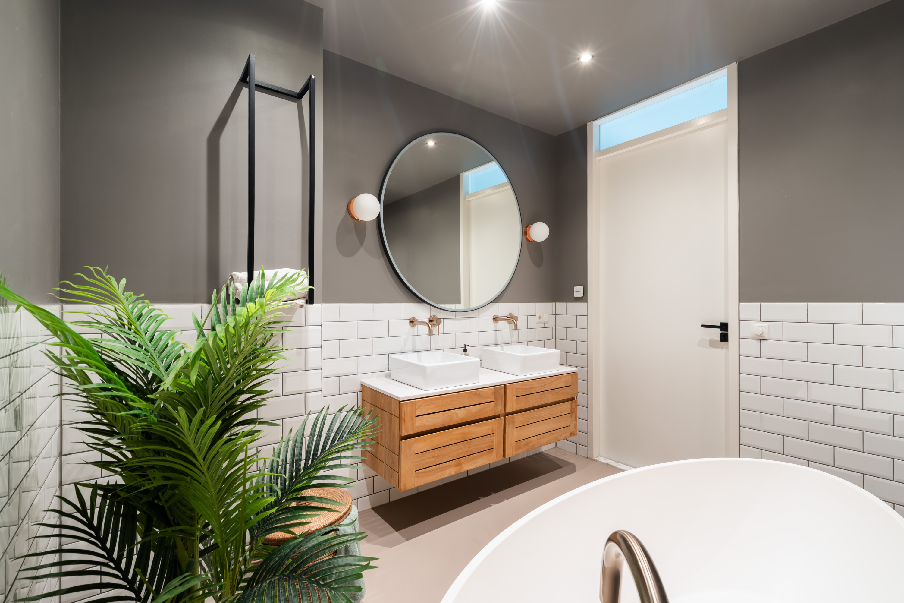 De centraal gelegen badkamer is van alle gemakken voorzien en luxe uitgevoerd met een inloopdouche, losstaand ligbad en een dubbel wastafelmeubel.