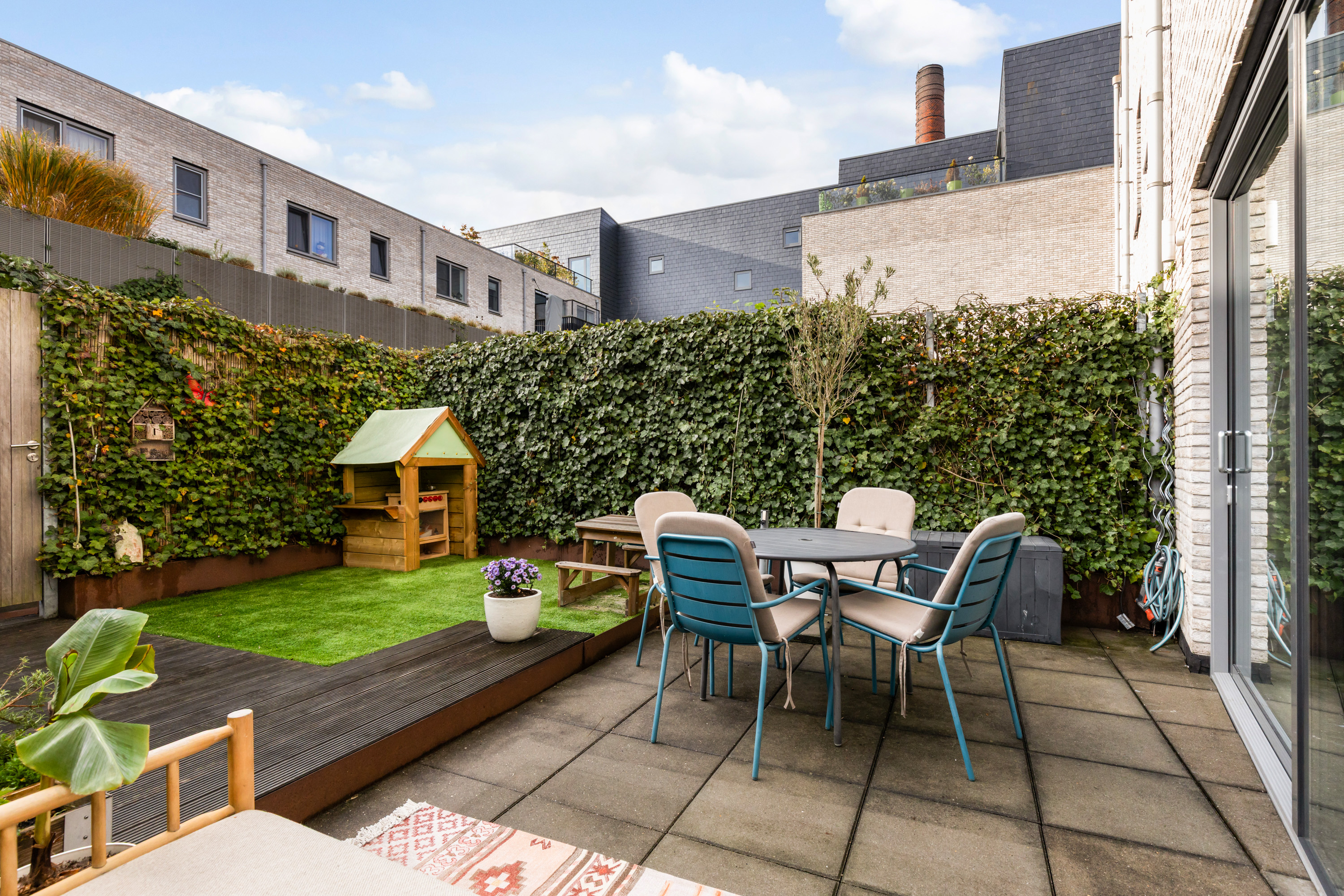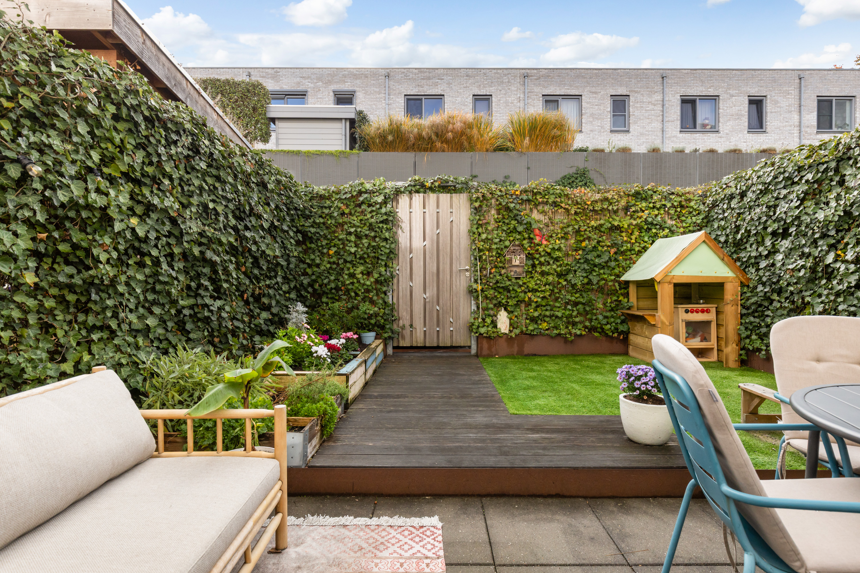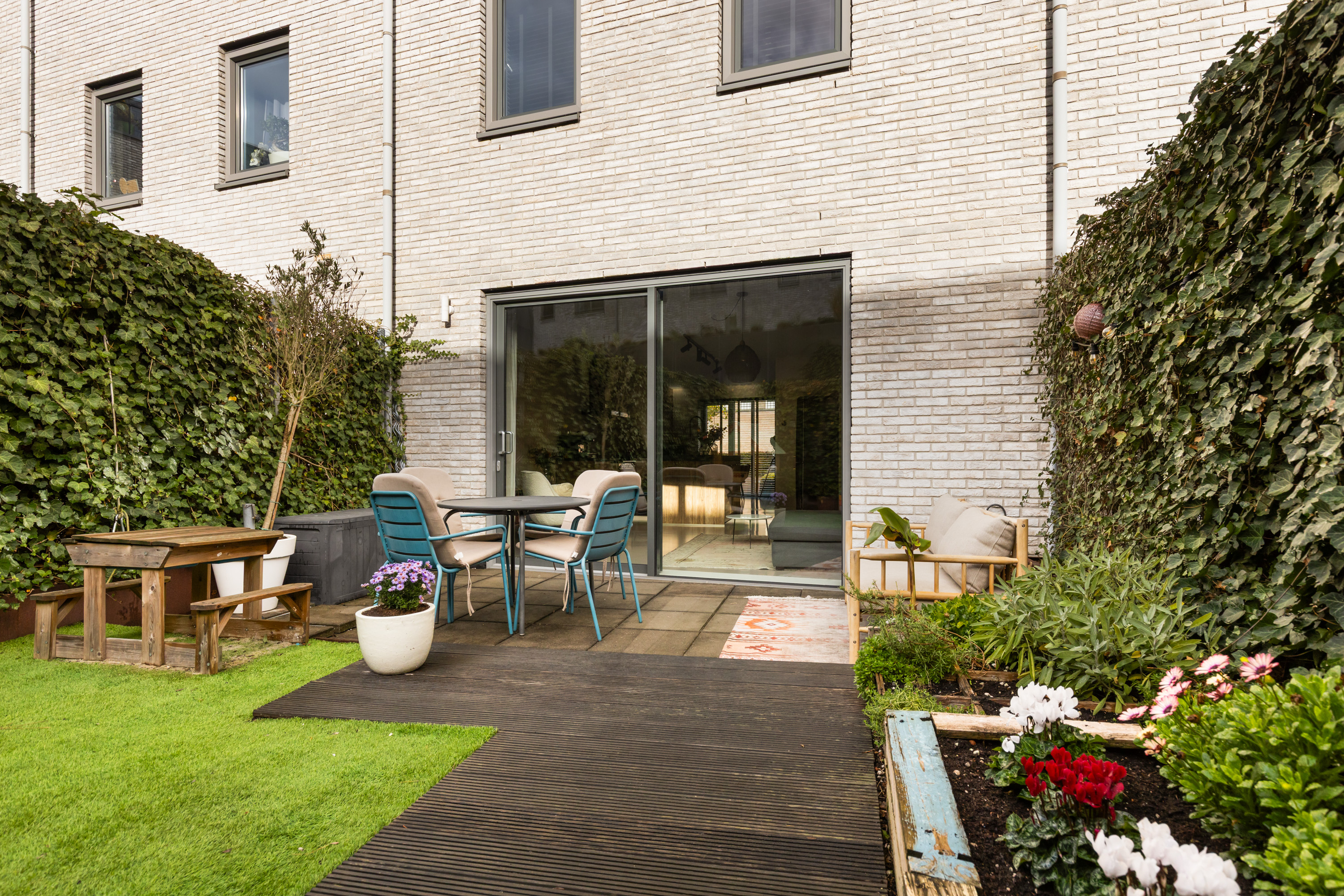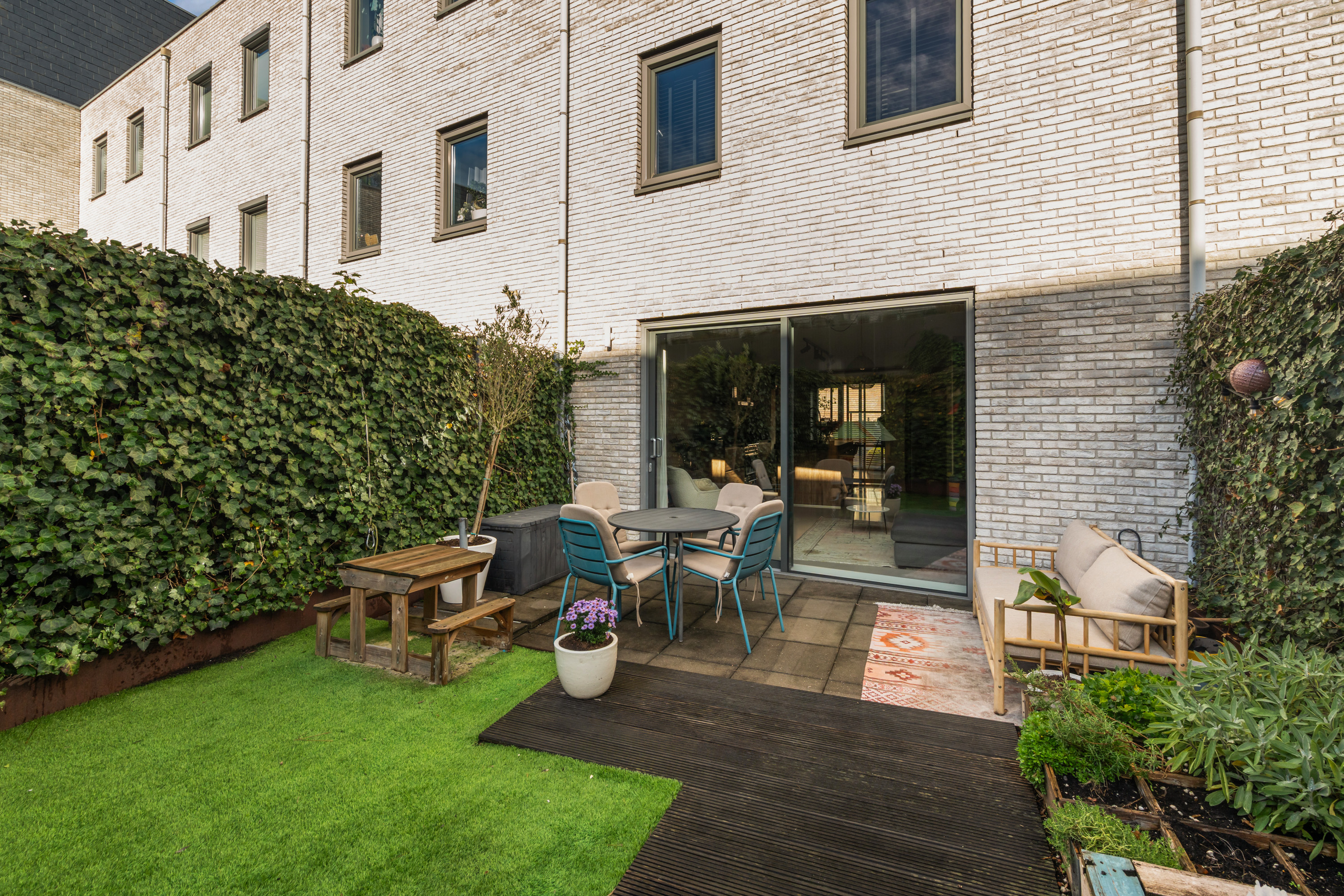 De verzorgde en strak aangelegde achtertuin is ideaal gesitueerd op het zonnige zuidwesten, waardoor je hier tot in de avonduren van de zon kunt genieten. De tuin is speels ingericht met een combinatie van een vlonder, kunstgras, sierbestrating en diverse groene beplanting. Via de poort aan de achterzijde bereik je de privéparkeerplaats en de stenen berging, die is voorzien van elektra.