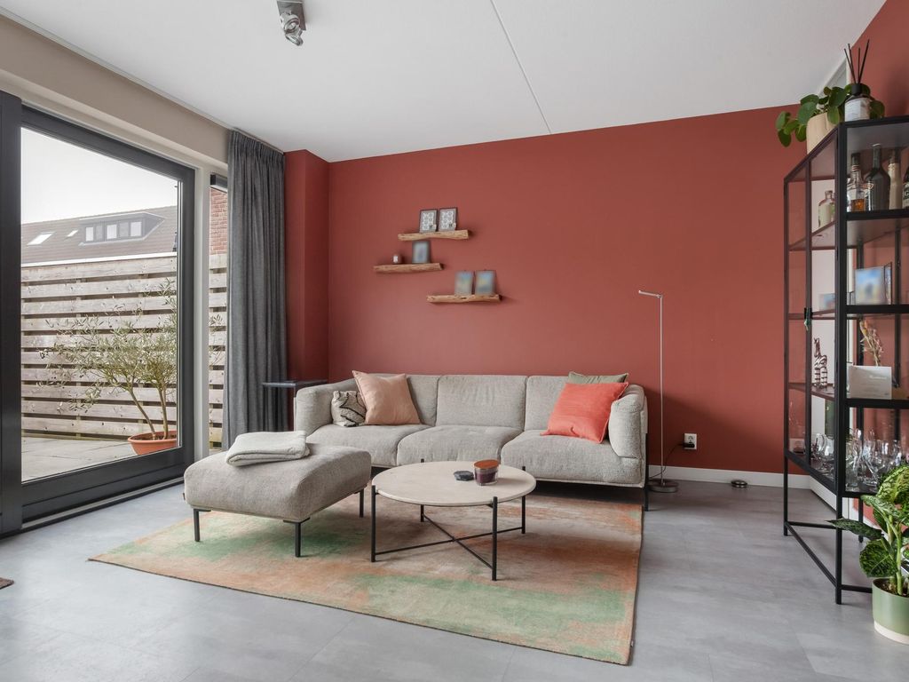 De open keuken loopt over in de aangrenzende tuingerichte woonkamer met veel licht. Dankzij de grote schuifpui naar de tuin is er een mooie verbinding tussen binnen en buiten.