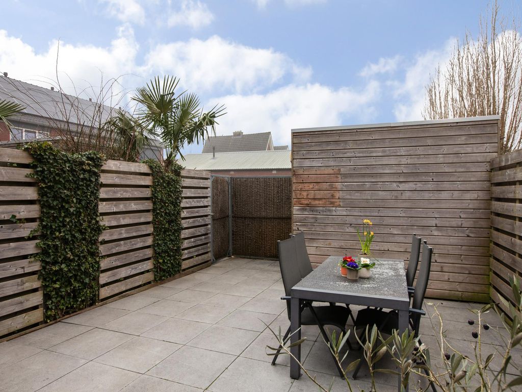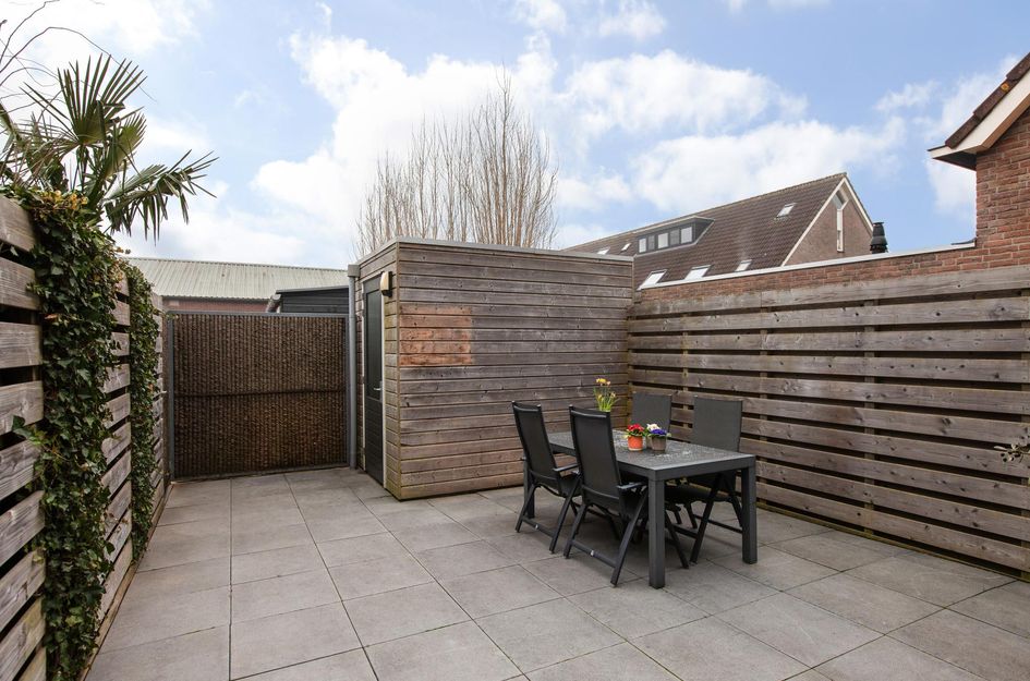 De achtertuin is op het op het zuidoosten gelegen en onderhoudsvriendelijk aangelegd. Achterin de tuin staat de houten berging met elektra en er is een deur naar de brede poort aan de achterzijde.