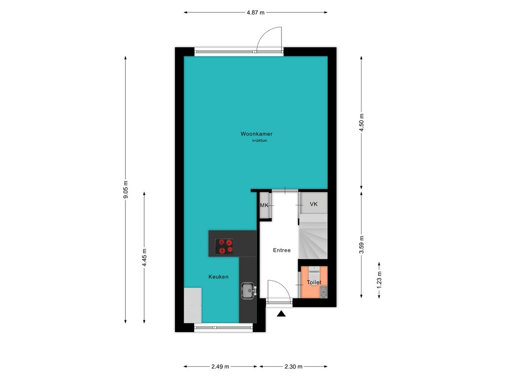 Voor de afmetingen en indeling raadpleeg de gedetailleerde plattegrond.