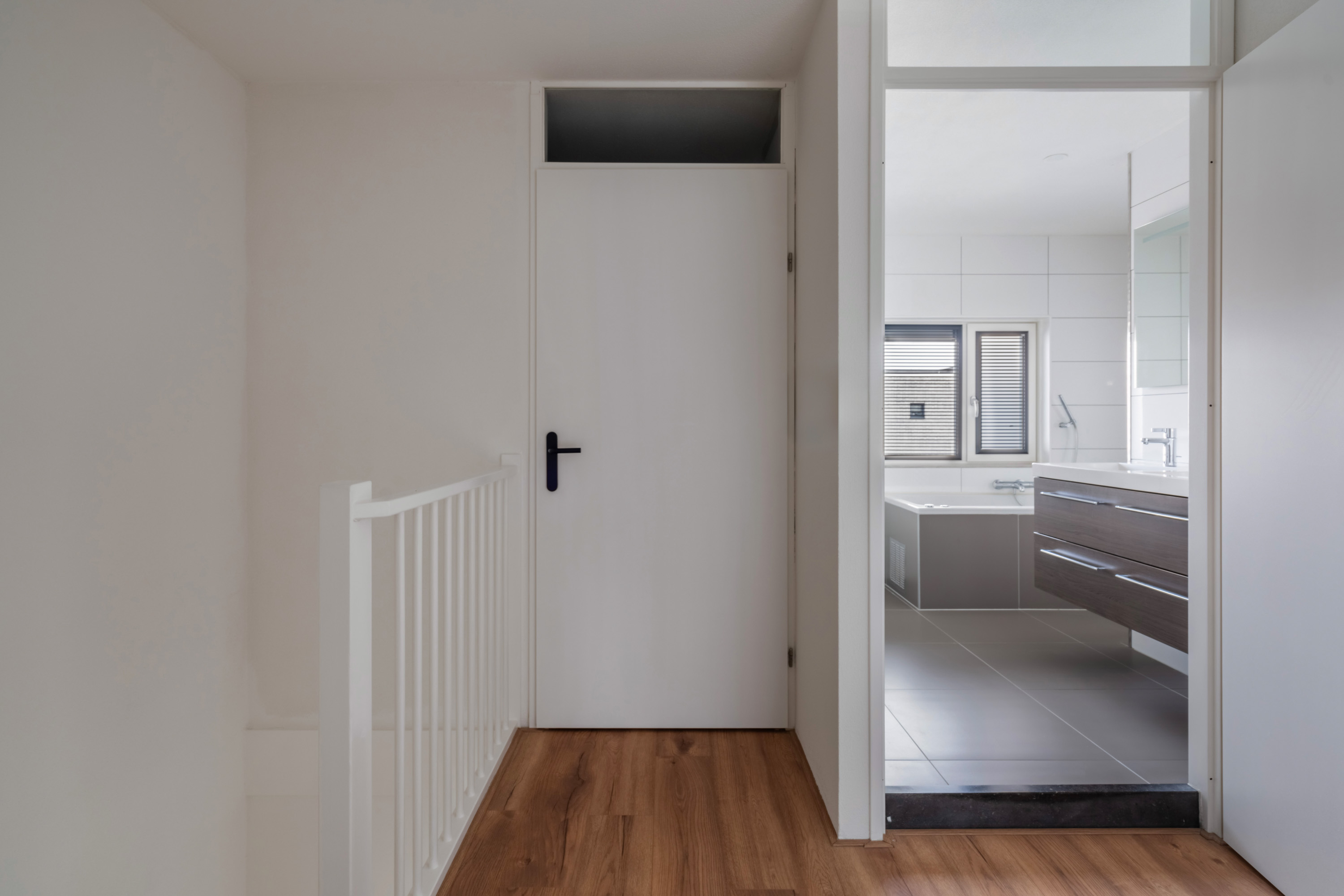 De overloop geeft je toegang tot drie kamers, een inpandige bergruimte en de badkamer. De badkamer is aan de voorzijde gelegen, ruim van opzet en voorzien van een: