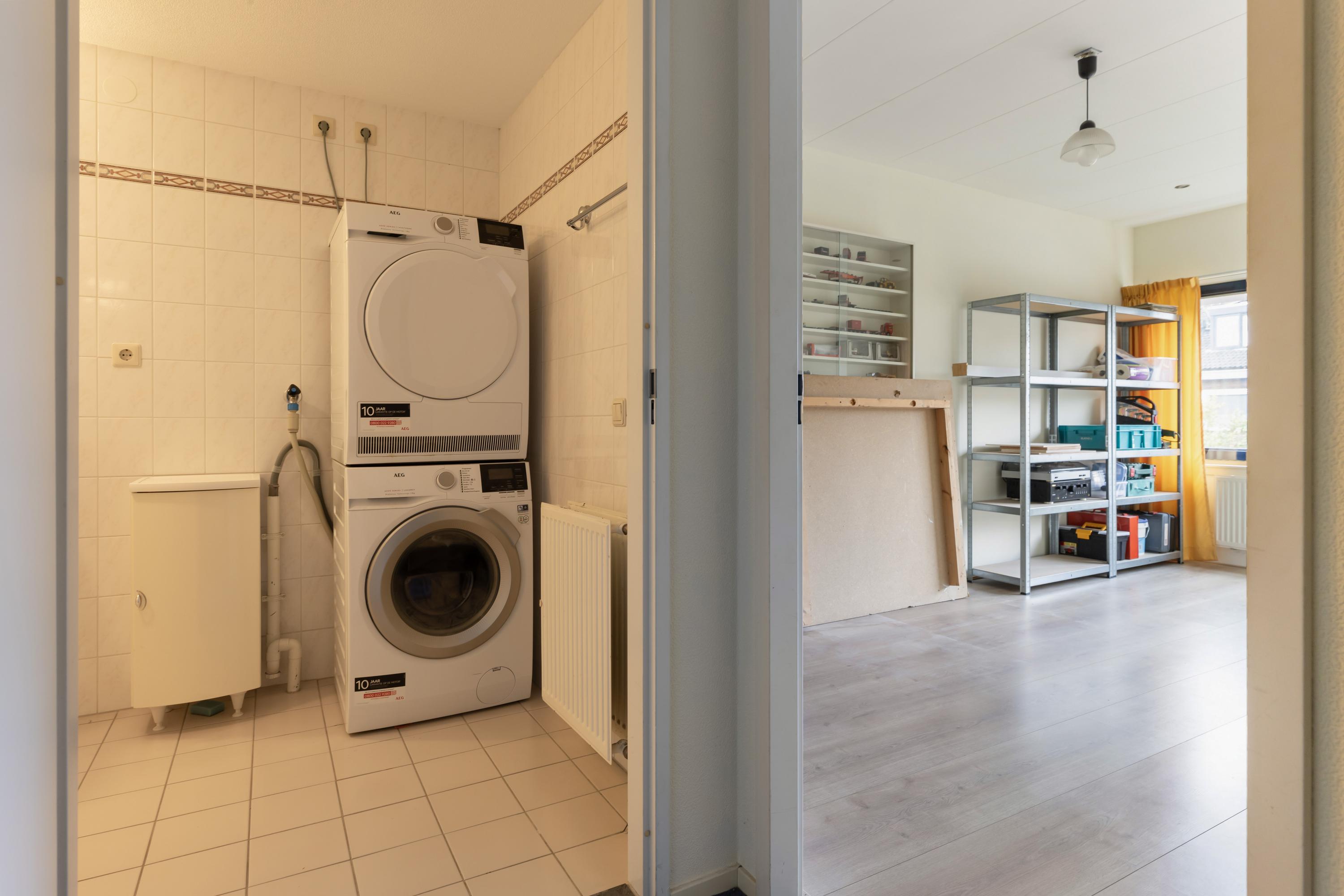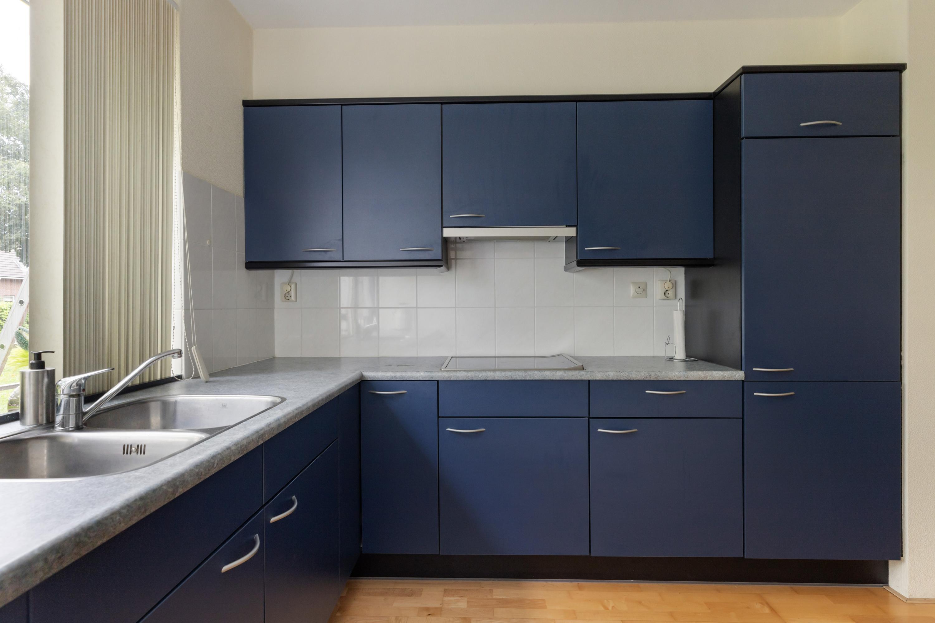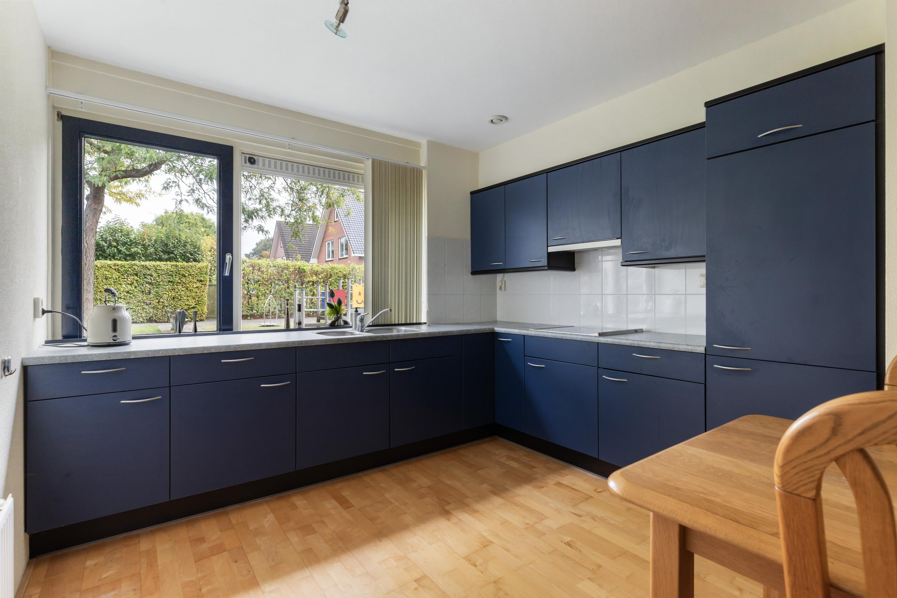 De keuken is aan de voorkant van het huis gelegen, staat in open verbinding met de woonkamer en is opgesteld in een L-vorm. Hier krijg je de beschikking over een 4-pits keramische kookplaat, afzuigkap en een koel-vriescombinatie. Daarnaast is er hier onder de trap een vaste kast gecreëerd.