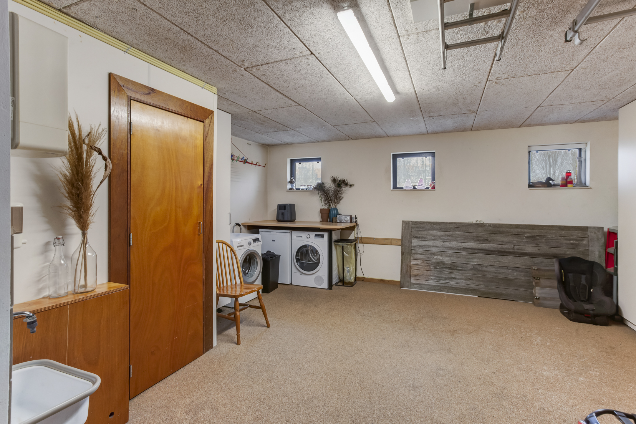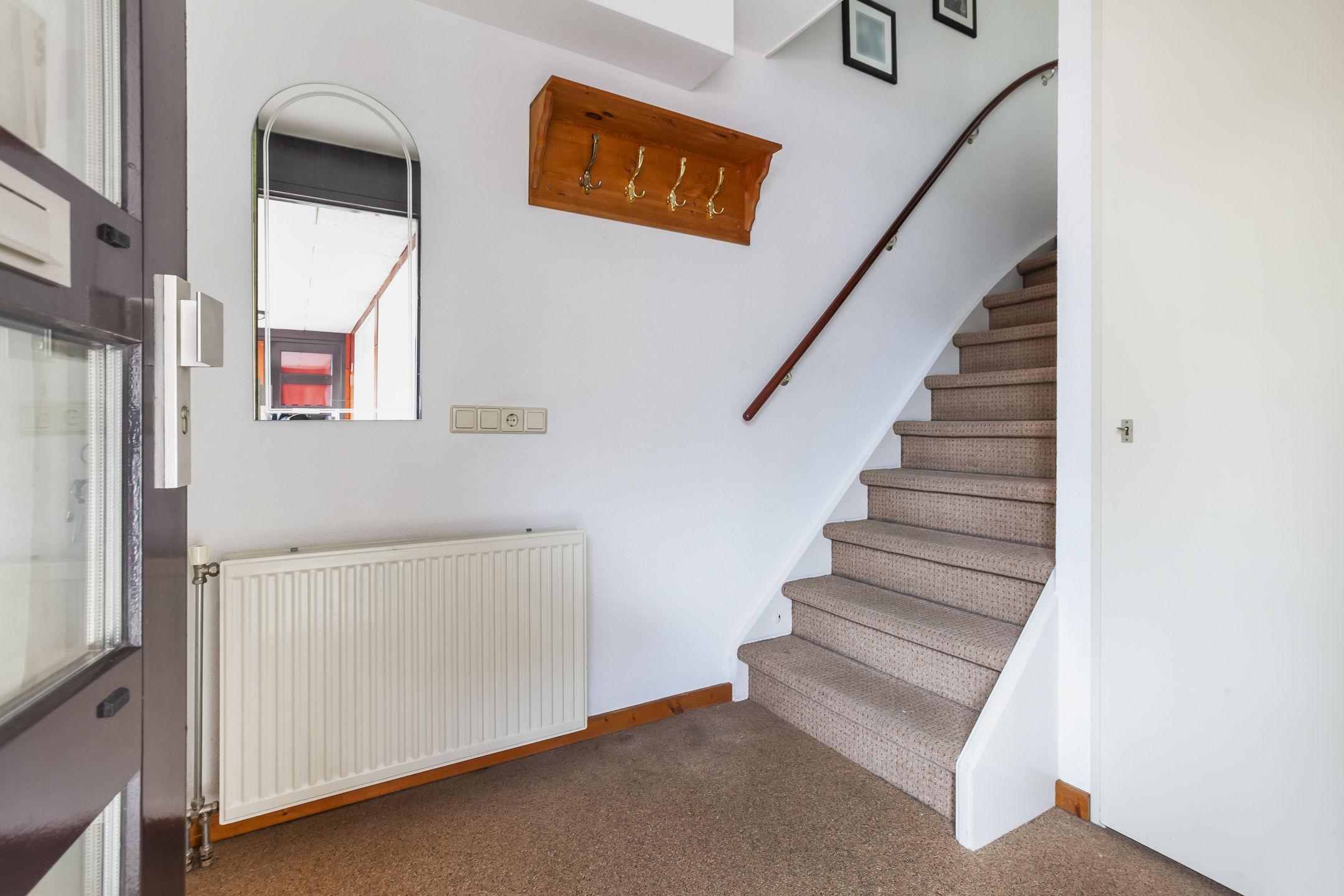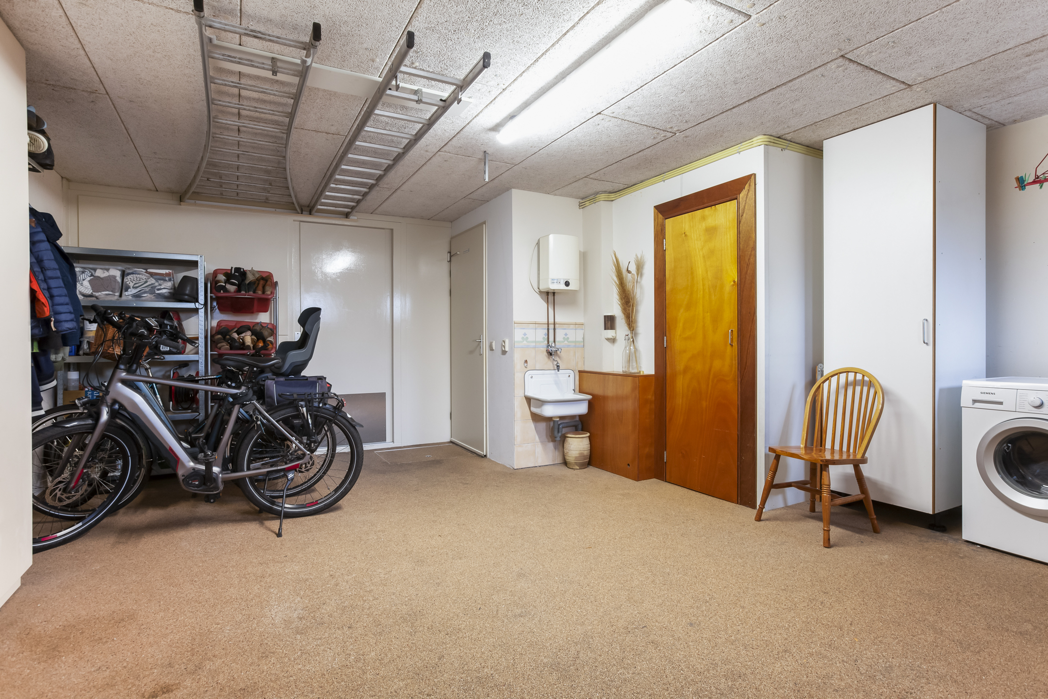 Parkeren kan gemakkelijk op eigen terrein. Via de overdekte voordeur betreed je de hal, waar zich de meterkast, de toiletruimte, de trapopgang en de toegang tot de garage bevinden. De garage is praktisch ingericht met een vaste opbergkast, bergruimte onder de trap, de aansluitingen voor de wasapparatuur, een wasbak en een elektrische boiler. Via een loopdeur bereik je weer de oprit aan de voorzijde.