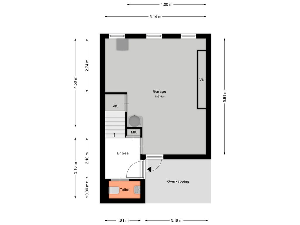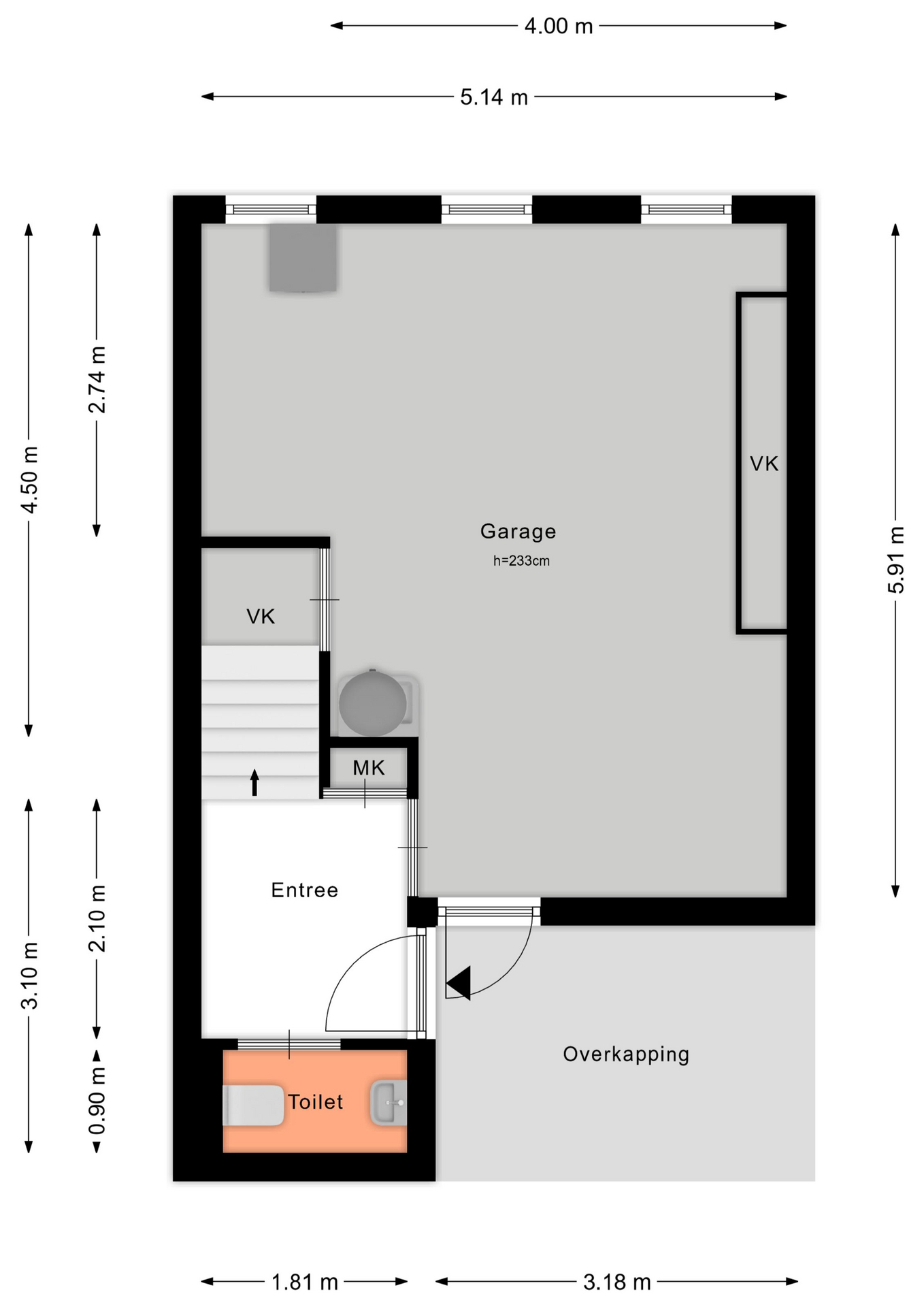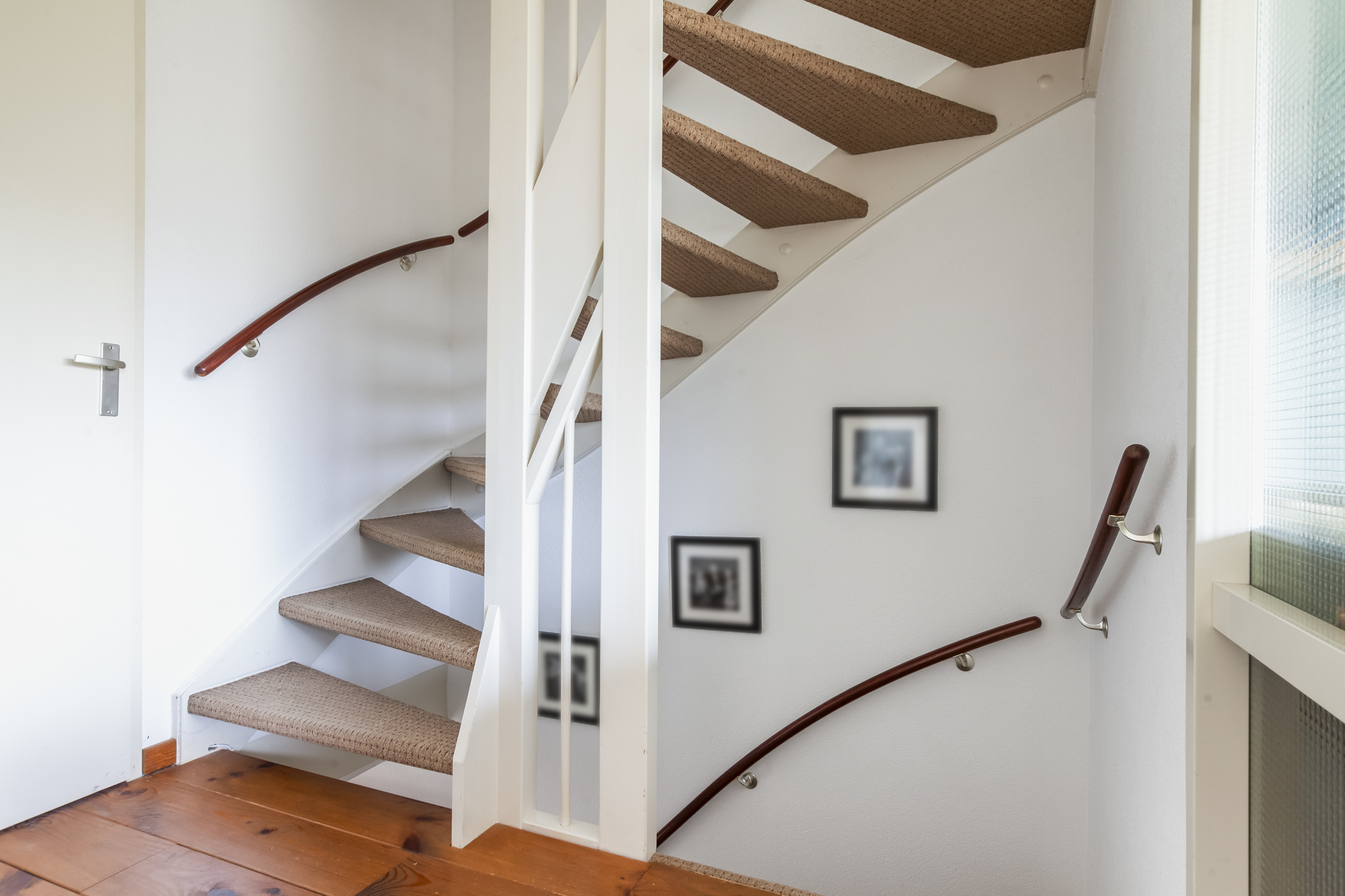 Parkeren kan gemakkelijk op eigen terrein. Via de overdekte voordeur betreed je de hal, waar zich de meterkast, de toiletruimte, de trapopgang en de toegang tot de garage bevinden. De garage is praktisch ingericht met een vaste opbergkast, bergruimte onder de trap, de aansluitingen voor de wasapparatuur, een wasbak en een elektrische boiler. Via een loopdeur bereik je weer de oprit aan de voorzijde.