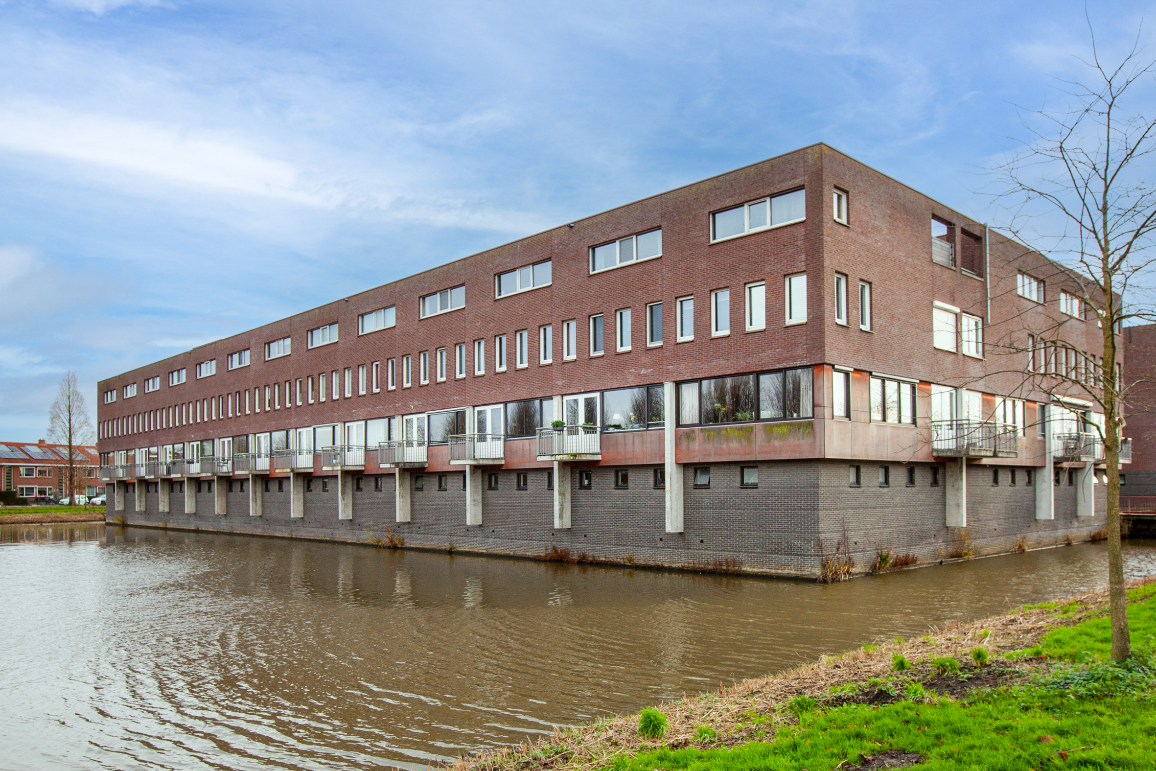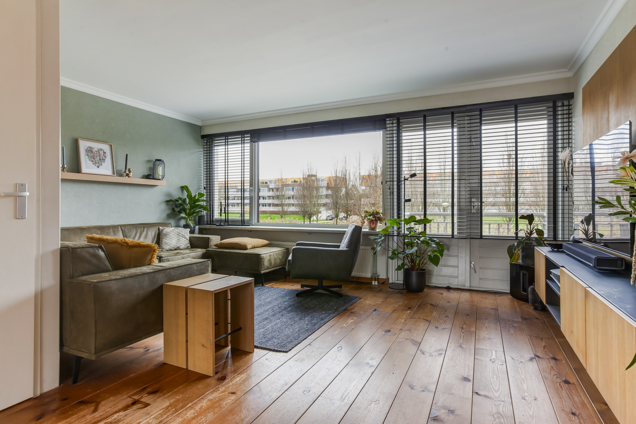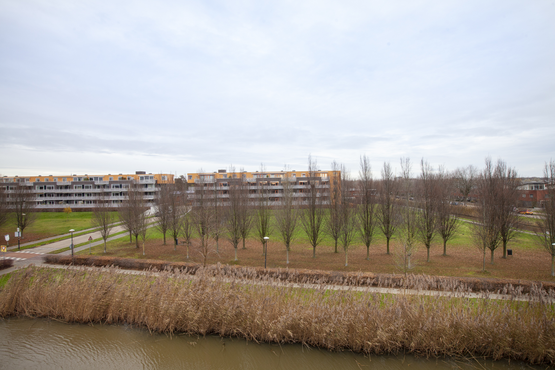 De woonkamer bevindt zich in deze woning op de eerste verdieping. De afgesloten overloop beschikt over een vaste kast met daarin de opstelplaats voor de cv-ketel en de mechanische ventilatie. De woonkamer is heerlijk ruim van opzet en licht door de grote raampartijen aan zowel de voor- als achterzijde. De openslaande deuren in de achtergevel geven toegang tot het balkon met prachtig uitzicht op het water.
