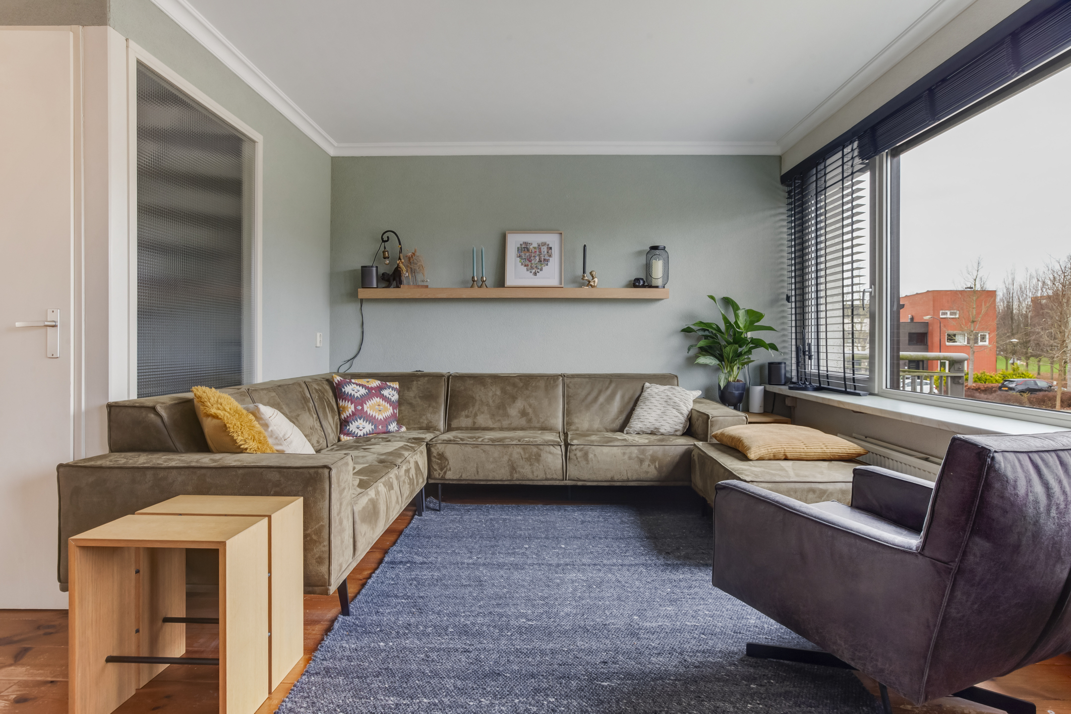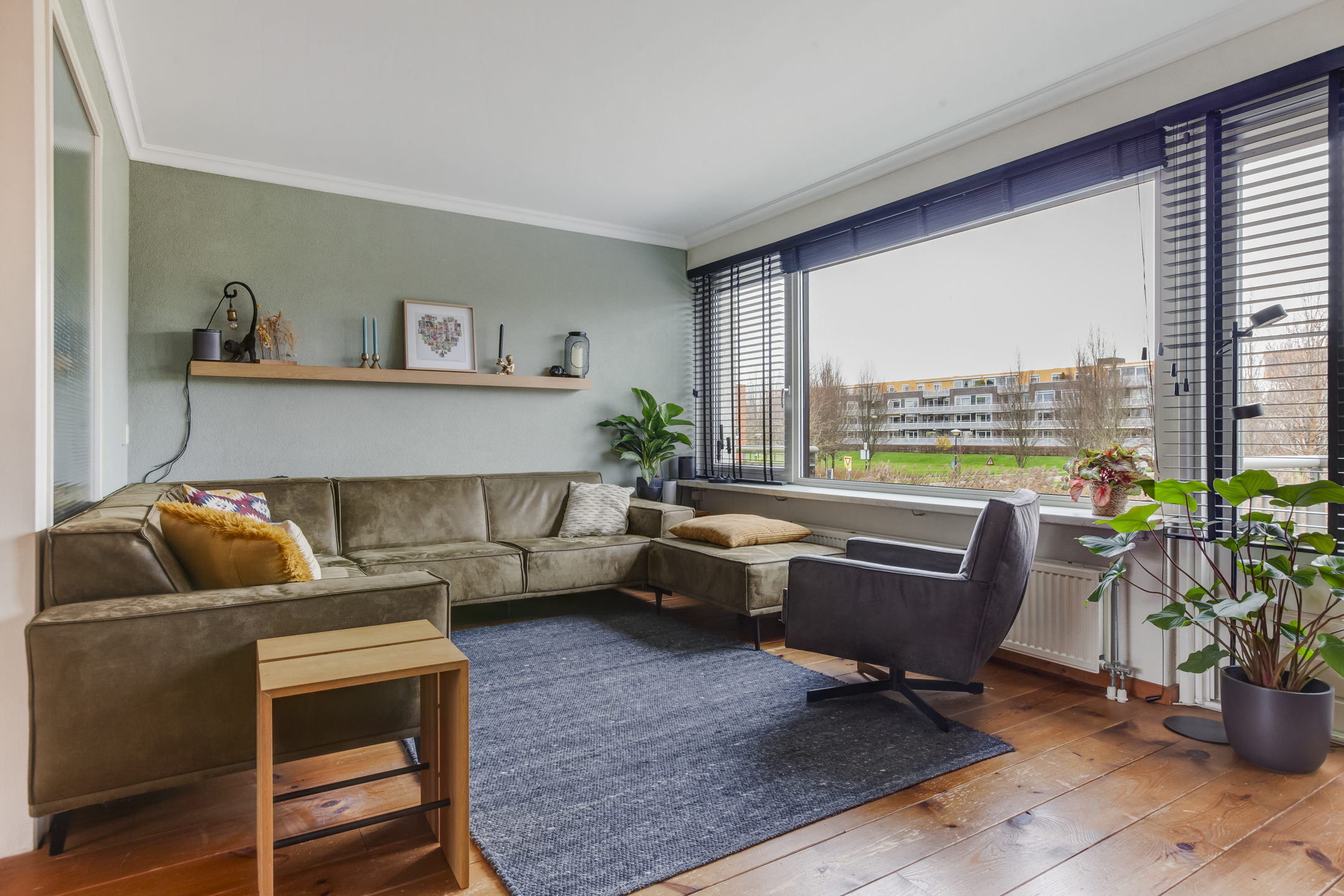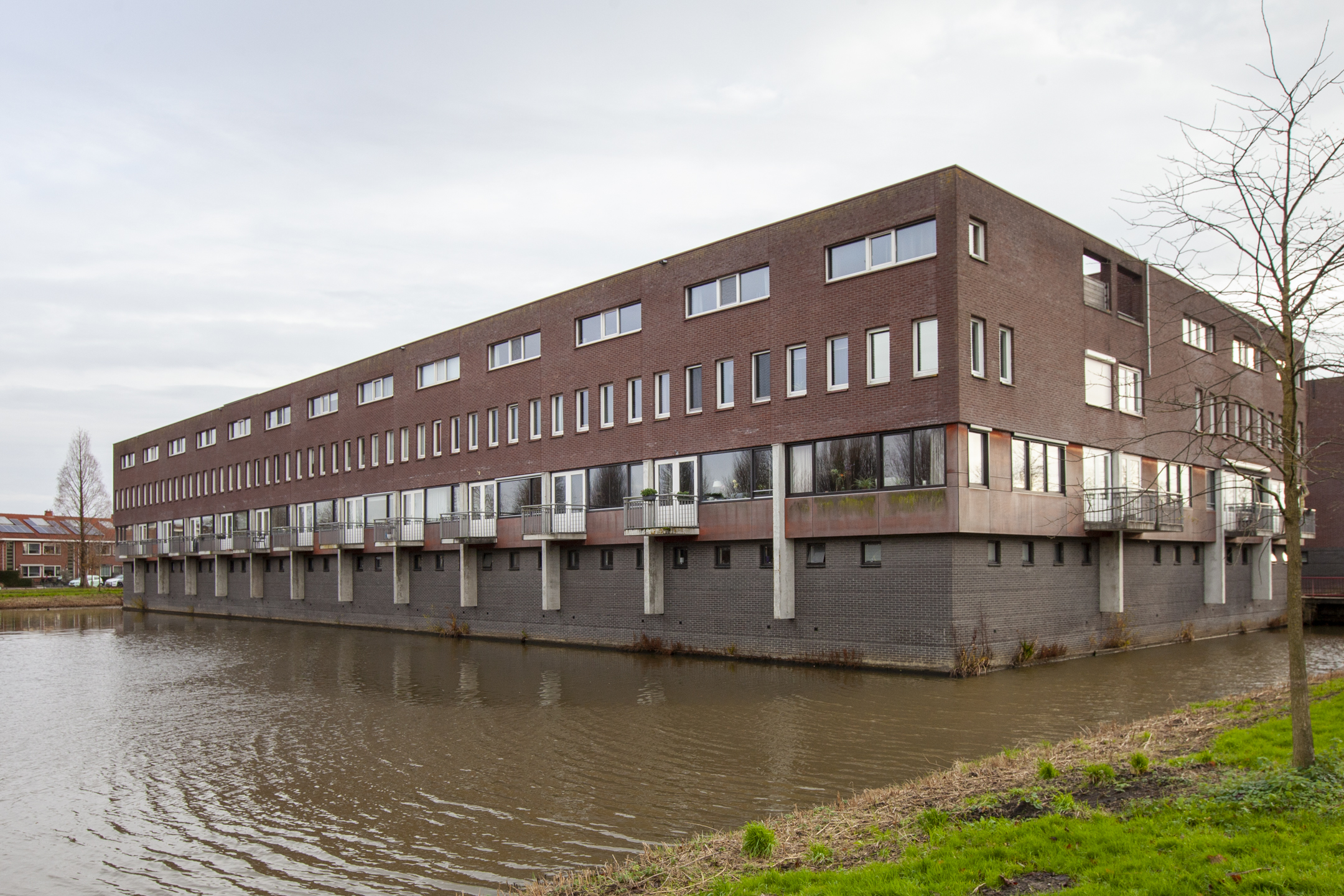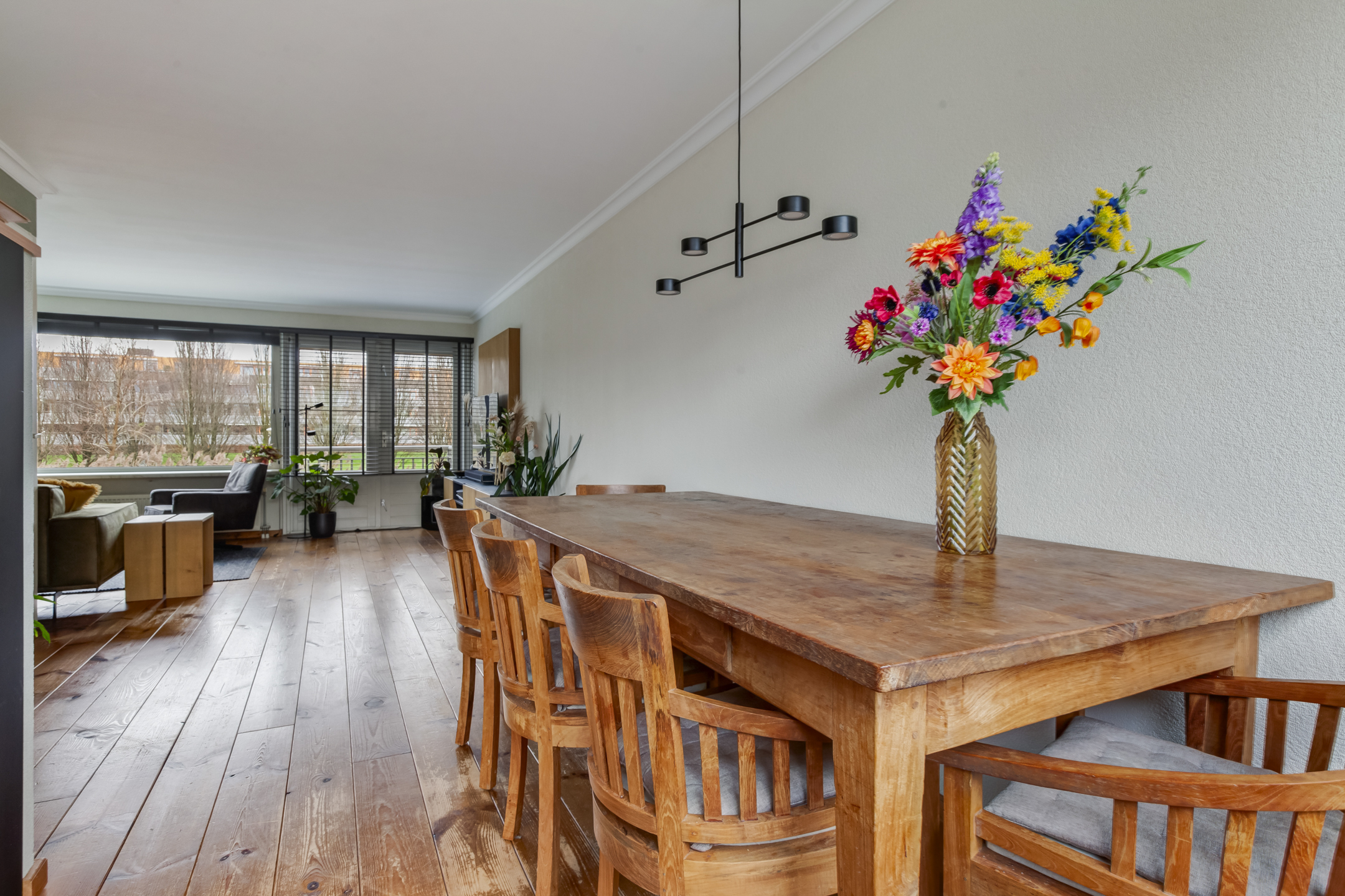 De woonkamer bevindt zich in deze woning op de eerste verdieping. De afgesloten overloop beschikt over een vaste kast met daarin de opstelplaats voor de cv-ketel en de mechanische ventilatie. De woonkamer is heerlijk ruim van opzet en licht door de grote raampartijen aan zowel de voor- als achterzijde. De openslaande deuren in de achtergevel geven toegang tot het balkon met prachtig uitzicht op het water.
