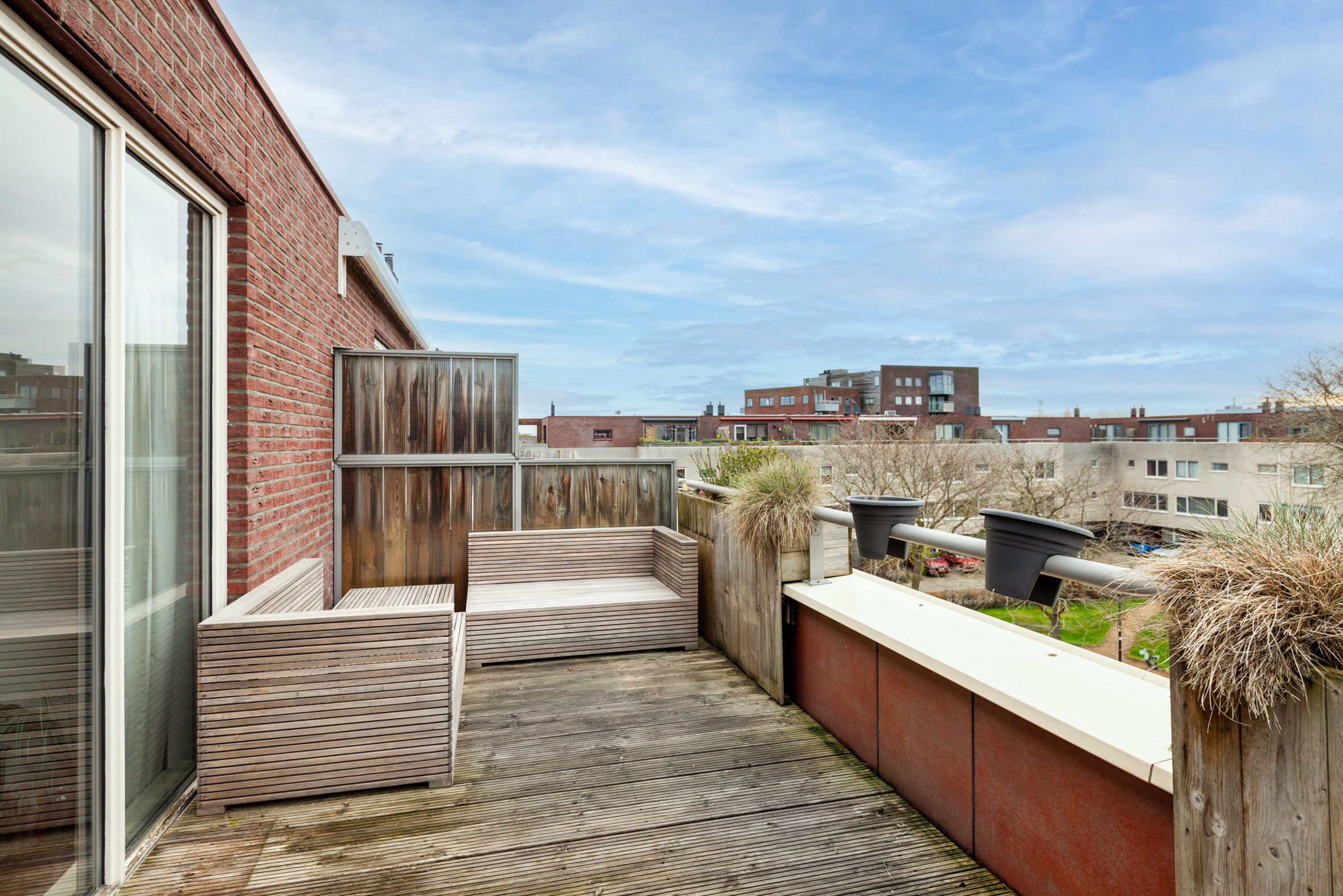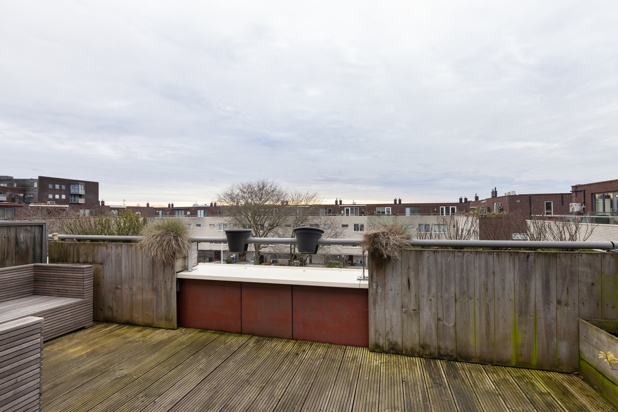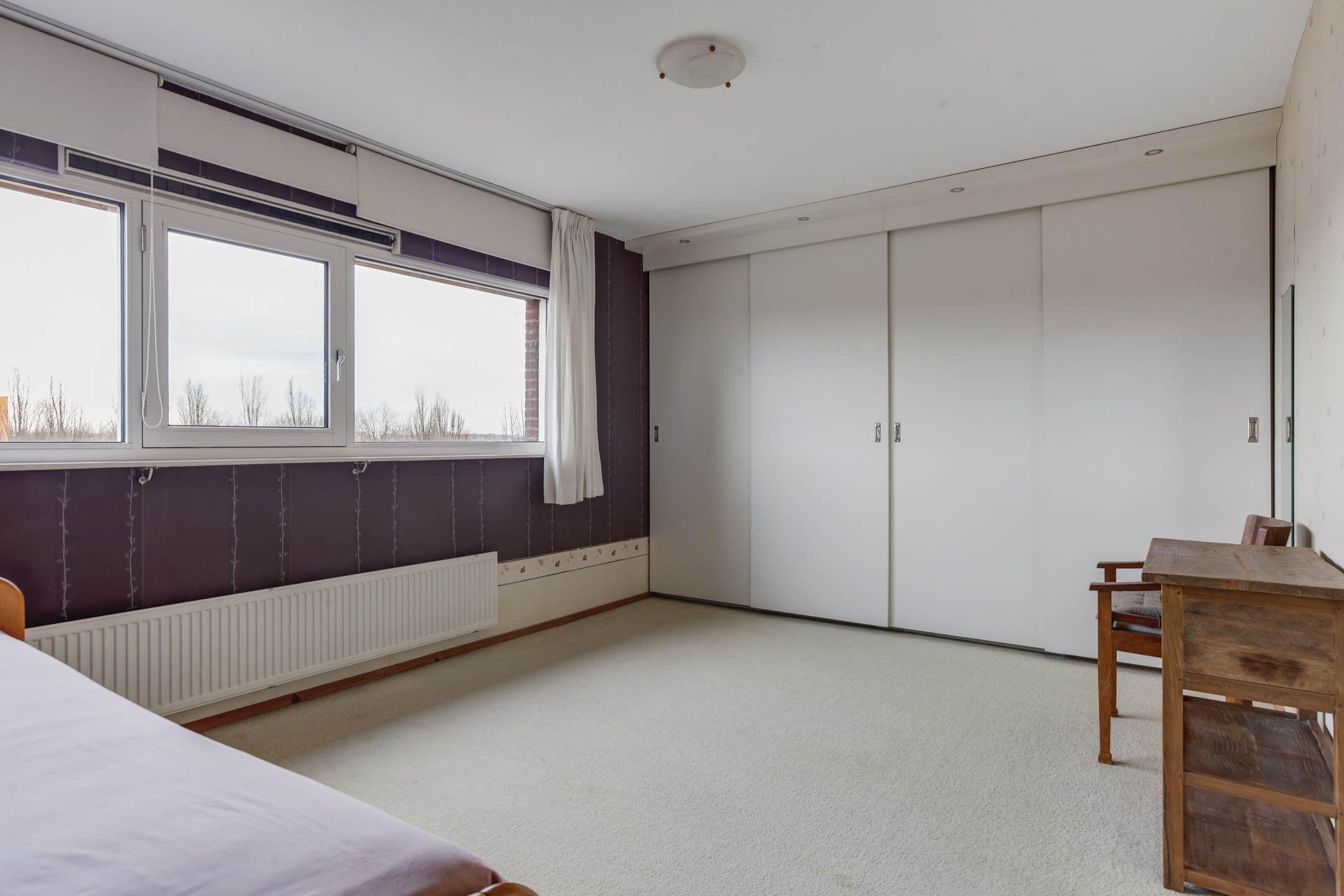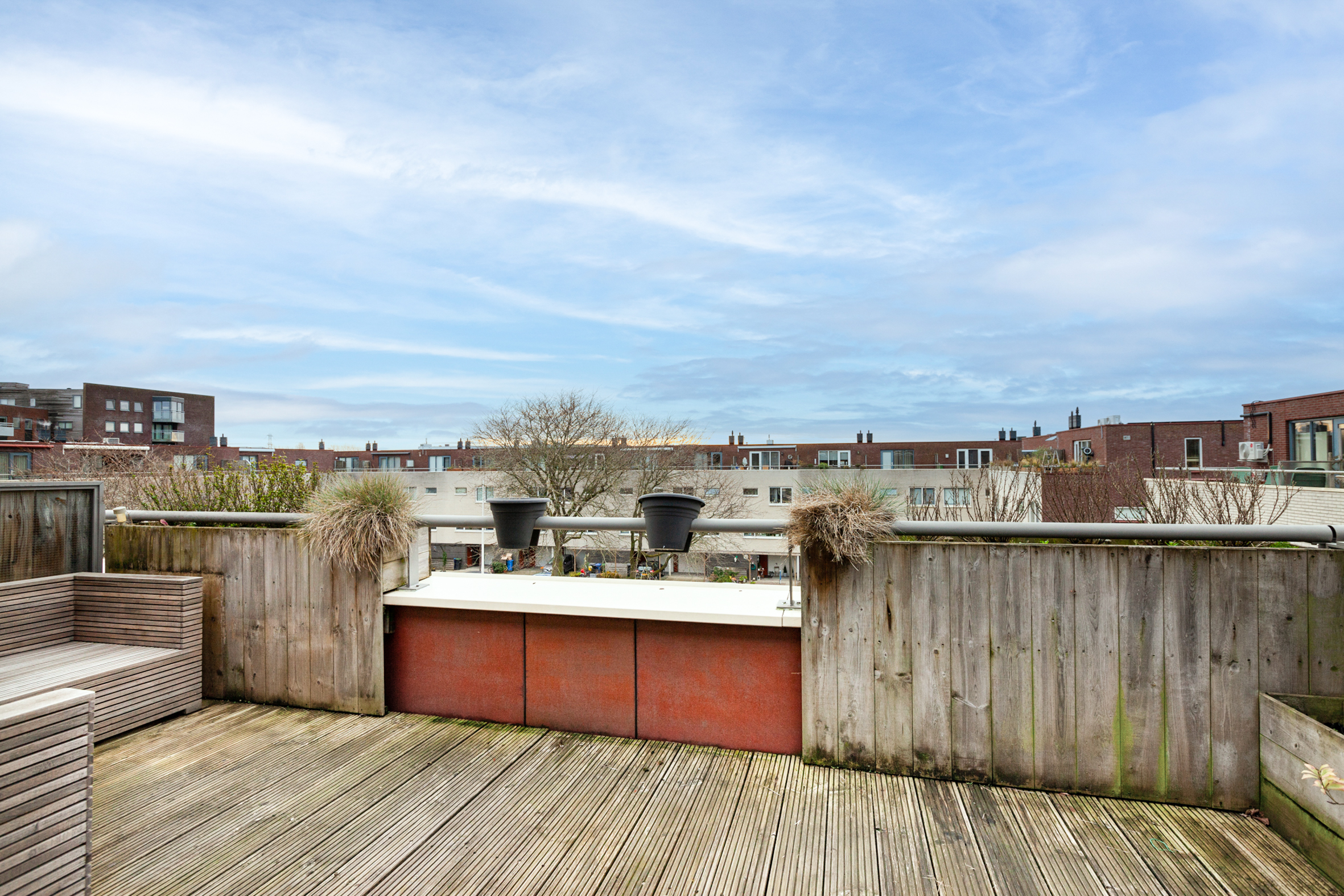 Op de derde verdieping bevindt zich de woningbrede vierde slaapkamer, voorzien van een vaste schuifkastenwand. Vanaf de overloop is daarnaast een ruime berging bereikbaar, ideaal voor het opbergen van allerlei spullen. Via een deur op de overloop is het zonnige dakterras te bereiken, gunstig gelegen op het zuidoosten. Een fijne, beschutte plek waar je in alle rust kunt ontspannen en genieten van de prettige woonomgeving.