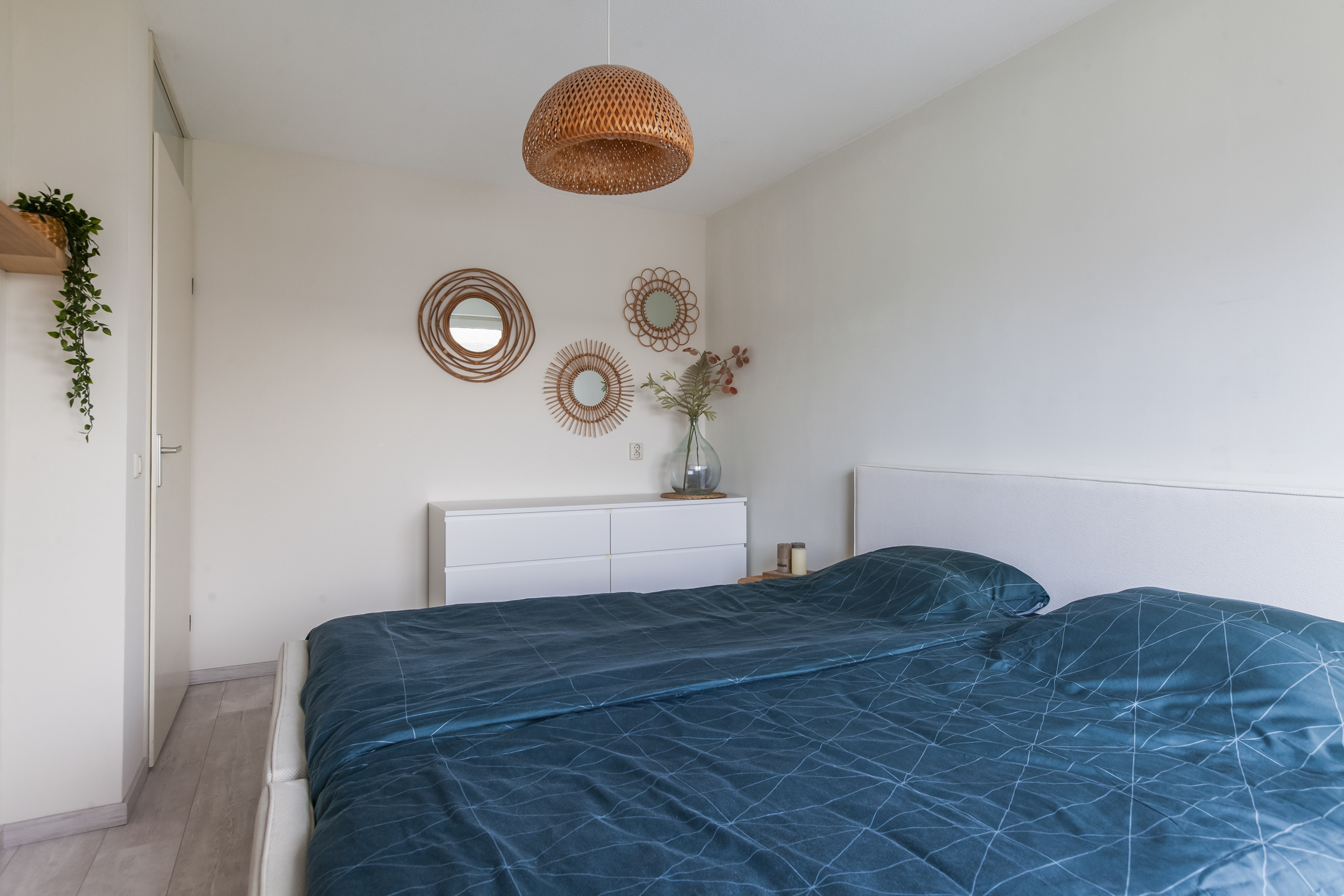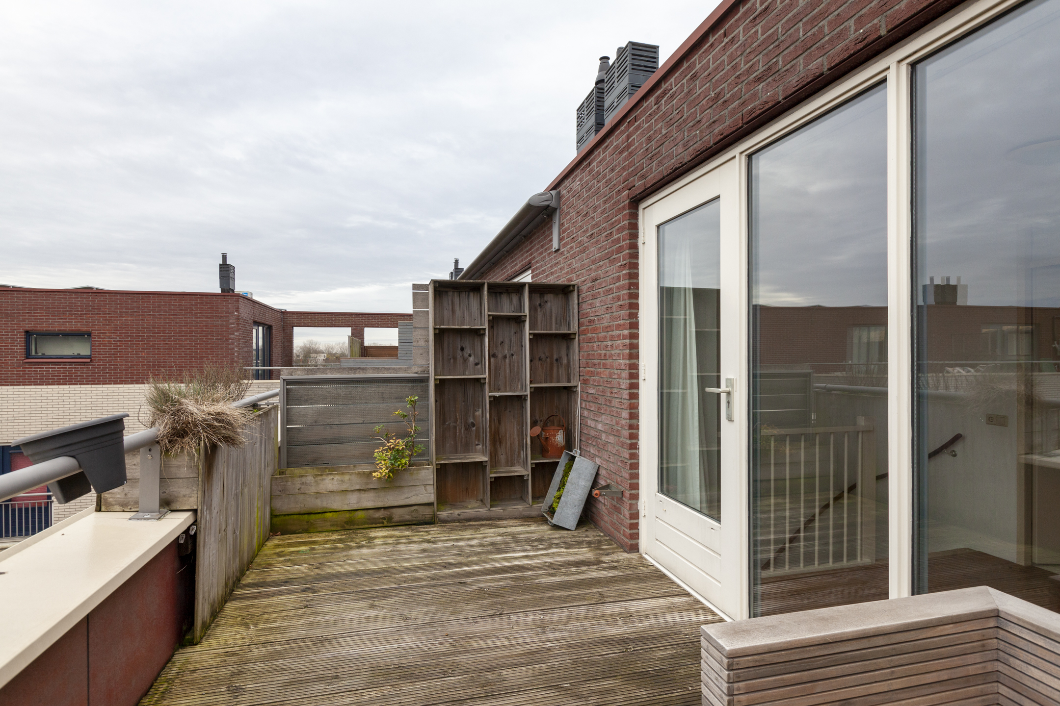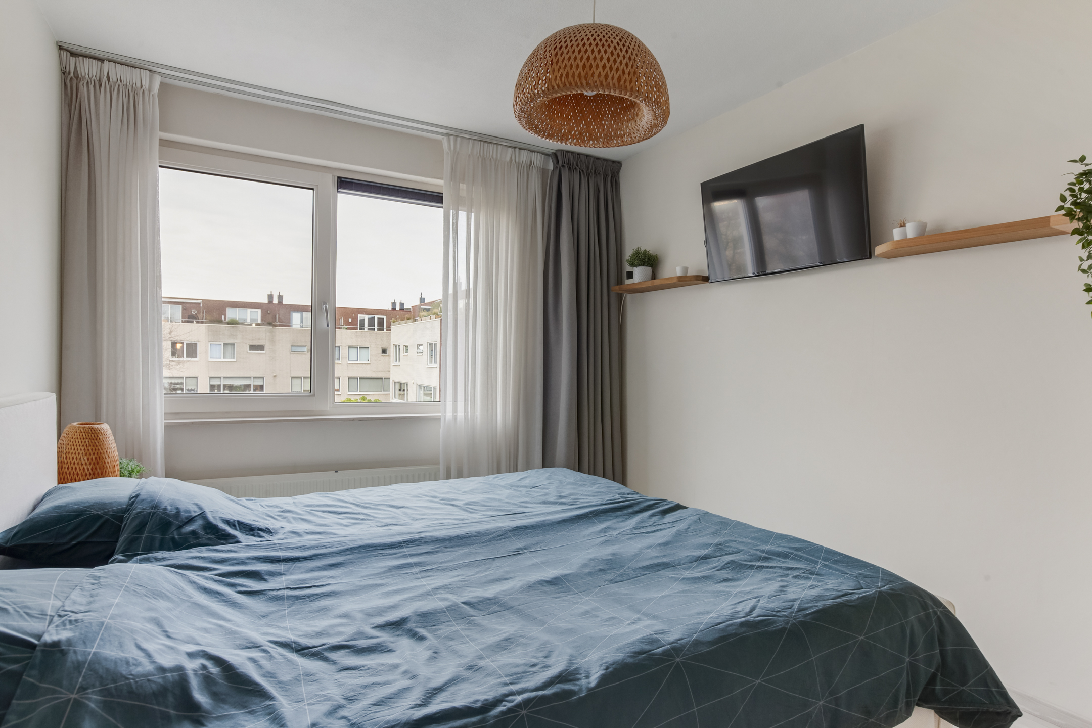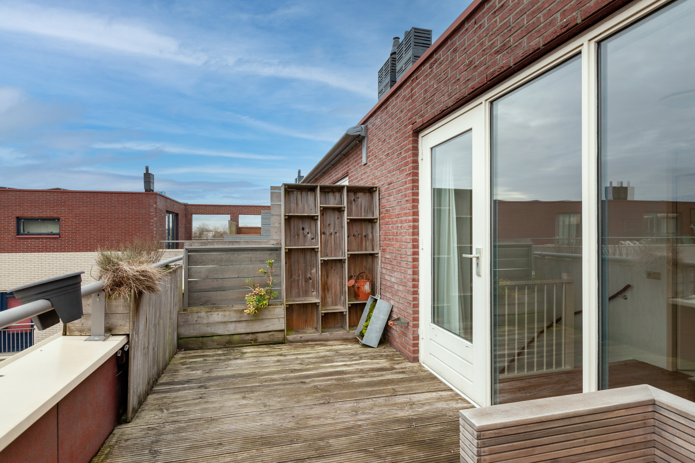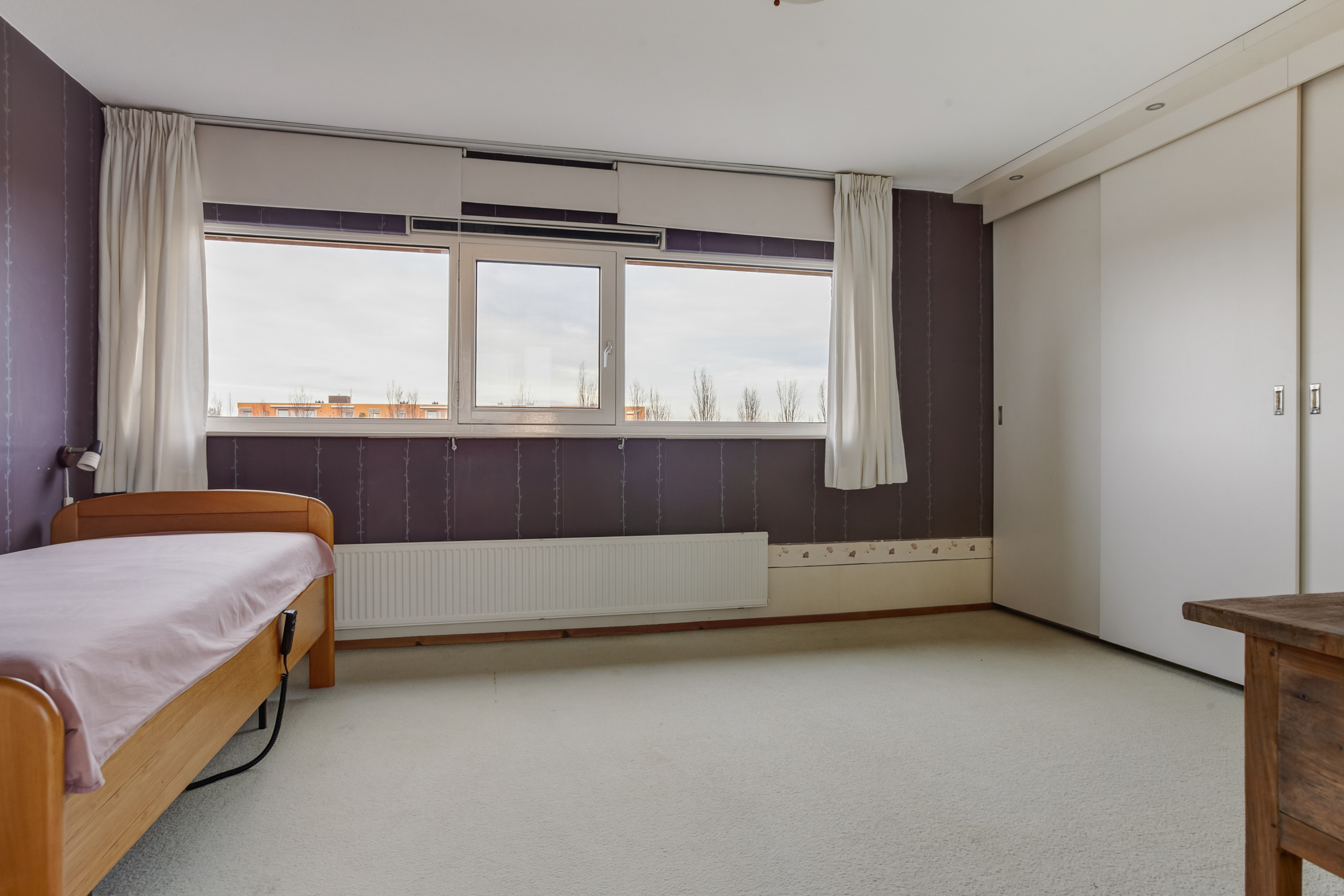 Op de derde verdieping bevindt zich de woningbrede vierde slaapkamer, voorzien van een vaste schuifkastenwand. Vanaf de overloop is daarnaast een ruime berging bereikbaar, ideaal voor het opbergen van allerlei spullen. Via een deur op de overloop is het zonnige dakterras te bereiken, gunstig gelegen op het zuidoosten. Een fijne, beschutte plek waar je in alle rust kunt ontspannen en genieten van de prettige woonomgeving.