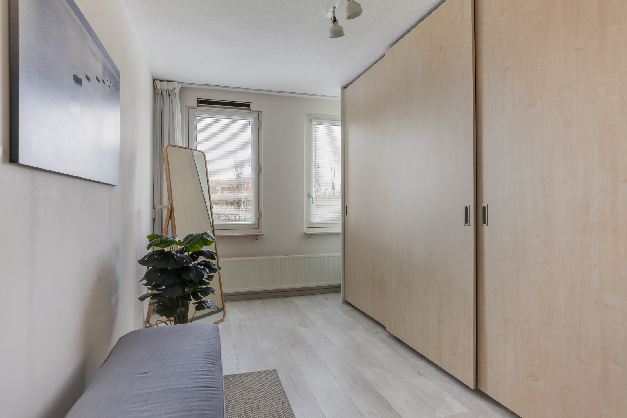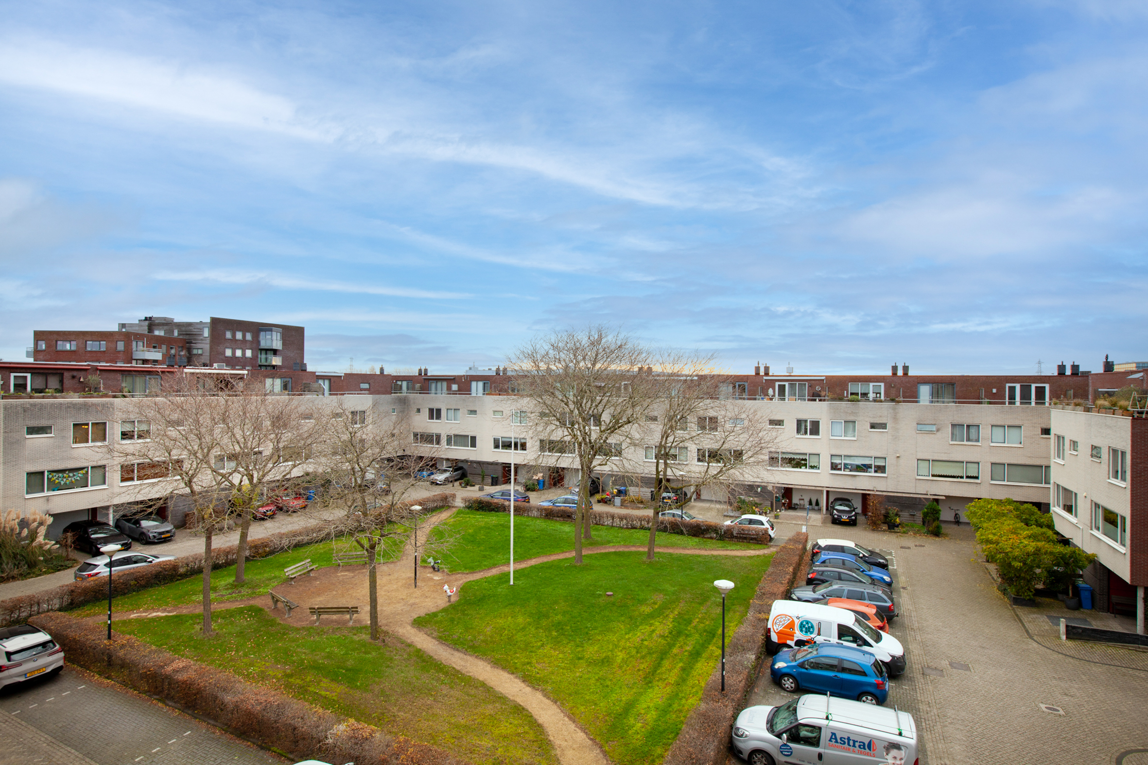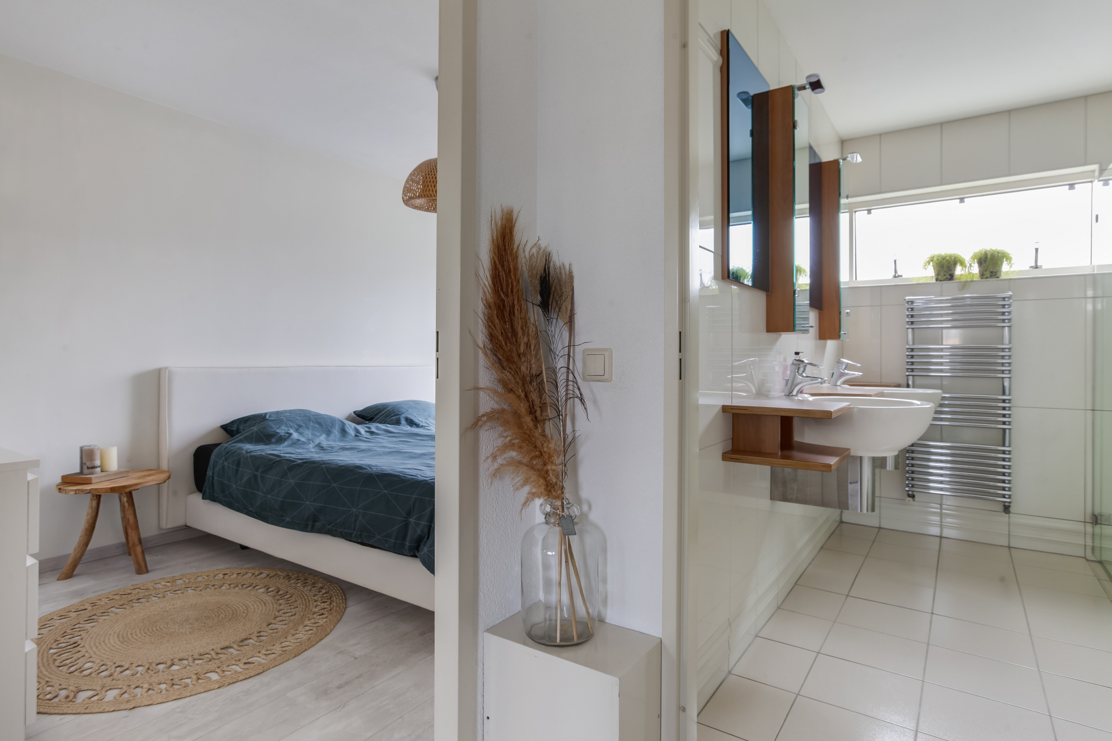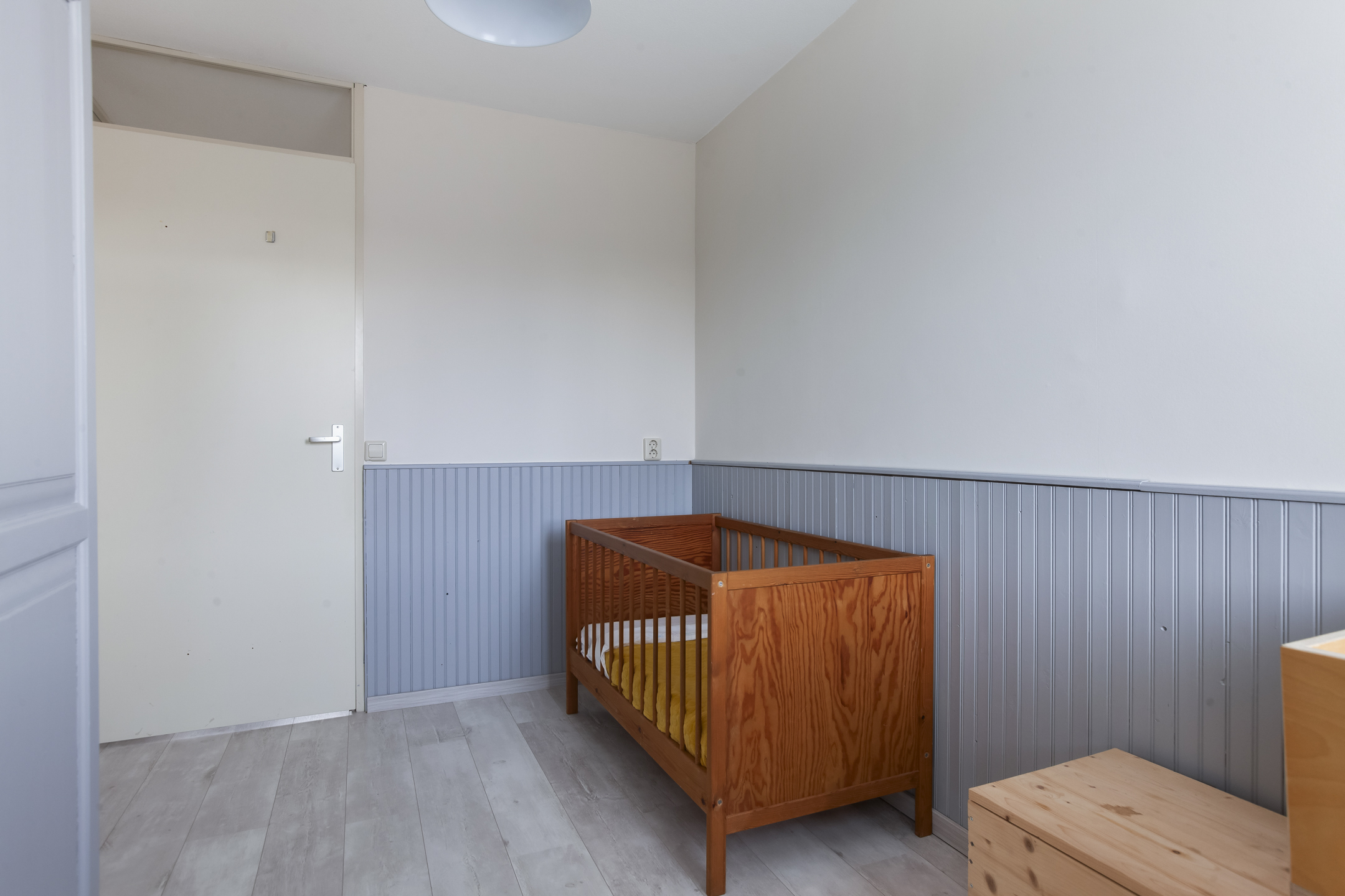 Op de derde verdieping bevindt zich de woningbrede vierde slaapkamer, voorzien van een vaste schuifkastenwand. Vanaf de overloop is daarnaast een ruime berging bereikbaar, ideaal voor het opbergen van allerlei spullen. Via een deur op de overloop is het zonnige dakterras te bereiken, gunstig gelegen op het zuidoosten. Een fijne, beschutte plek waar je in alle rust kunt ontspannen en genieten van de prettige woonomgeving.