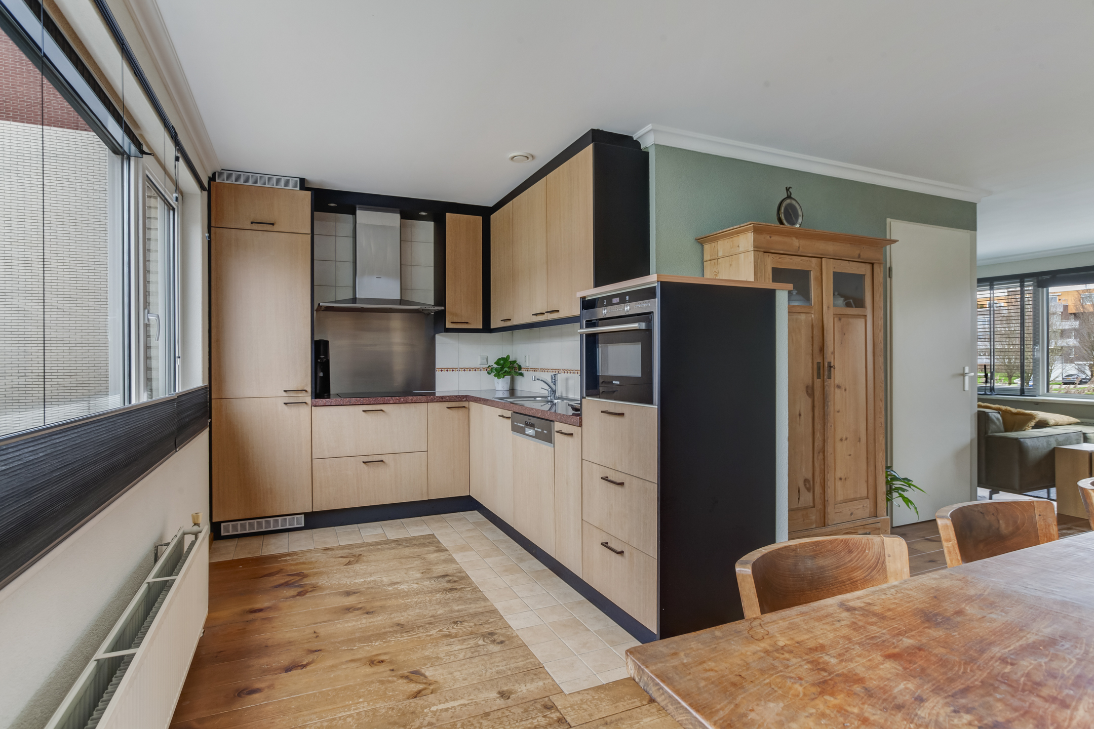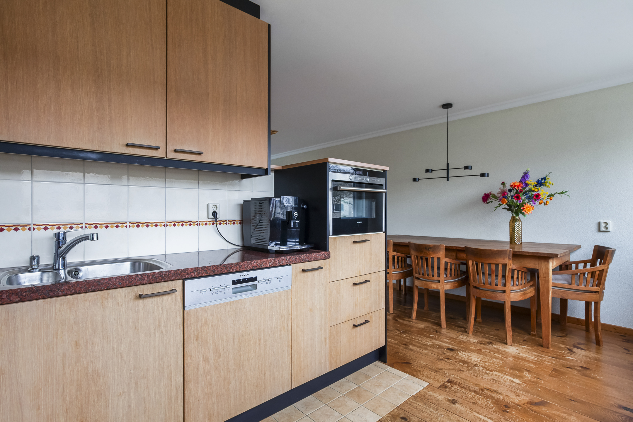 Aan de achterzijde is er dan ook ruimte voor het zitgedeelte, waarbij je optimaal geniet van het mooie uitzicht en de privacy. De keuken ligt aan de voorzijde van het huis en is opgesteld in een hoek. De volgende inbouwapparatuur is aanwezig, vernieuwd in 2020: