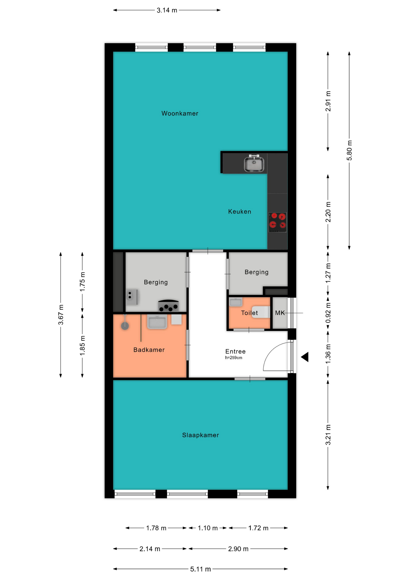 Voor de afmetingen en indeling raadpleeg de gedetailleerde plattegrond.