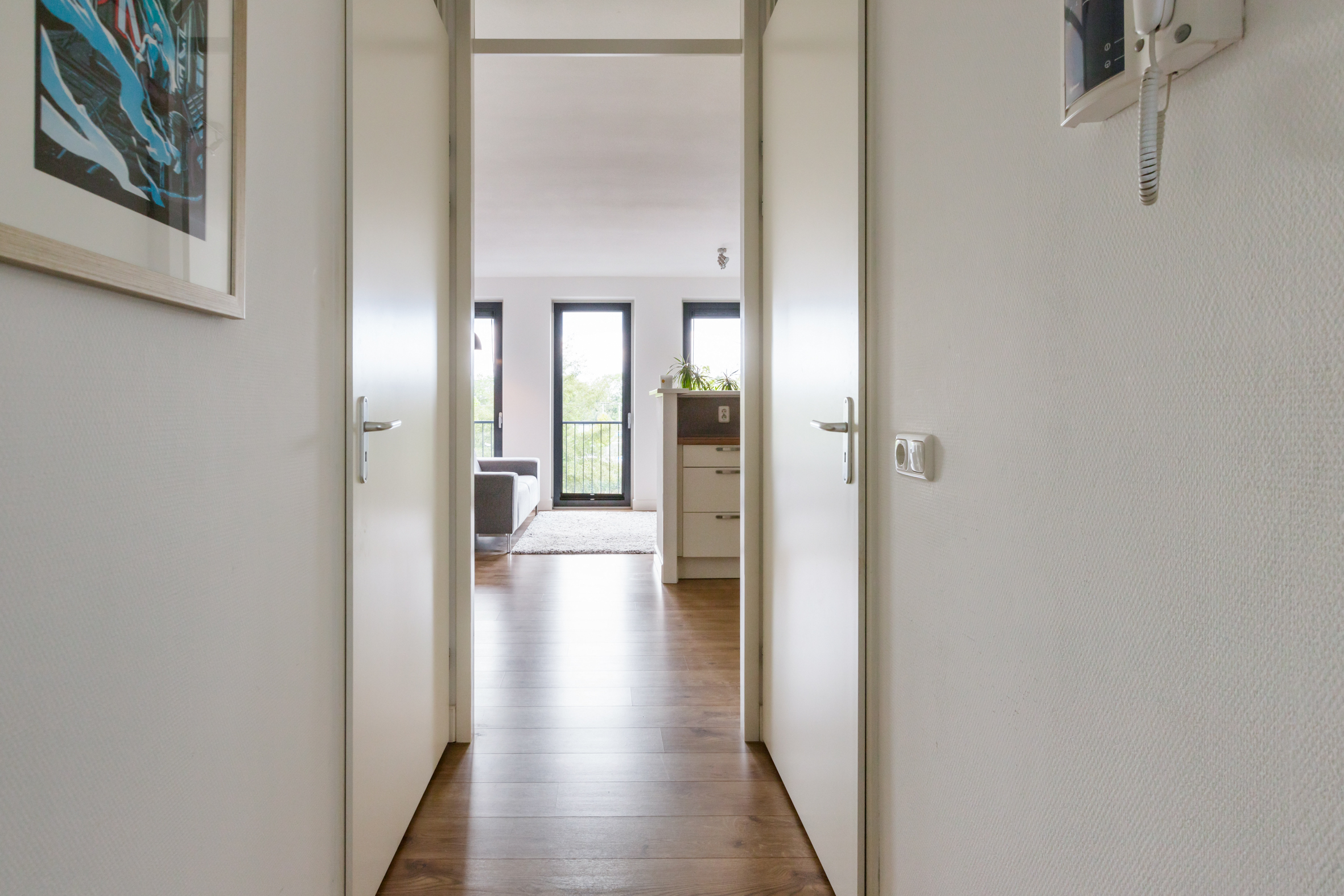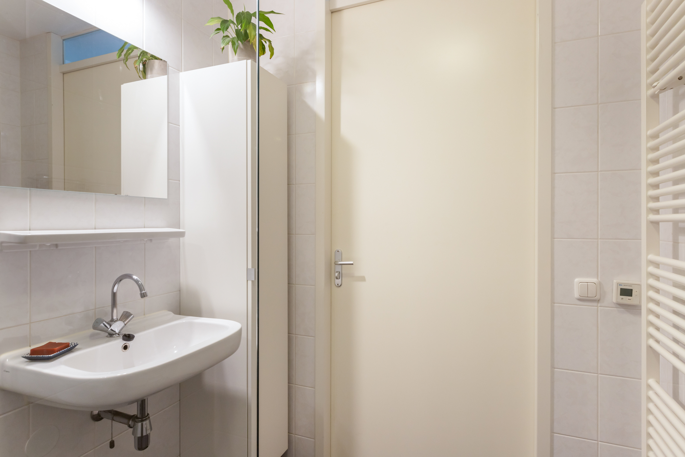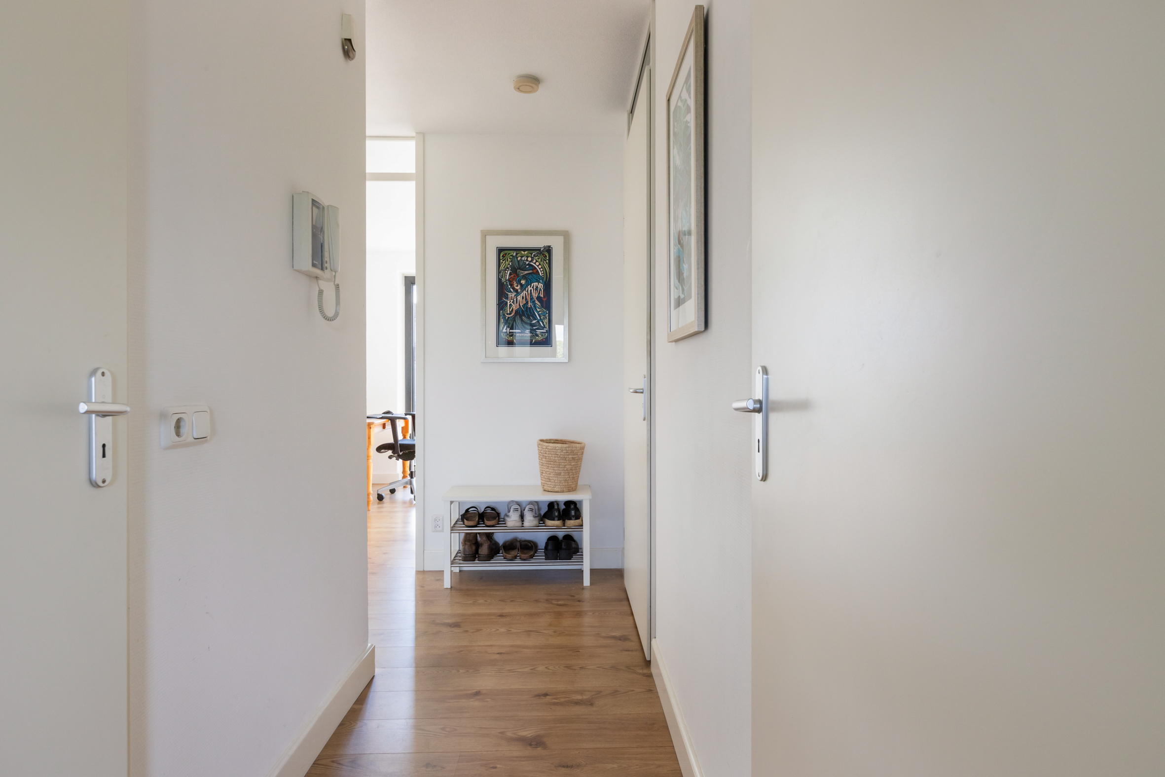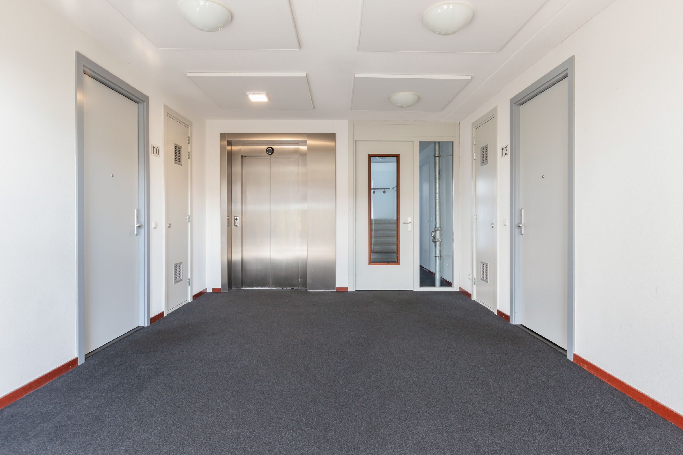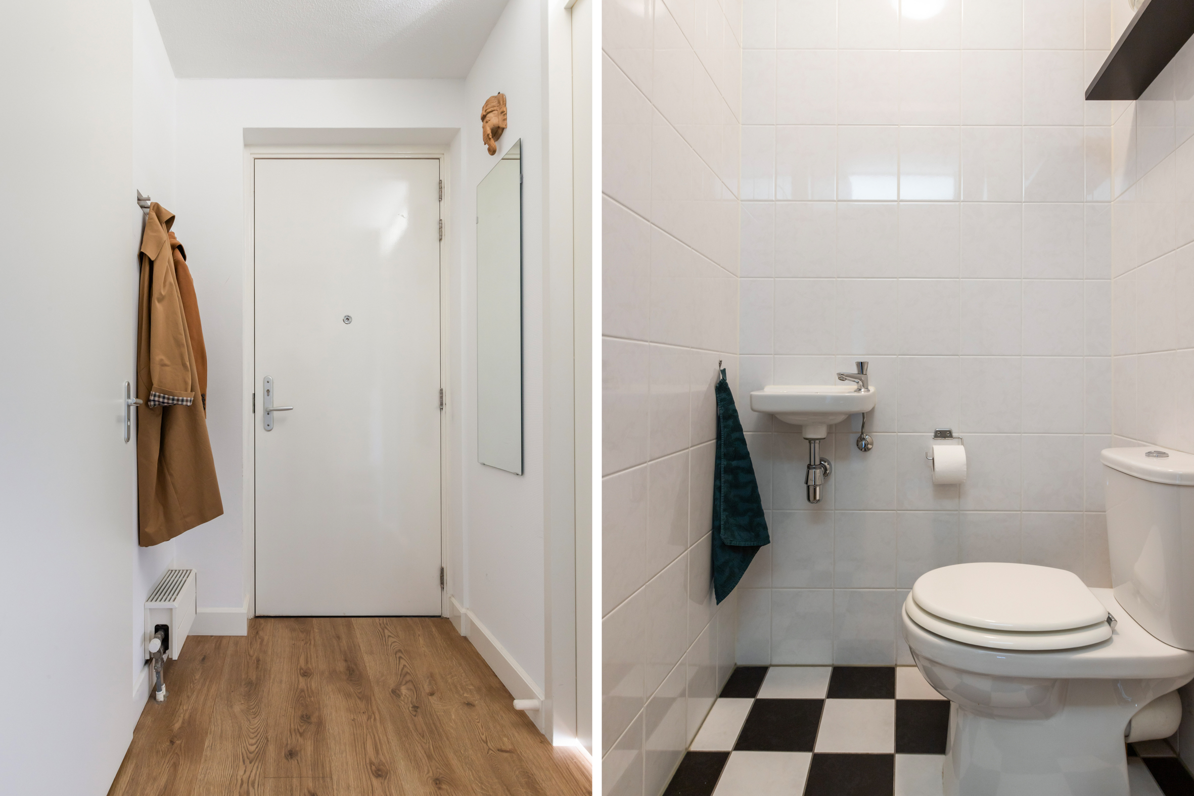 Via de gemeenschappelijke hal bereik je de voordeur en de naastgelegen meterkast. In de royale hal vind je de garderobe, toiletruimte en de badkamer. De badkamer is ruim en uitgerust met een inloopdouche, wastafel en een handdoekenradiator.