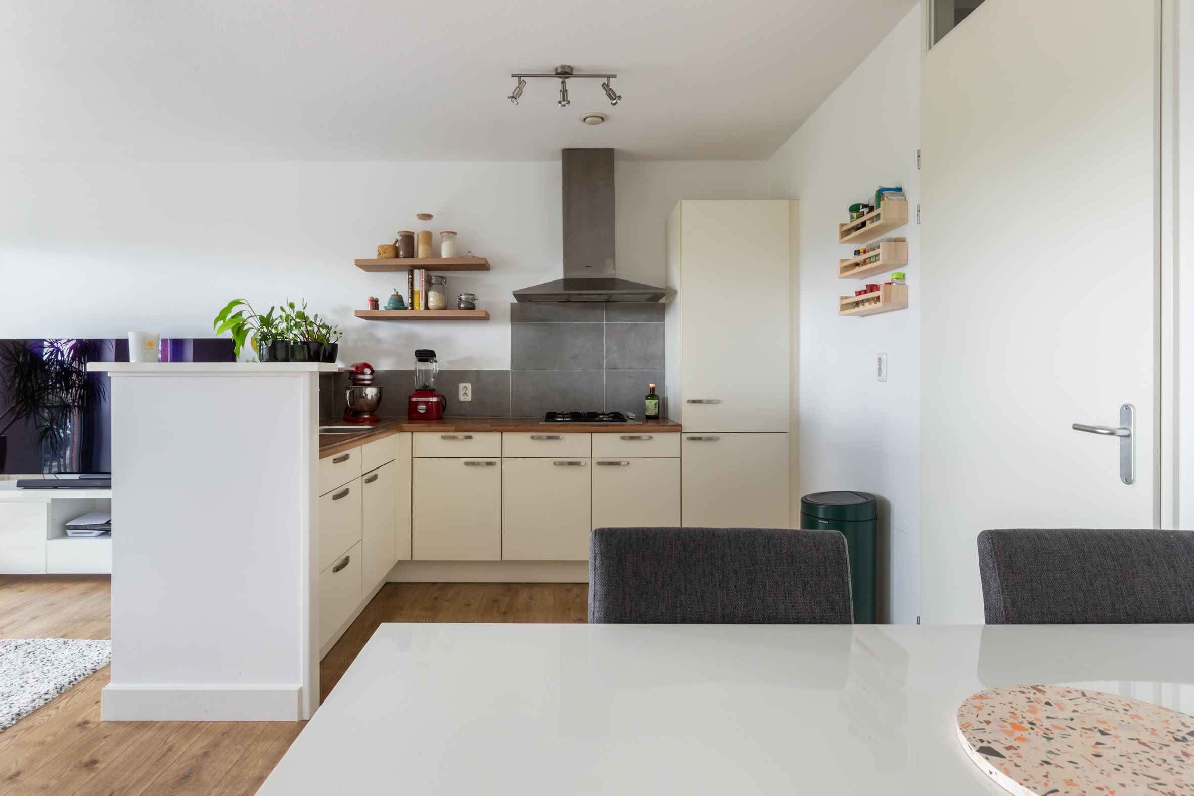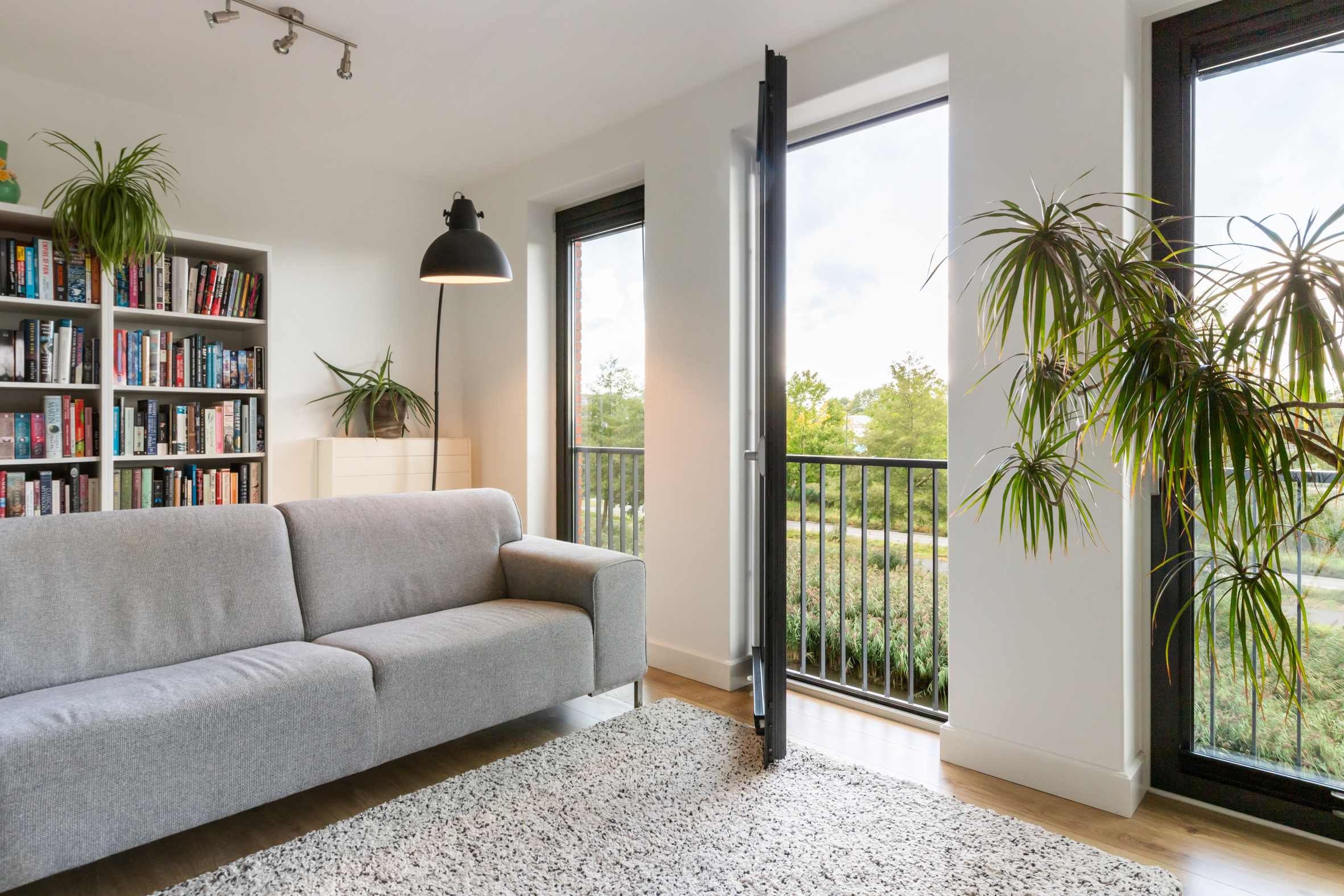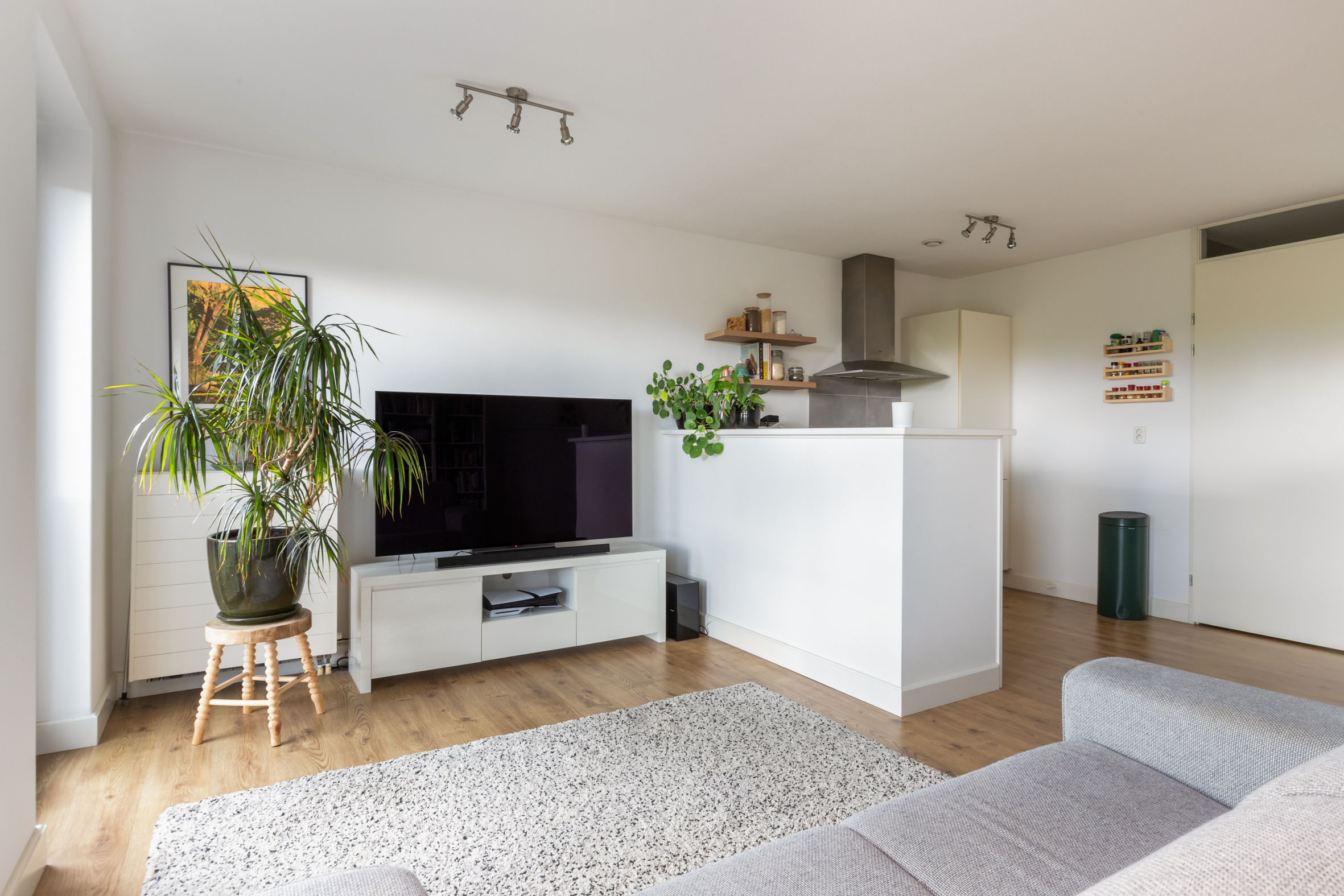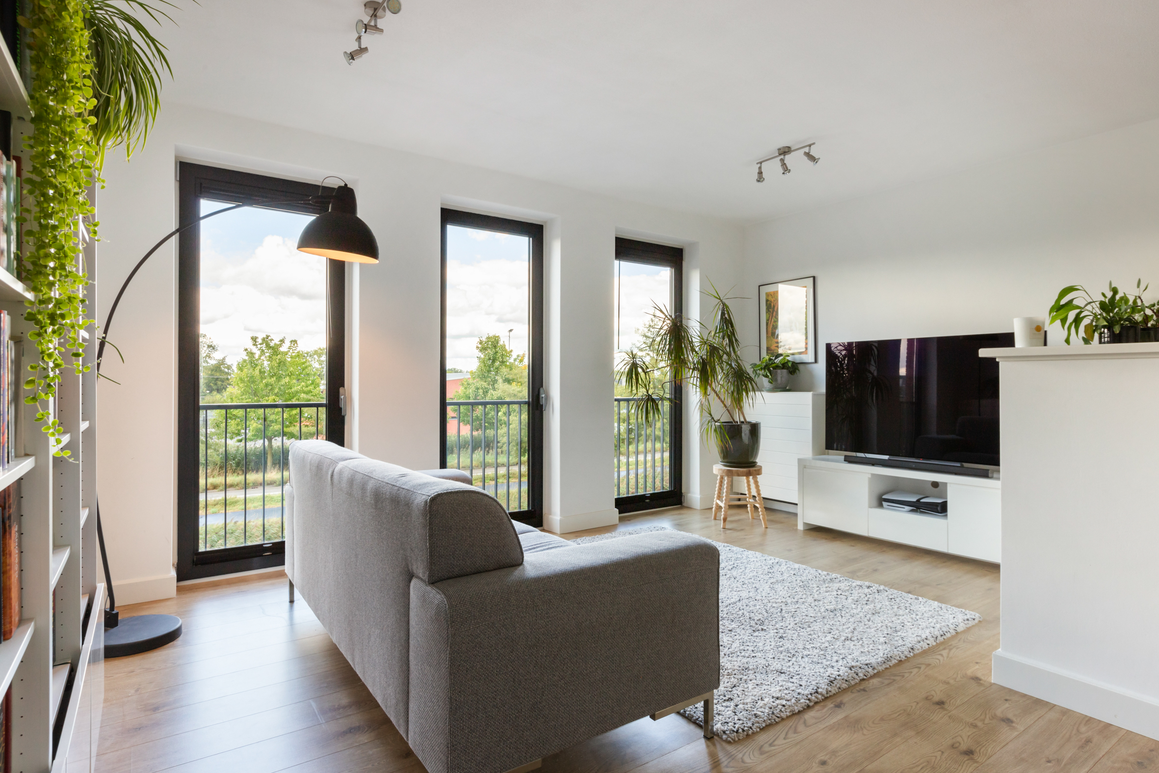Vanuit de hal stap je de lichte woonkamer binnen, waar de grote raampartijen met draaikiepsysteem voor een prachtige lichtinval zorgen. De drie ramen aan de voorzijde kunnen volledig open, zodat je het buitenleven naar binnen haalt en optimaal geniet van het vrije uitzicht.