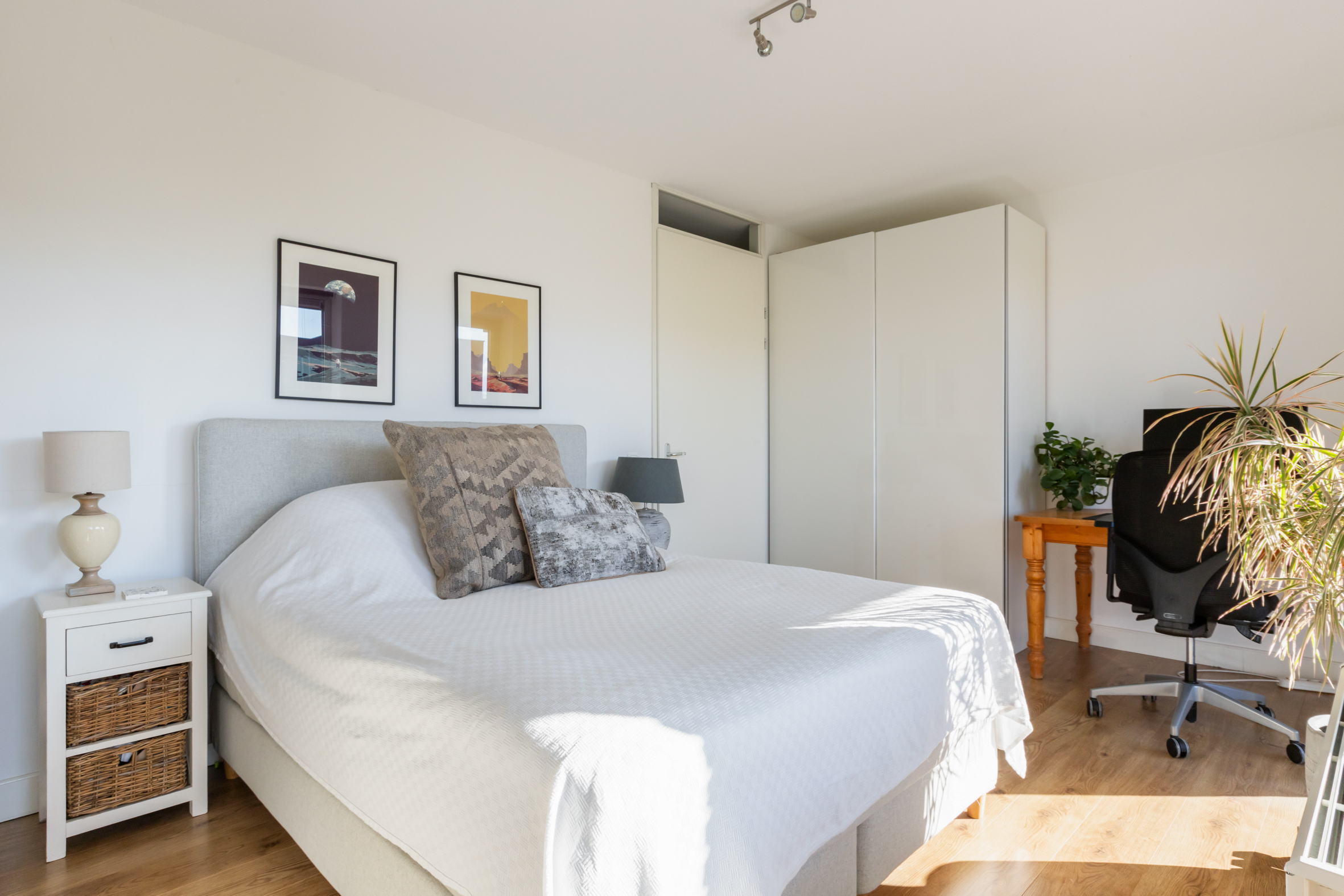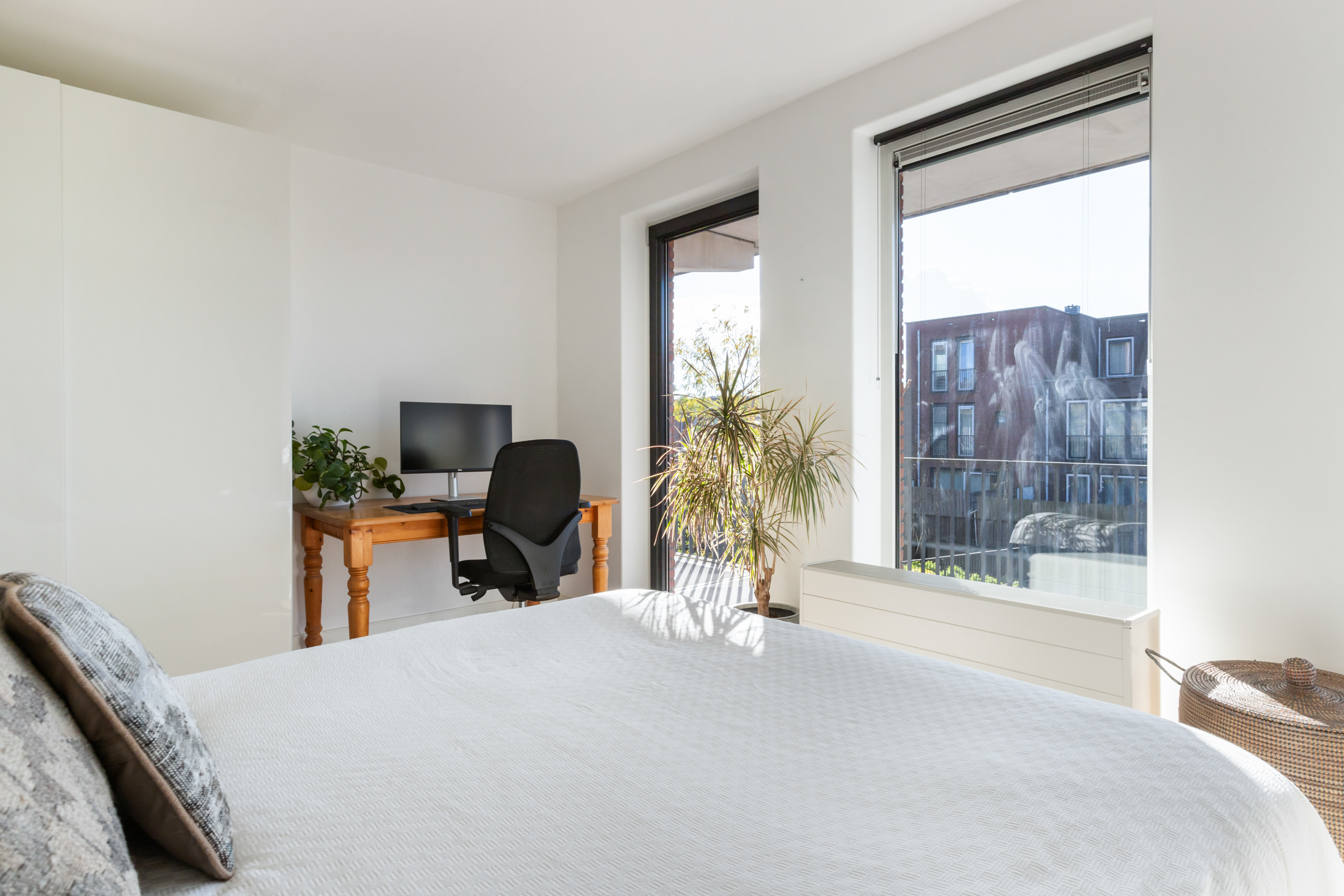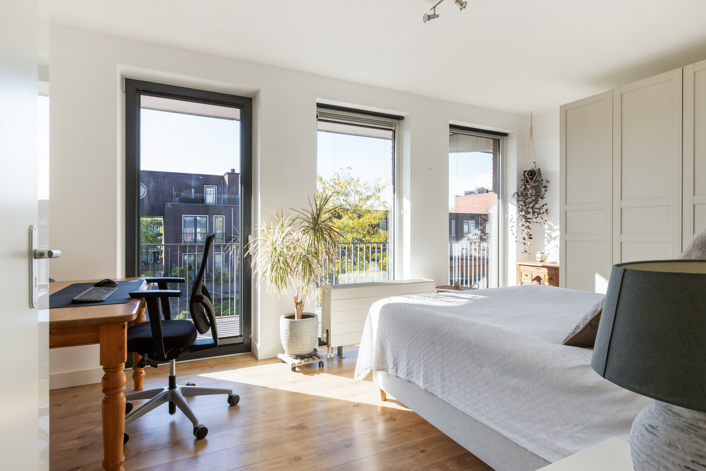 De hoofdslaapkamer aan de voorzijde van het appartement heeft eveneens grote raampartijen en biedt voldoende ruimte voor een tweepersoonsbed en een werkhoek.