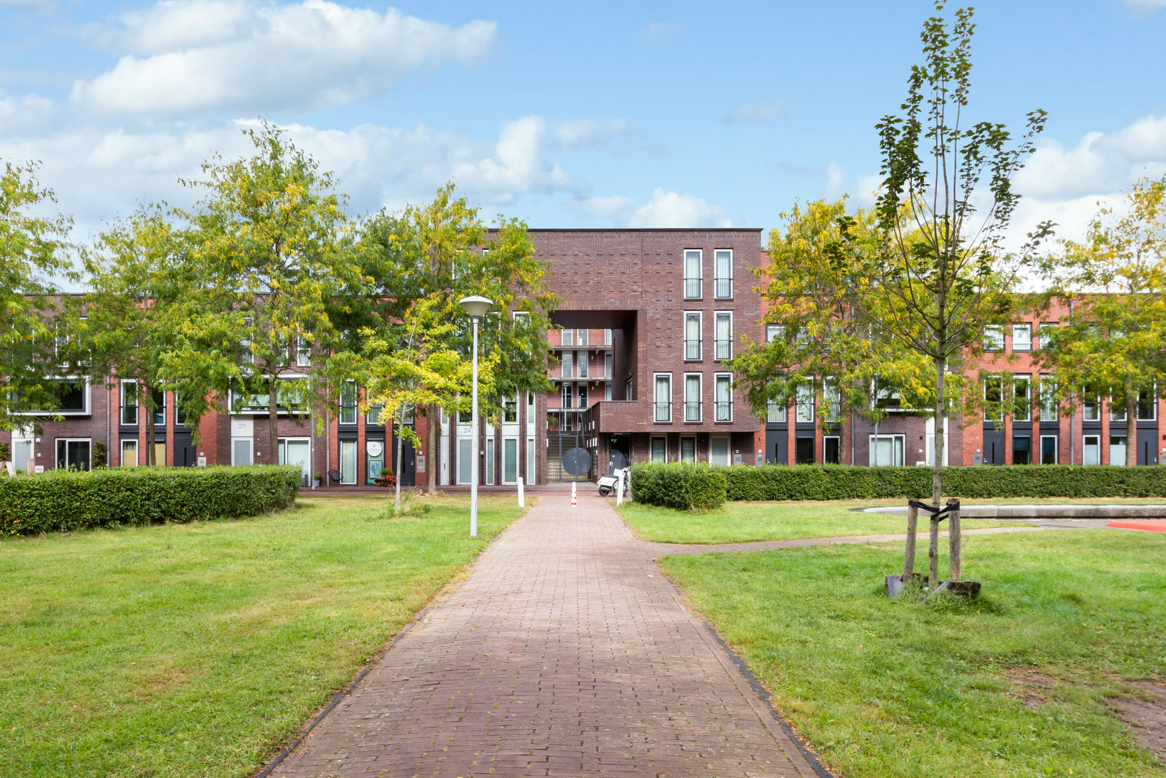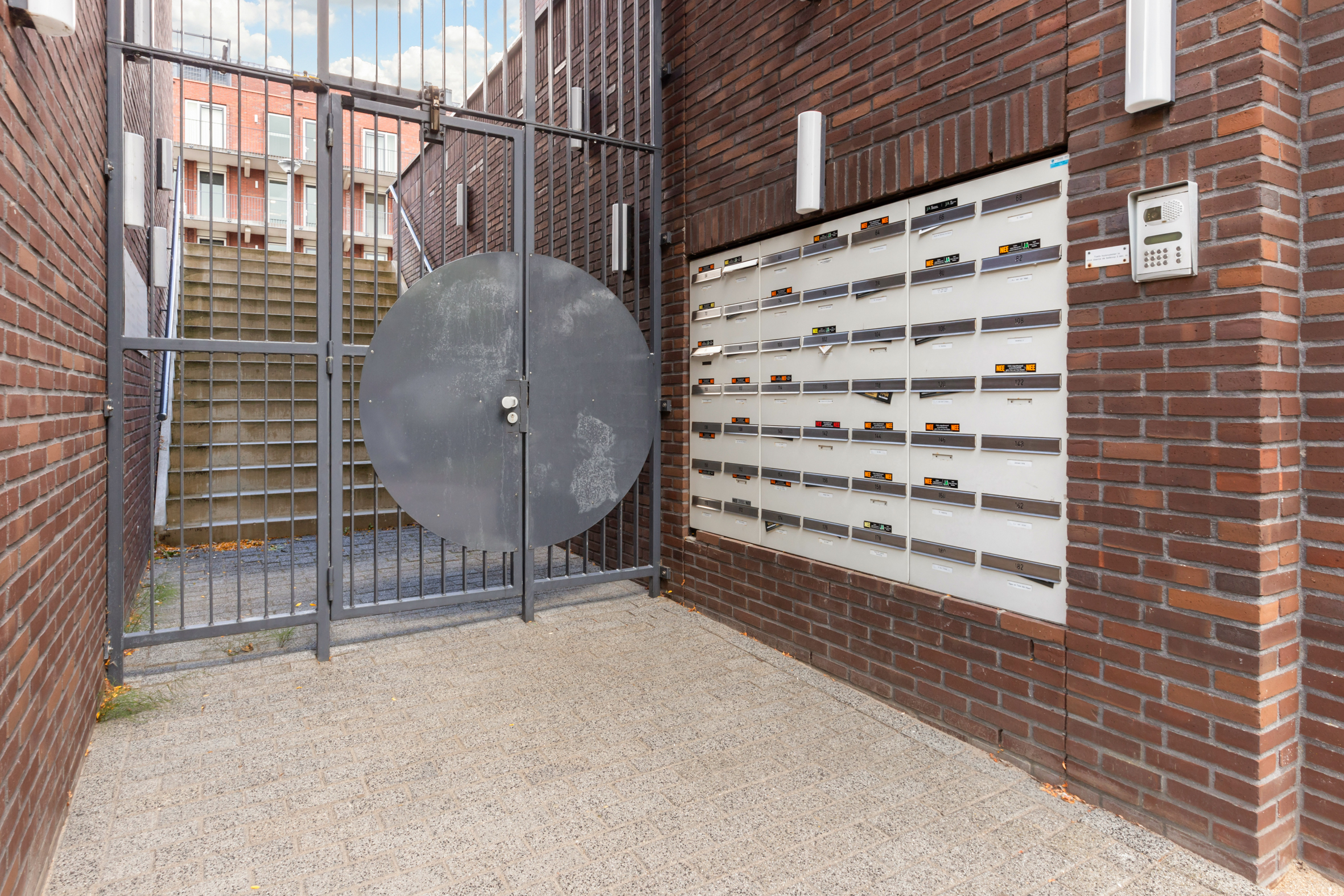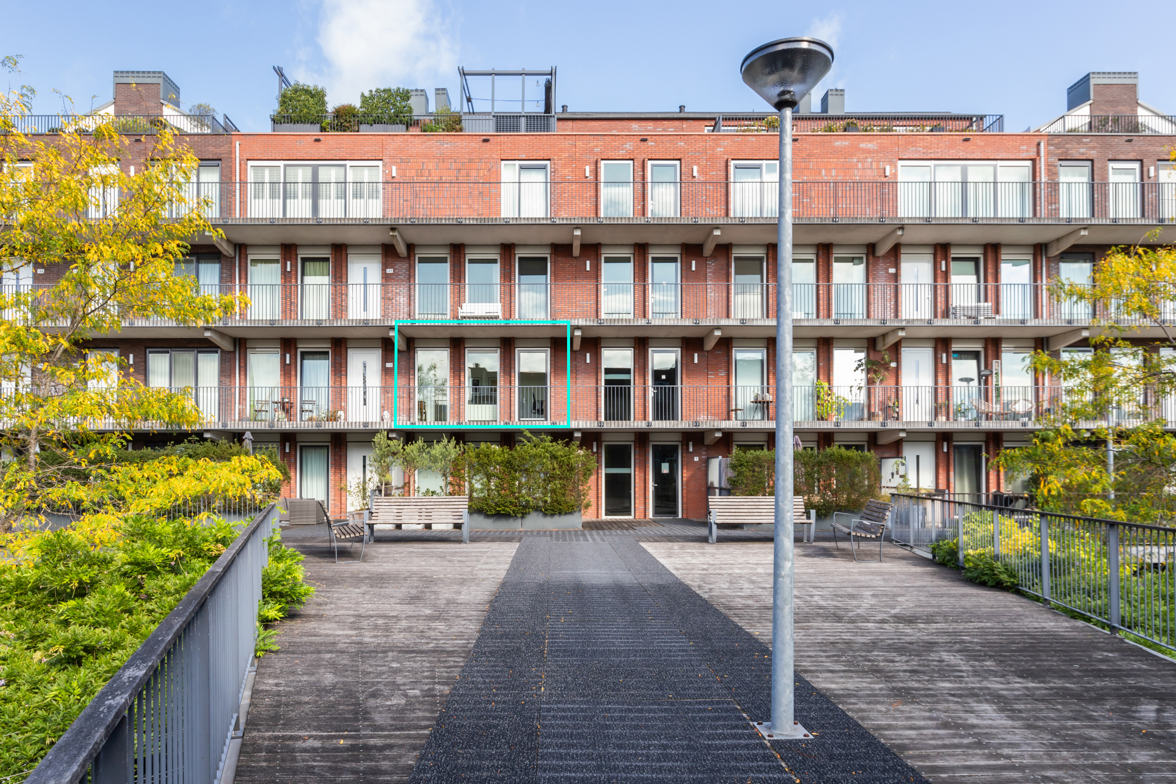 Er is een centrale entree met een afgesloten poort en een bellentableau met videofooninstallatie. Via een vaste trap is de aangelegde binnentuin te bereiken, gelegen op houten vlonders. Er is een tweede centrale entree met een liftinstallatie, waarbij dezelfde binnentuin te bereiken is. Op de begane grond, onder de vlonders, zijn de privéparkeerplaatsen te vinden en de algemene fietsenberging.