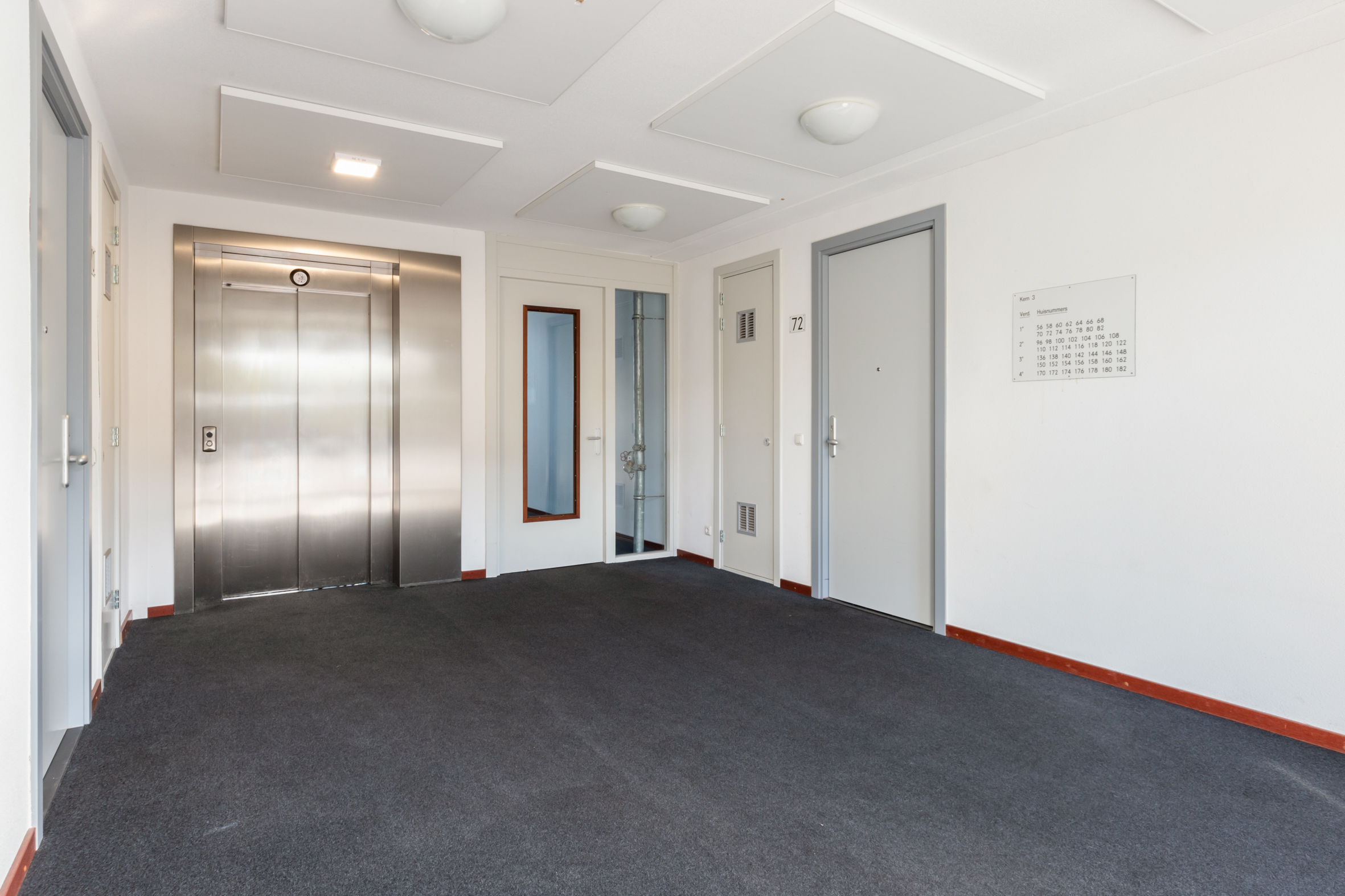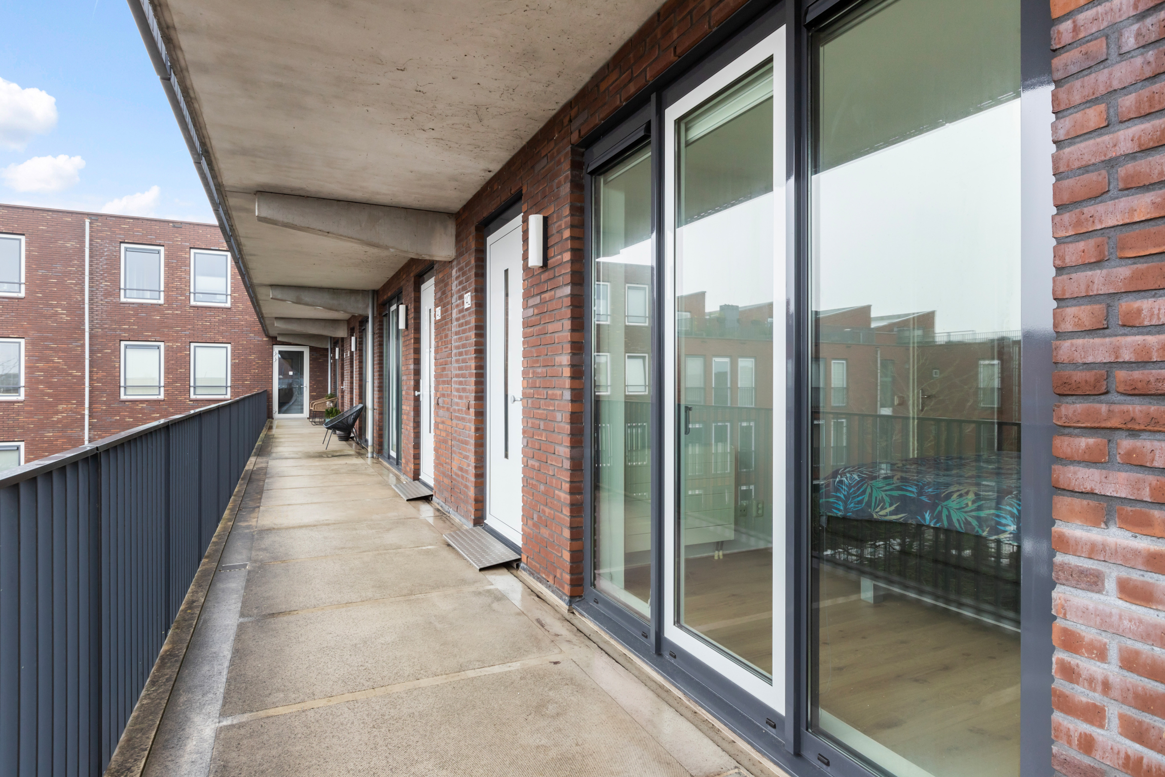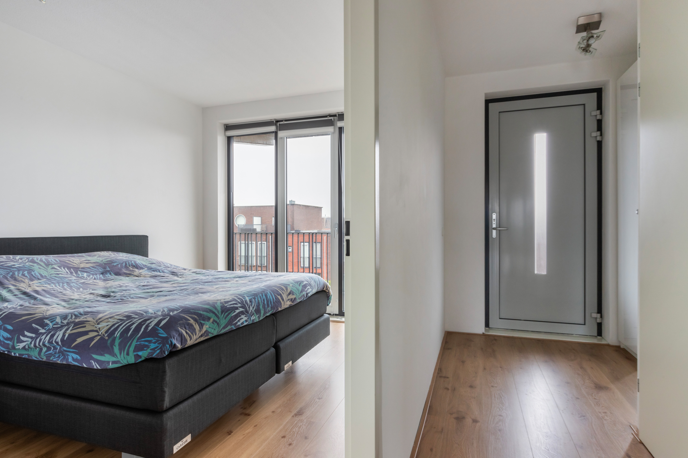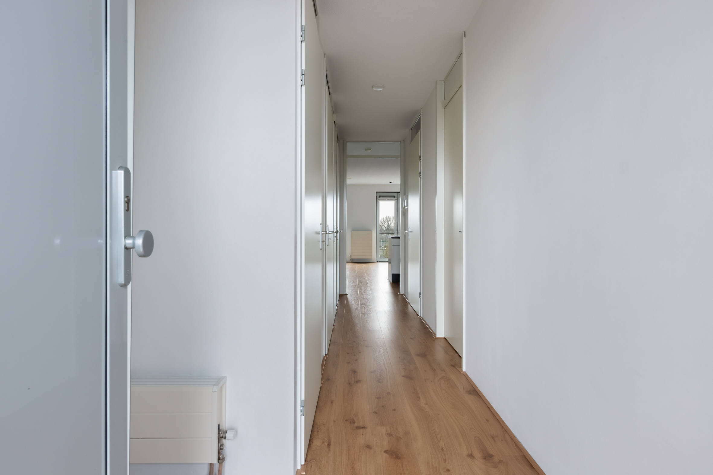 Op de derde verdieping bereik je via de galerij de voordeur van het appartement. De lange hal geeft toegang tot de verschillende vertrekken. Aan het begin van de hal is er volop ruimte voor de jassen en schoenen. De slaapkamer bevindt zich aan de voorzijde van het appartement.