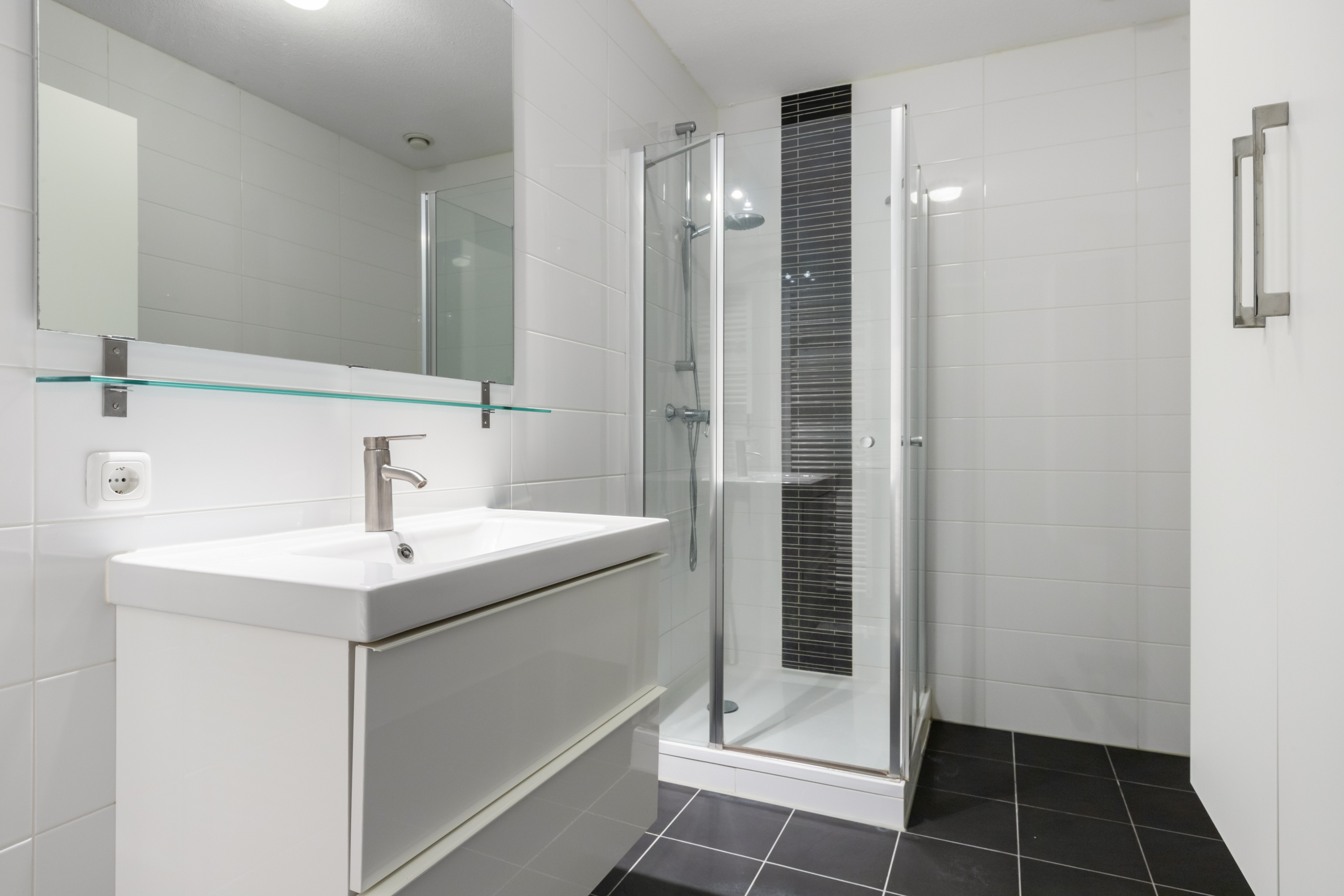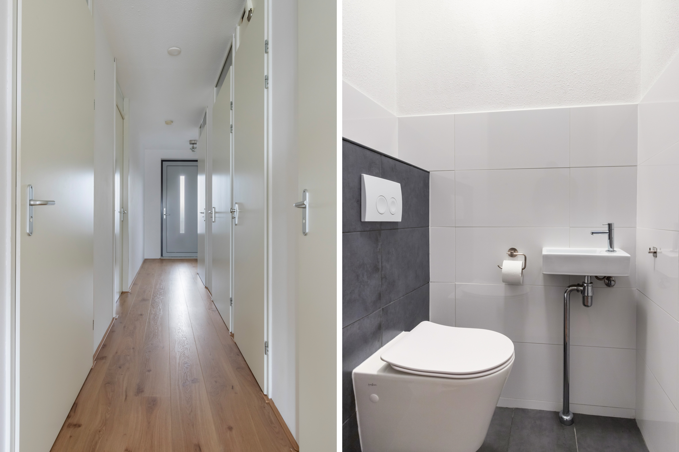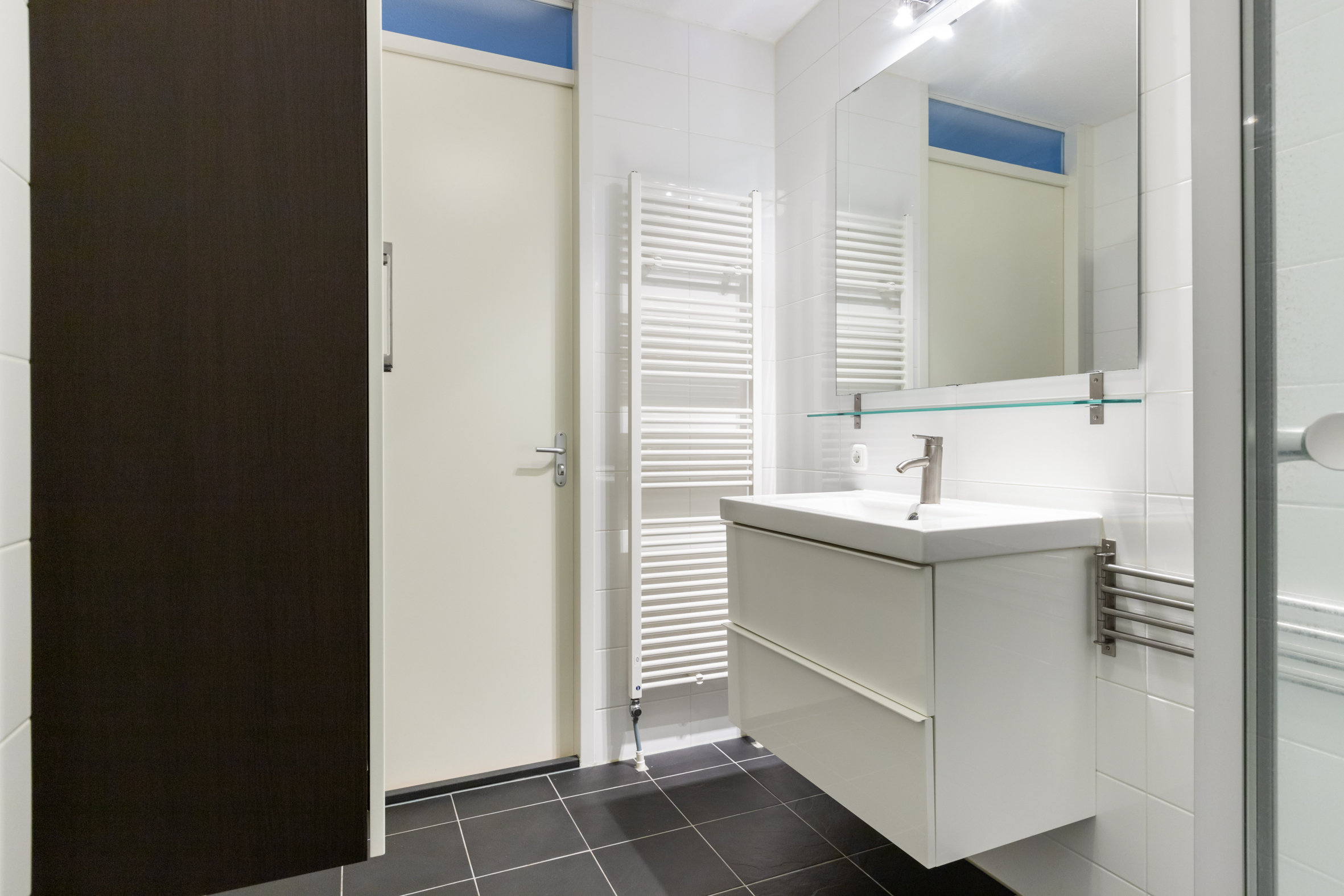 Terug in de hal zijn de separate toiletruimte en de badkamer bereikbaar. De badkamer is volledig betegeld en praktisch ingericht met een douche, een wastafelmeubel en een handdoekenradiator. Tegenover de slaapkamer bevindt zich een handige bergruimte met de opstelplaats voor de cv-installatie, mechanische ventilatie en voldoende ruimte voor wasmachine en droger.