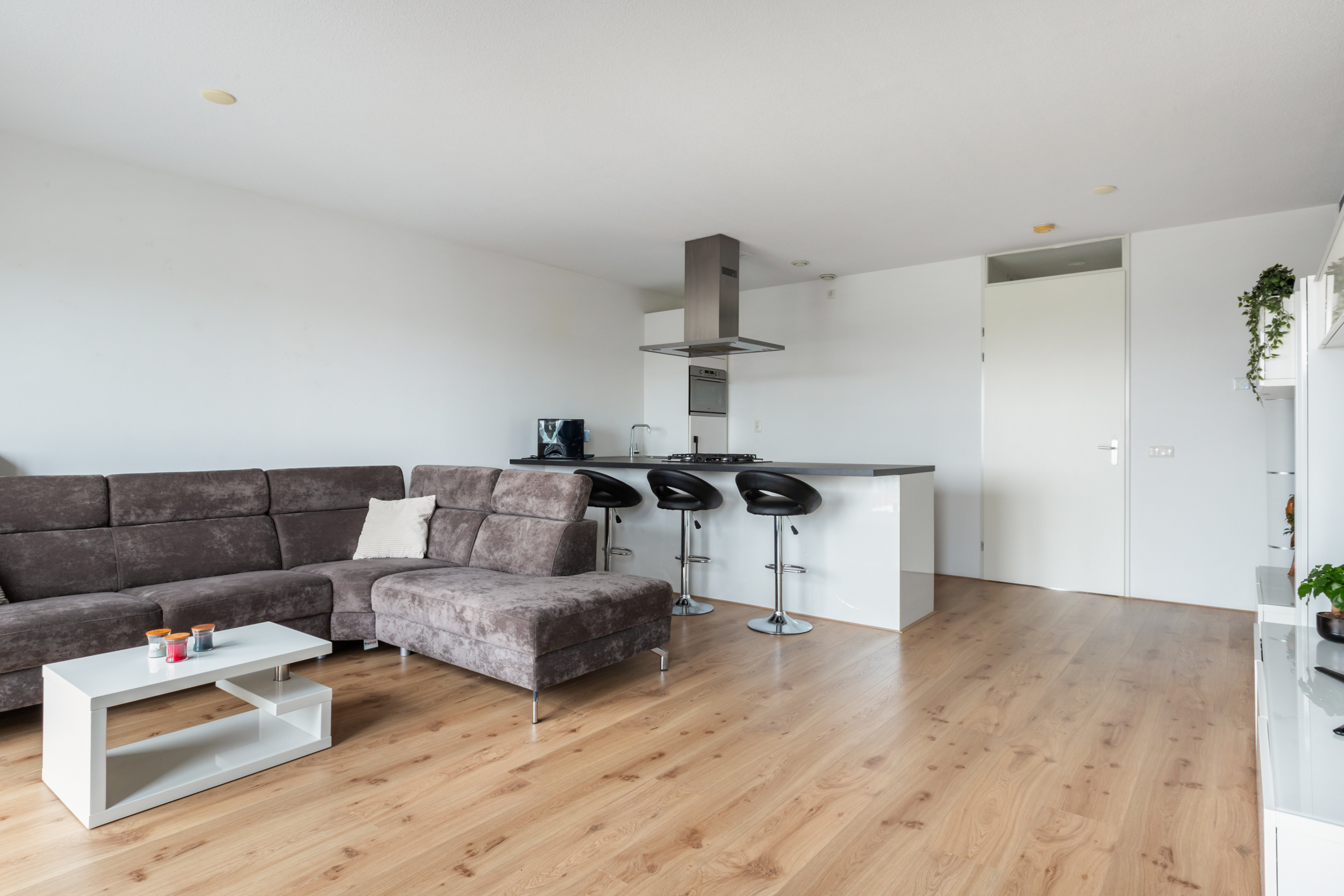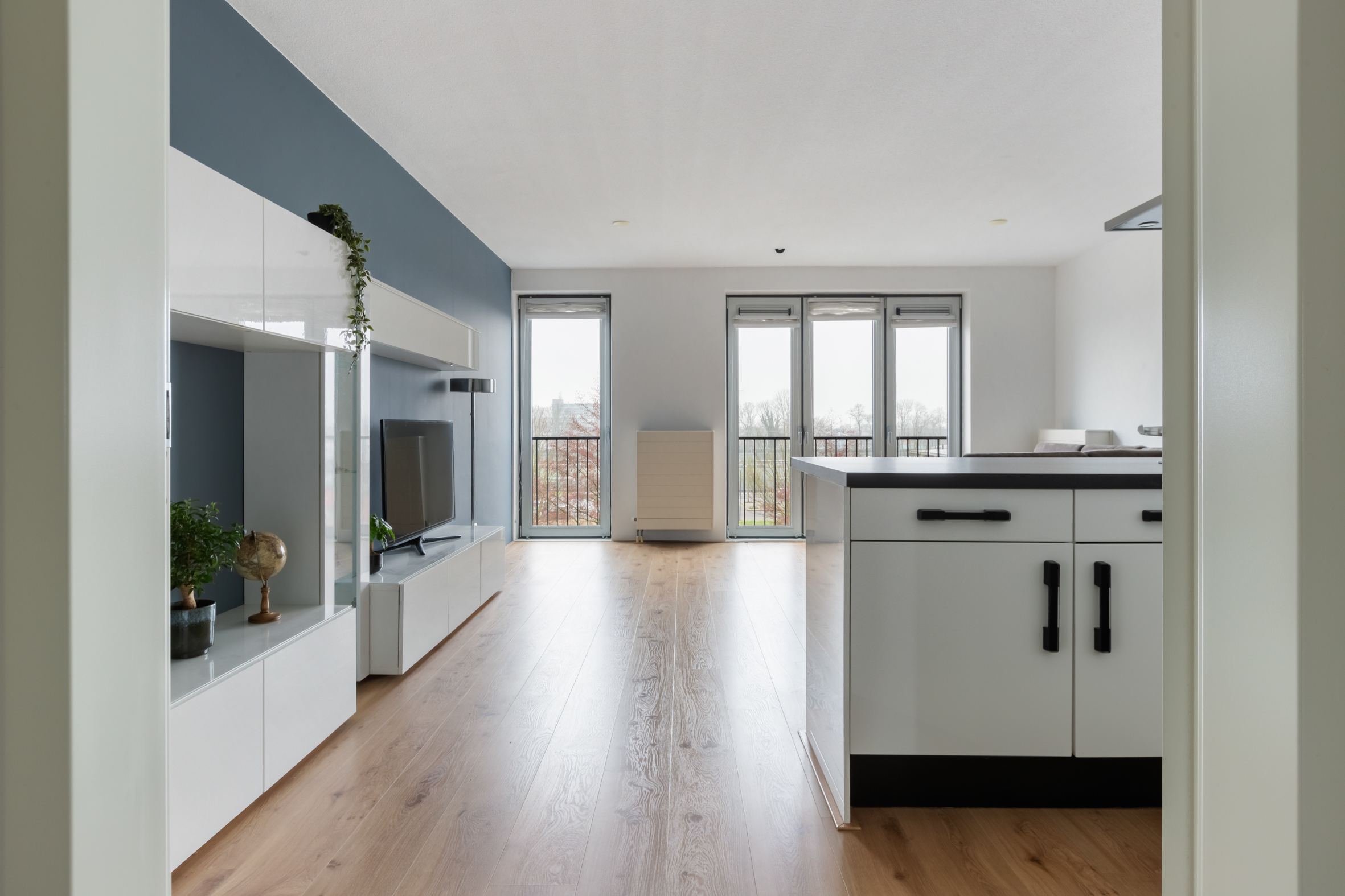 Vanuit de hal loop je door naar de lichte woonkamer met open keuken. De woonkamer is royaal opgezet en beschikt over grote raampartijen met prachtig uitzicht over de omgeving. De drie ramen aan de voorzijde kunnen volledig worden geopend, zodat je het buitenleven naar binnen haalt en optimaal geniet van het vrije uitzicht.