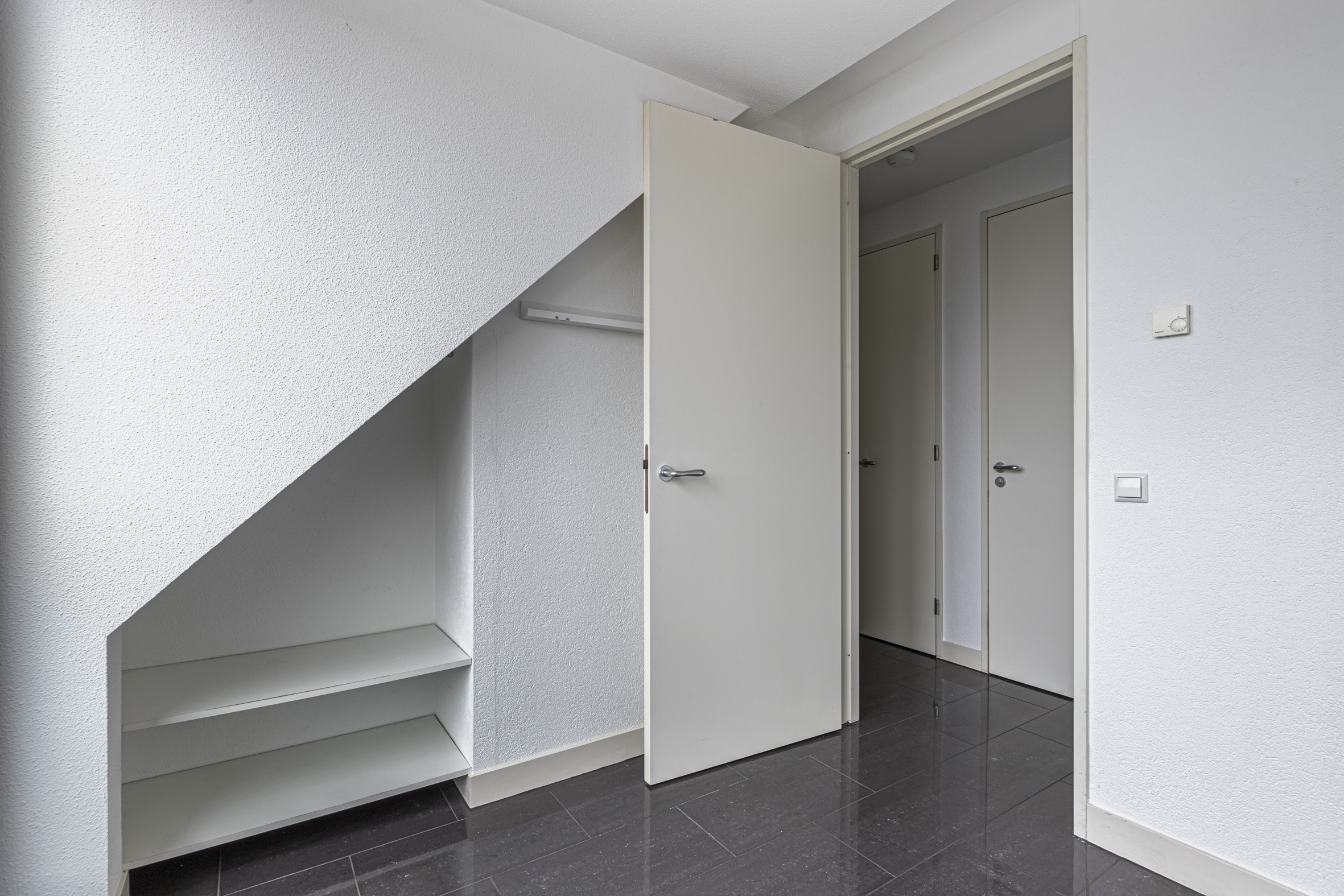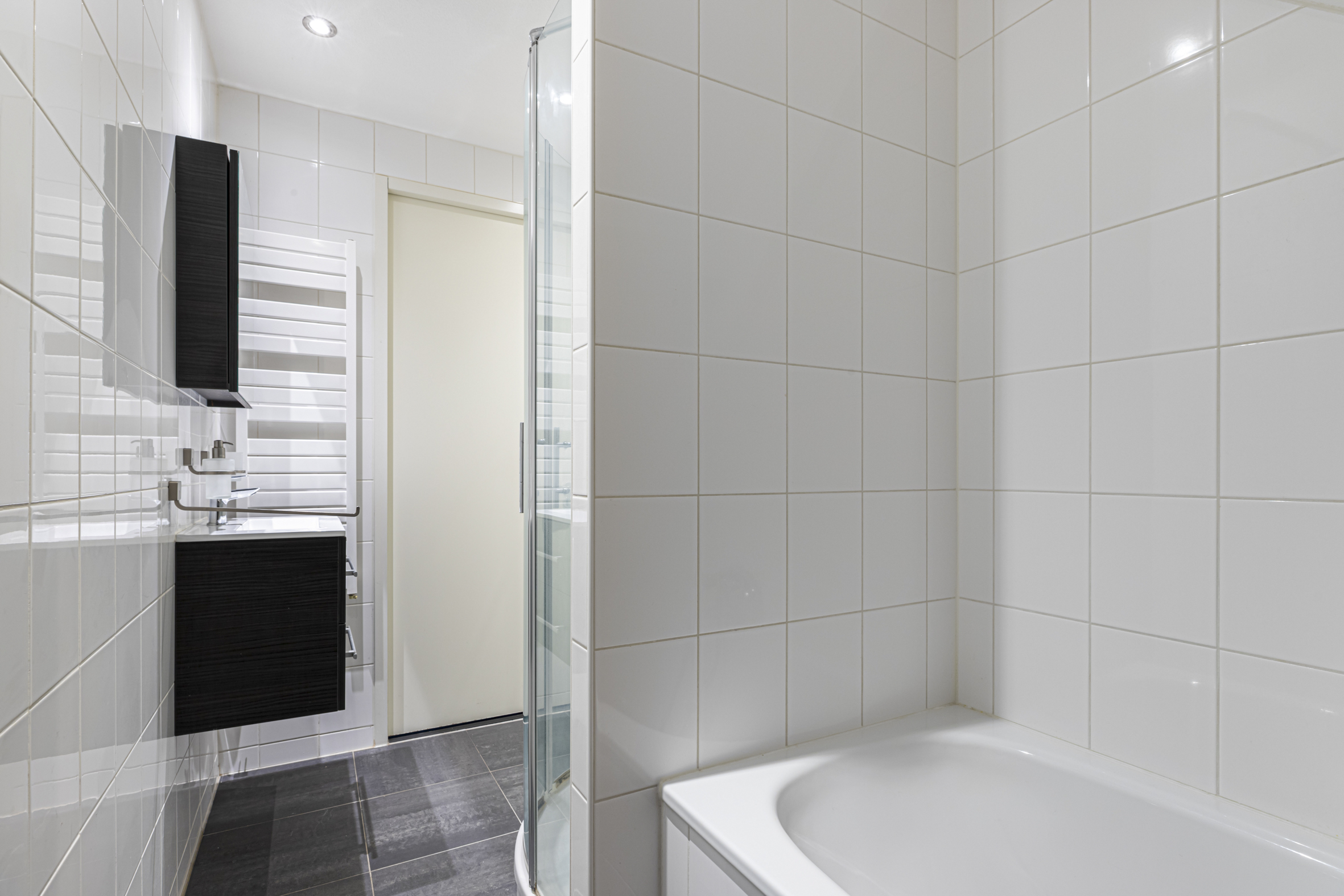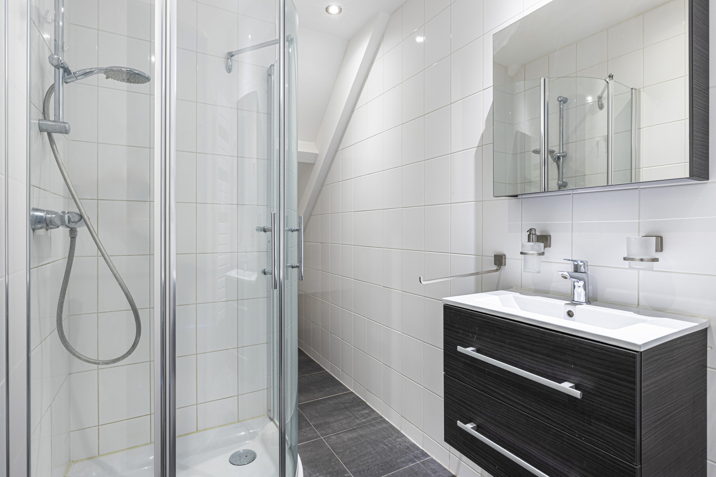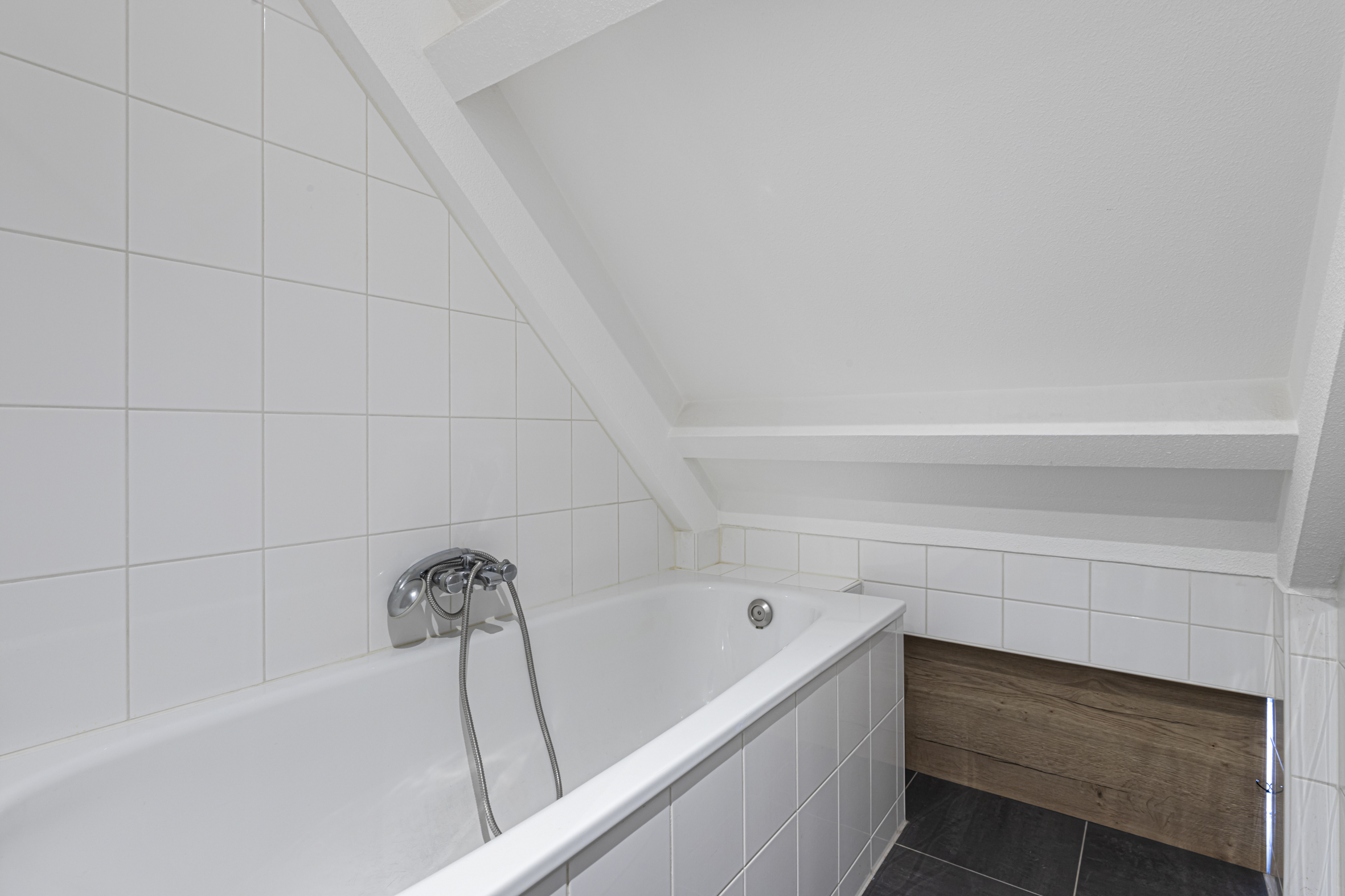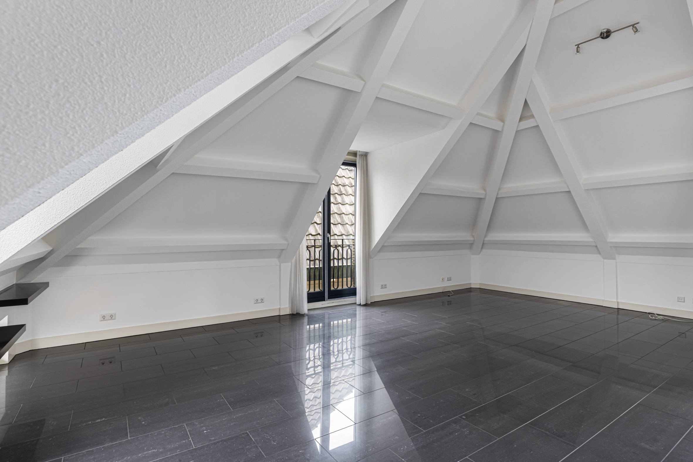 De master bedroom bevindt zich aan de voorzijde van het appartement en beschikt eveneens over een dakkapel met openslaande deuren en Frans balkon. In de hal vind je daarnaast de toegang tot de meterkast, een vaste kast met de installaties, de separate toiletruimte, de tweede slaapkamer en de badkamer. De tweede slaapkamer heeft een mooi formaat en is weer heerlijk licht. De badkamer is volledig betegeld en compleet uitgevoerd met een douche, ligbad, wastafelmeubel met spiegelkast en een handdoekenradiator.