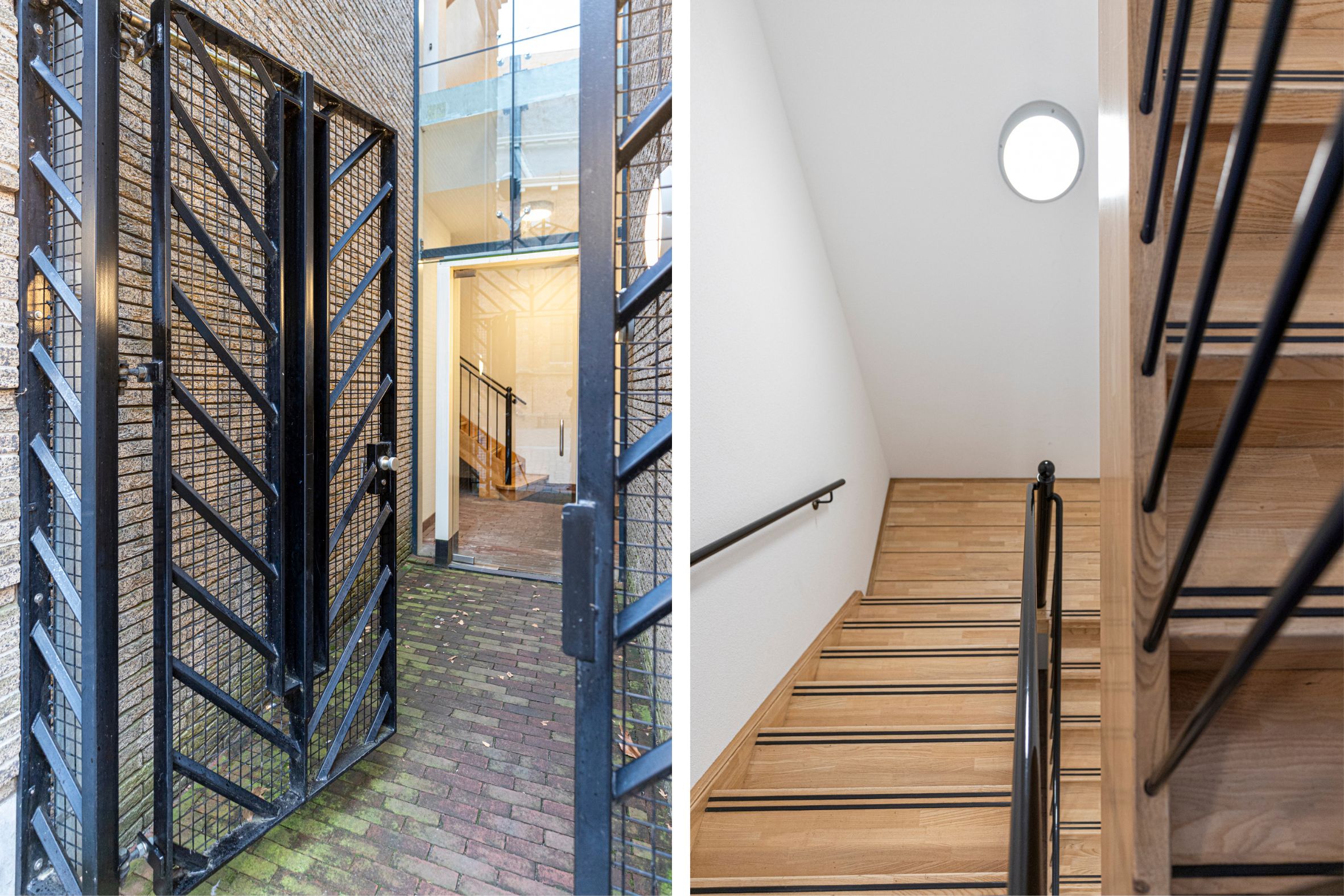 De entree bevindt zich aan het Kerkplein met een afgesloten poort en een bellentableau met videofooninstallatie. Via de lift of de trappen is de voordeur op de tweede verdieping bereikbaar.